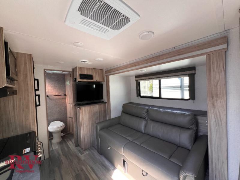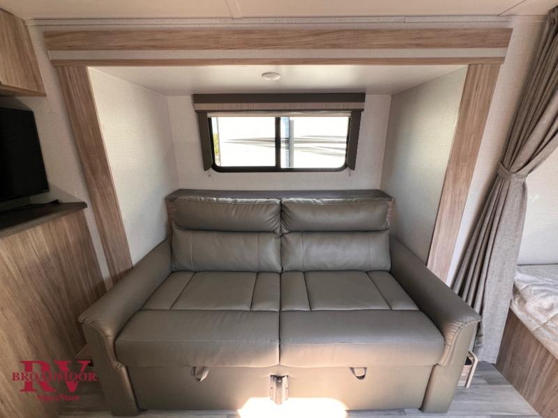 Come see just how accommodating this travel trailer can be! The two 32" x 74" twin beds up front have a nightstand in between them and a divider curtain to draw, plus they can convert into one 74" x 82" king bed. The 44" x 72" booth dinette slide can also convert into an extra sleeping space when you're not using it to eat your meals at or play games. Everyone can get squeaky clean in the full rear bathroom and the wardrobe is a convenient place to store your linens and extra clothes. Grab a snack from the kitchen pantry or pop a bag of popcorn in the microwave then watch a movie on the LED TV or head outdoors and relax underneath the power awning while your favorite tunes play through the patio speakers!