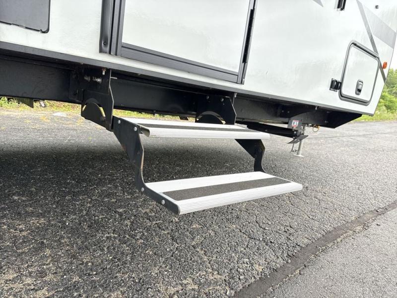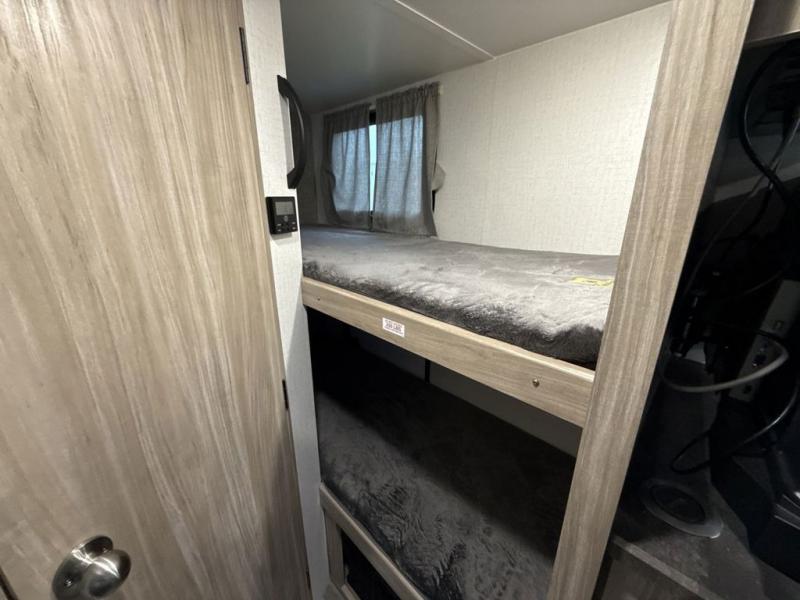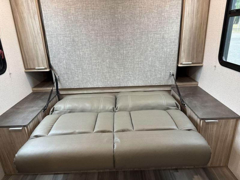 Load your kids into this travel trailer and experience a fun family getaway! The front Murphy bed offers versatile living by transforming into a 54" x 74" bed to sleep on at night and a sofa to sit on while socializing with the chef cooking at the three burner cooktop. The 44" x 72" booth dinette slide is a great place to eat your meals at, play games as a family, and even transform into an extra sleeping space if your kids want a friend to tag along. The kids will love sleeping on the rear corner 28" x 72" bunk beds and having the rear corner bathroom right next to them. As if that wasn't enough, there is an exterior pack-n-play door, a power awning with LED lighting, and patio speakers to crank up the tunes!