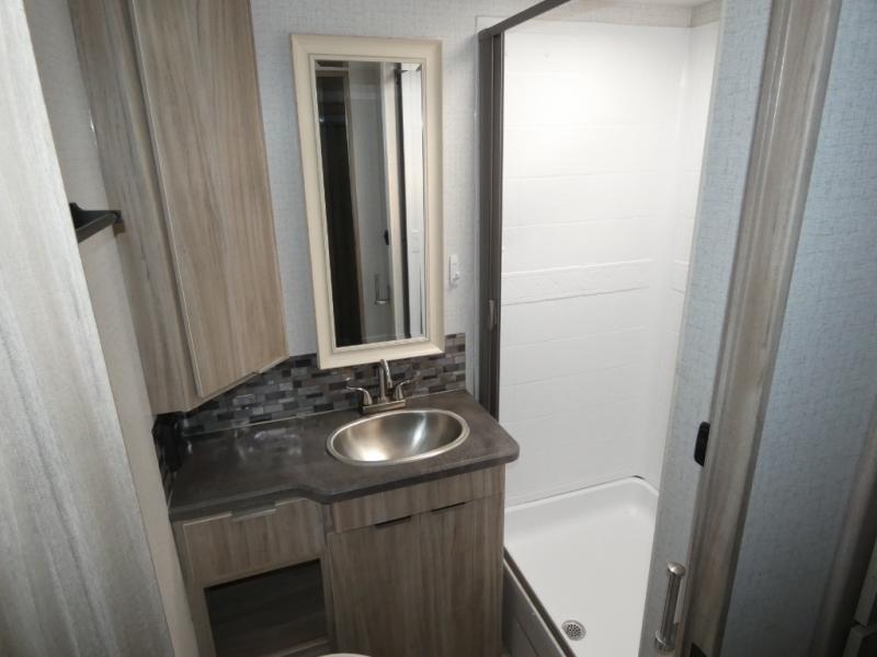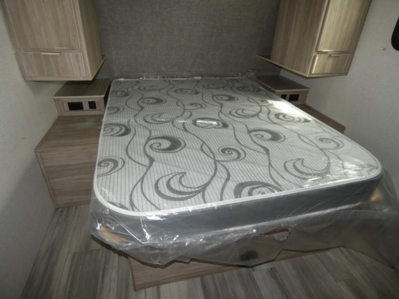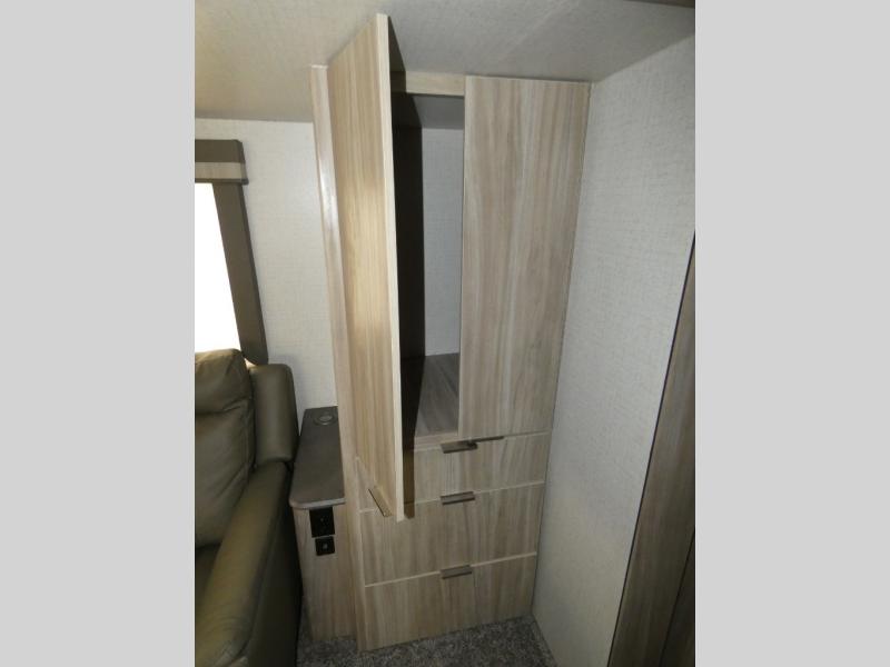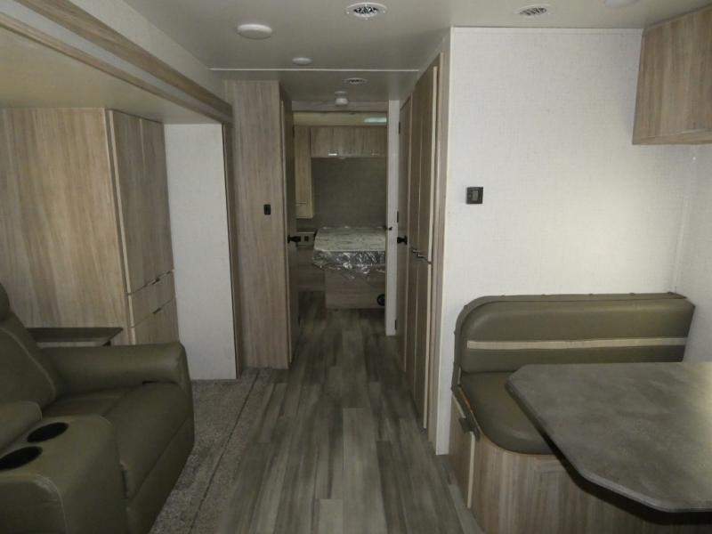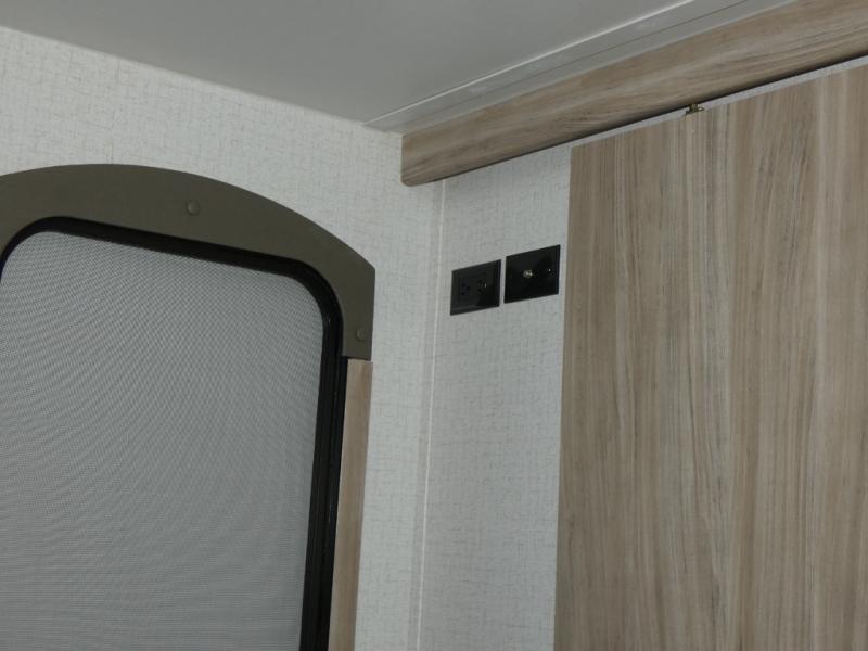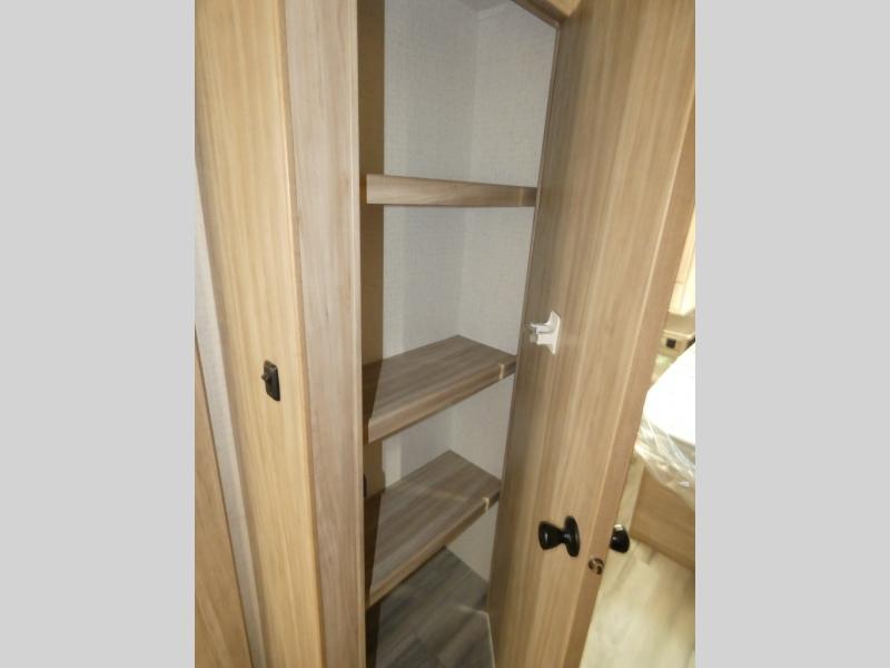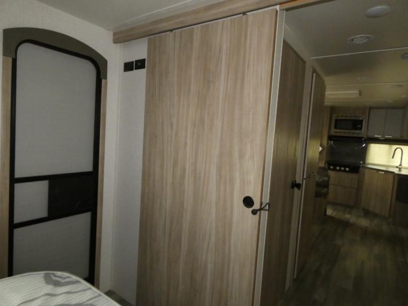 Looking to have sleeping space for your family of five, plus a spacious living area and plenty of storage for everyone's clothing, and enjoy the outdoors just steps away? Look no further, step inside this dual entry trailer for a weekend of memories inside and outside. The rear kitchen allows you to grab a drink from the 10.3 cu. ft. refrigerator or choose the 8 cu. ft. gas/electric option, and a snack from the pantry as you head outside to relax under the power awning with LED lighting. Just grab your camping chairs from the exterior storage. When you have explored outdoors, head back inside to get cleaned up in the full bathroom and fall quickly asleep in your own private bedroom with a sliding door that saves on space. The walk-around queen bed and second exterior entry plus dual wardrobes can be your retreat as the kiddos sleep on the furniture in the main living area.