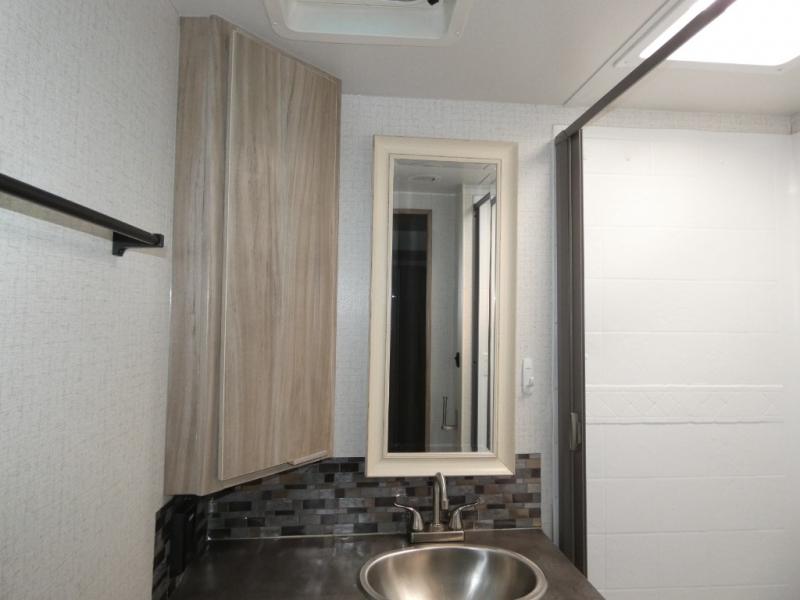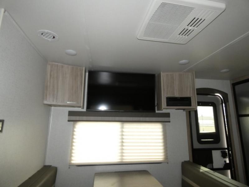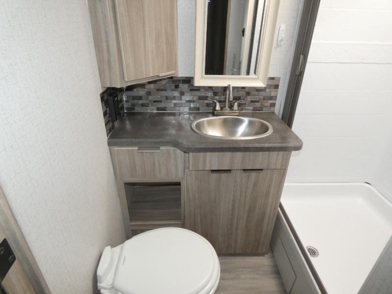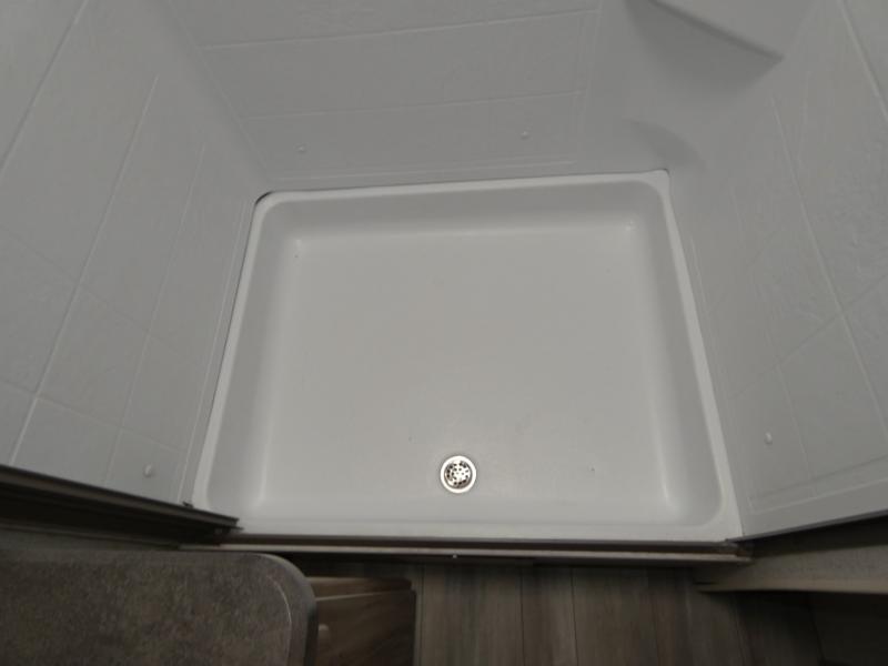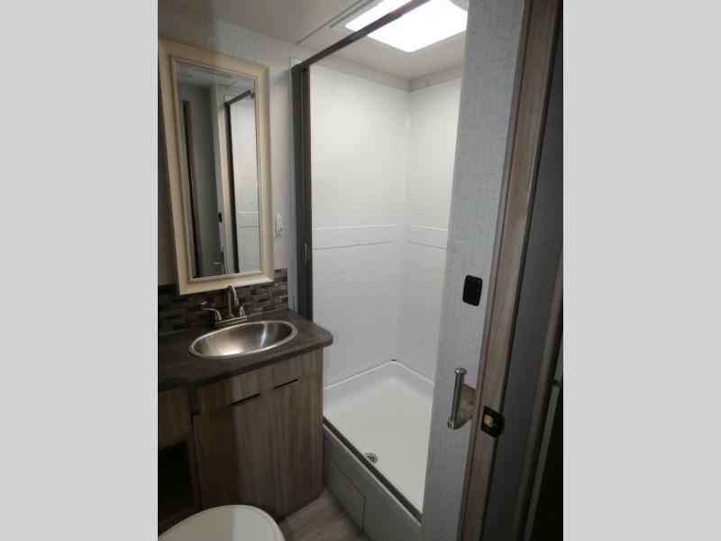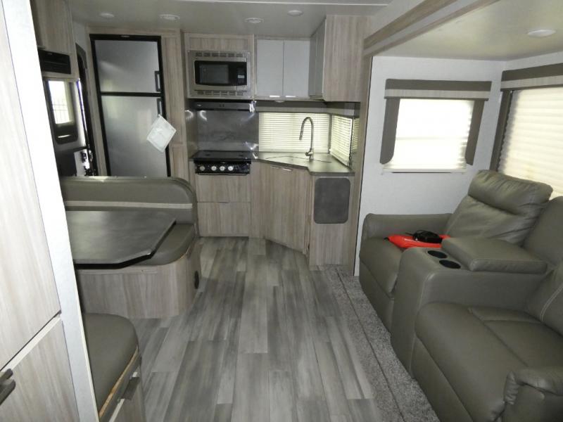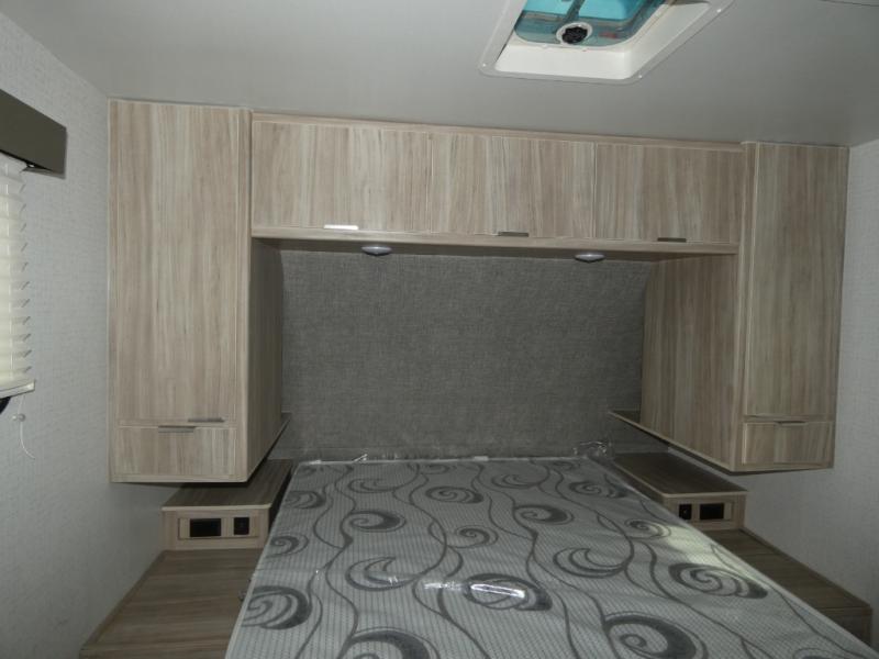 Looking to have sleeping space for your family of five, plus a spacious living area and plenty of storage for everyone's clothing, and enjoy the outdoors just steps away? Look no further, step inside this dual entry trailer for a weekend of memories inside and outside. The rear kitchen allows you to grab a drink from the 10.3 cu. ft. refrigerator or choose the 8 cu. ft. gas/electric option, and a snack from the pantry as you head outside to relax under the power awning with LED lighting. Just grab your camping chairs from the exterior storage. When you have explored outdoors, head back inside to get cleaned up in the full bathroom and fall quickly asleep in your own private bedroom with a sliding door that saves on space. The walk-around queen bed and second exterior entry plus dual wardrobes can be your retreat as the kiddos sleep on the furniture in the main living area.