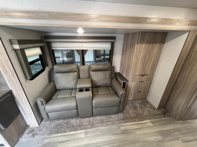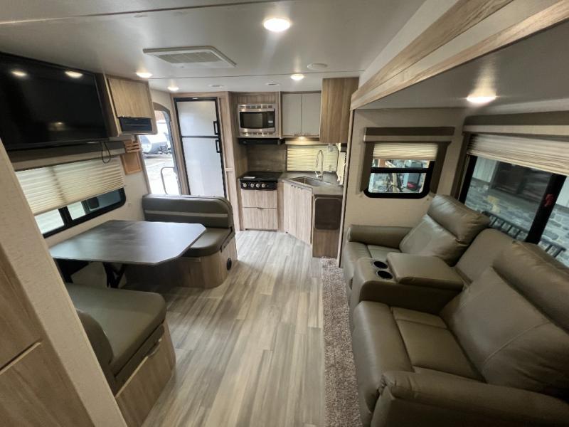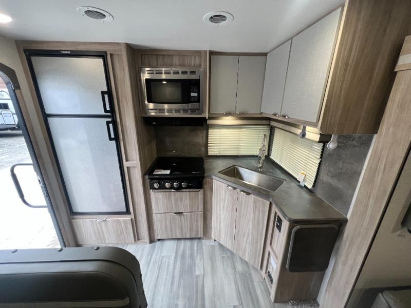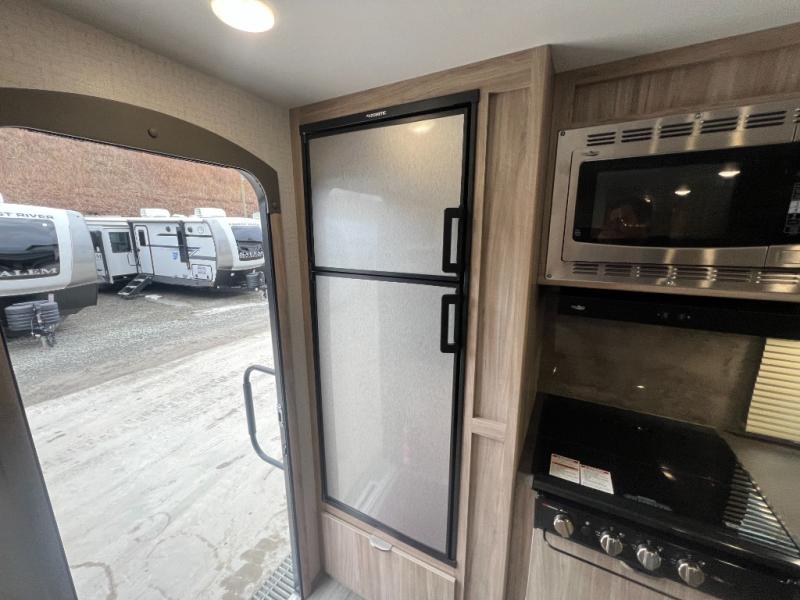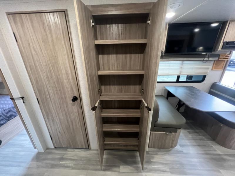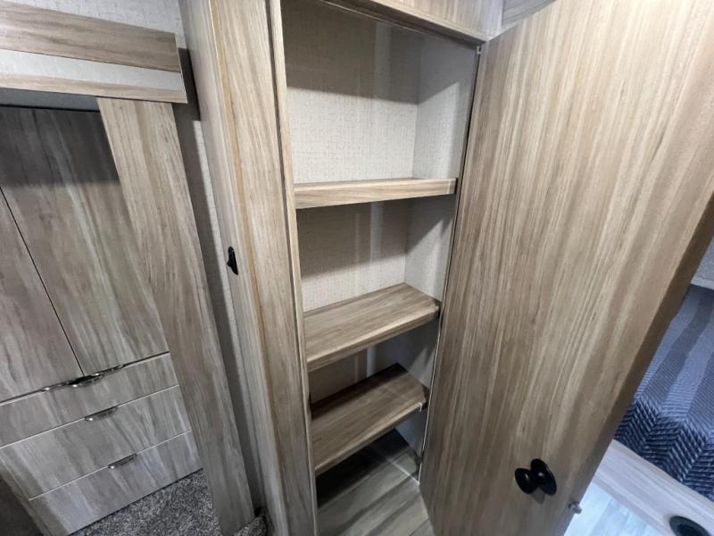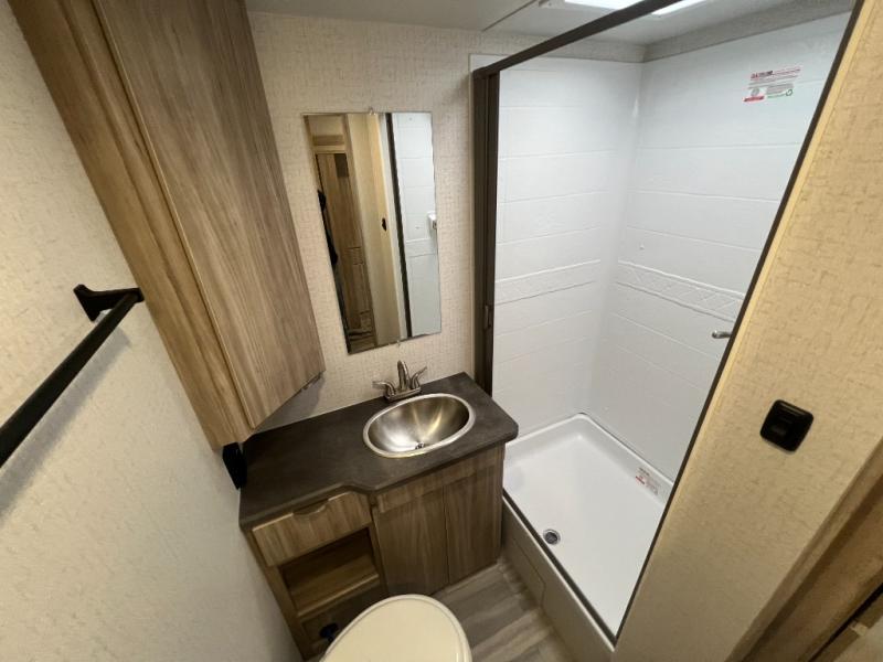 Looking to have sleeping space for your family of five, plus a spacious living area and plenty of storage for everyone's clothing, and enjoy the outdoors just steps away? Look no further, step inside this dual entry trailer for a weekend of memories inside and outside. The rear kitchen allows you to grab a drink from the 10.3 cu. ft. refrigerator or choose the 8 cu. ft. gas/electric option, and a snack from the pantry as you head outside to relax under the power awning with LED lighting. Just grab your camping chairs from the exterior storage. When you have explored outdoors, head back inside to get cleaned up in the full bathroom and fall quickly asleep in your own private bedroom with a sliding door that saves on space. The walk-around queen bed and second exterior entry plus dual wardrobes can be your retreat as the kiddos sleep on the furniture in the main living area.