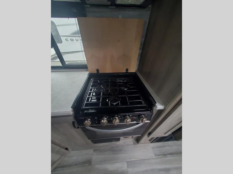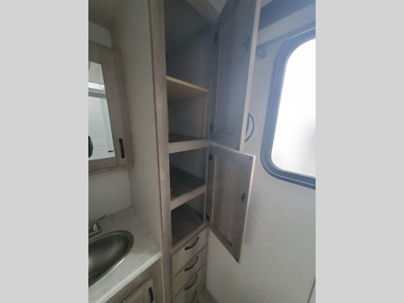 This Voyage travel trailer has an excellent layout that will suit you nicely! First, there are two entry doors so that you can choose to either enter the front private bedroom or the main living area. When you choose to enter through the rear main entrance, you will be met with a walk-in pantry to your right and a full rear bathroom to your left. That makes it very convenient when you are coming in after a muddy adventure so that you don't track dirt all throughout the trailer. Within the main living area is a large slide that has a tri-fold sofa and booth dinette. You will love sitting back on these pieces of furniture while you watch the entertainment center across from you, and you can always get up and grab a little snack from the second pantry in the L-shaped kitchen.