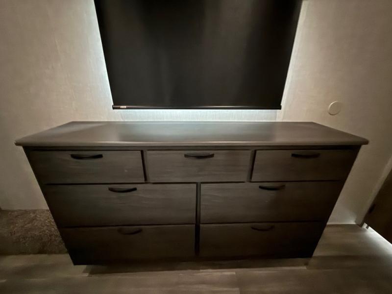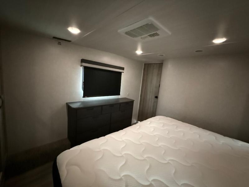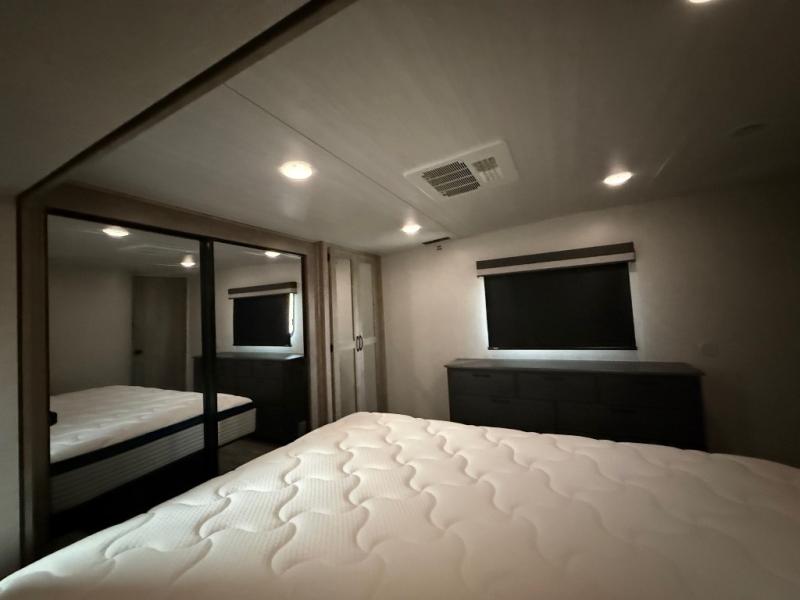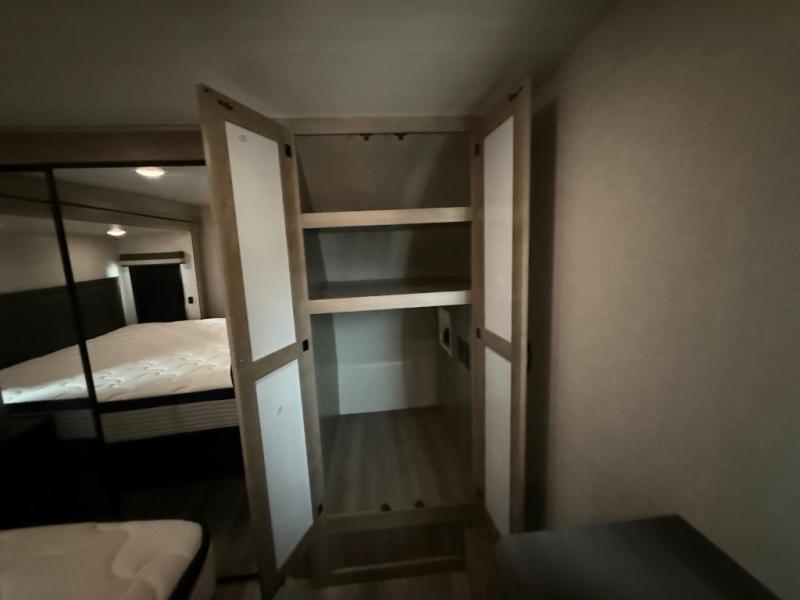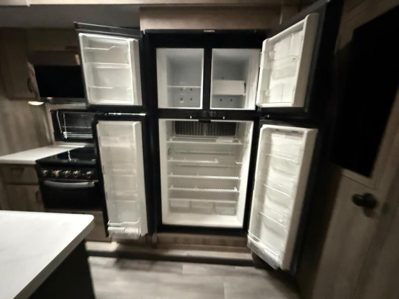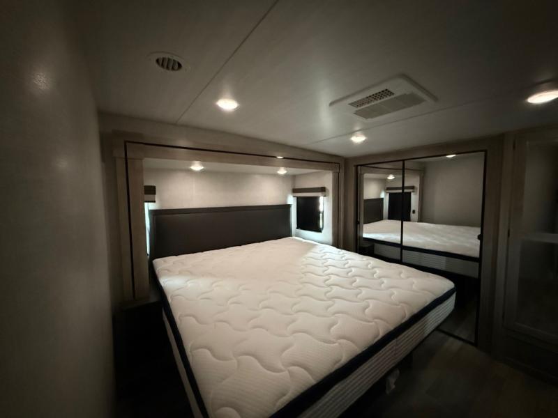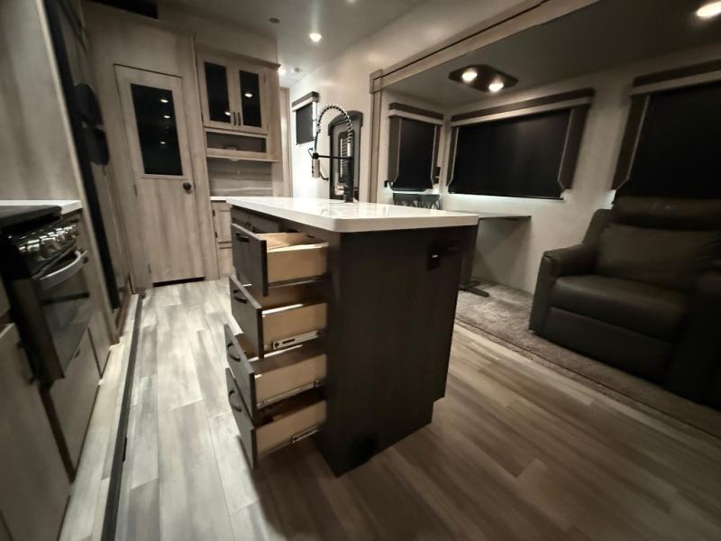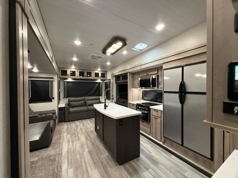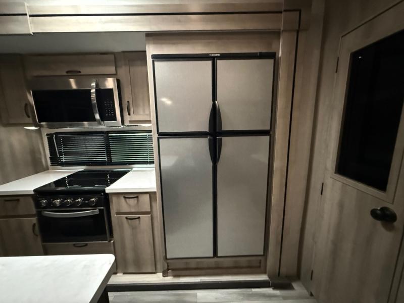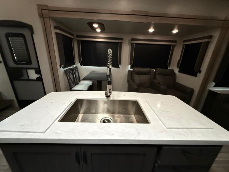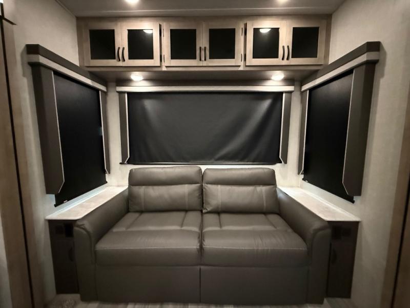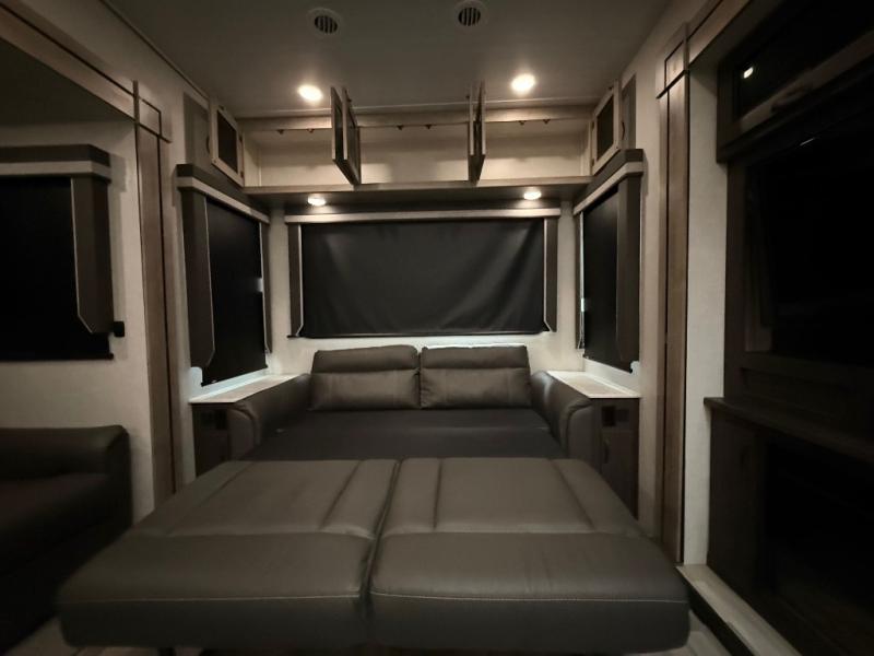 As you spend time lounging on the tri-fold sofa or in the theater seating on this Voyage fifth wheel, you'll be glad to have extra living space because of the opposing slides! You can keep your meals simple, or you can make all of the family favorites with the recessed three-burner cooktop, convection microwave, and 10.3-cubic foot refrigerator. Then, you can sit down with that meal at the free-standing table with chairs. Clean up the dishes like a pro using the high-rise pull-out faucet in the sink on the kitchen island, and then reward yourself by watching your favorite show on the LED TV. When you need to get changed for bed, you can find your clothes in the dresser and full-width wardrobe within the front bedroom.