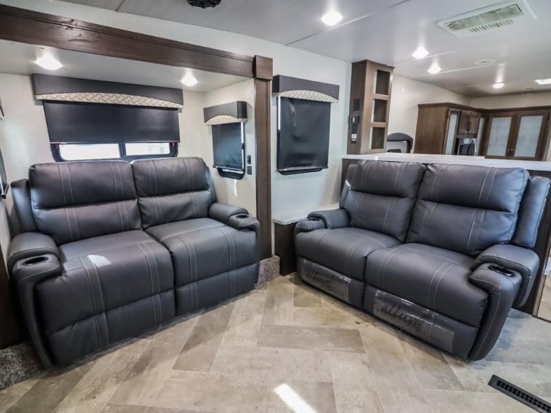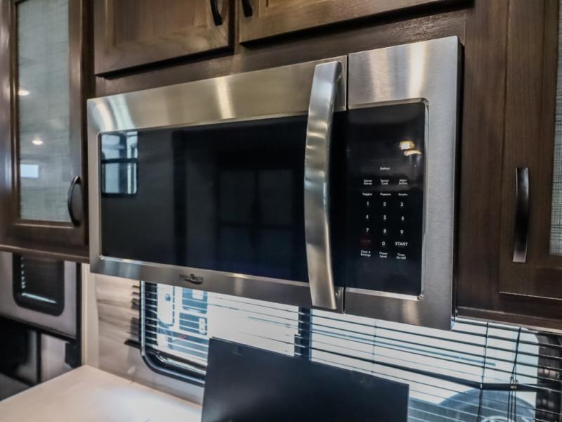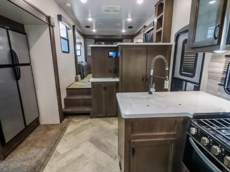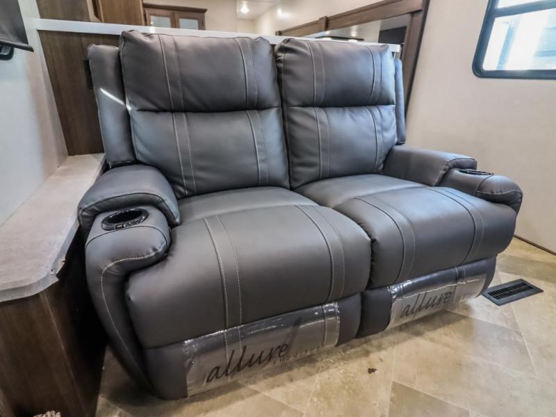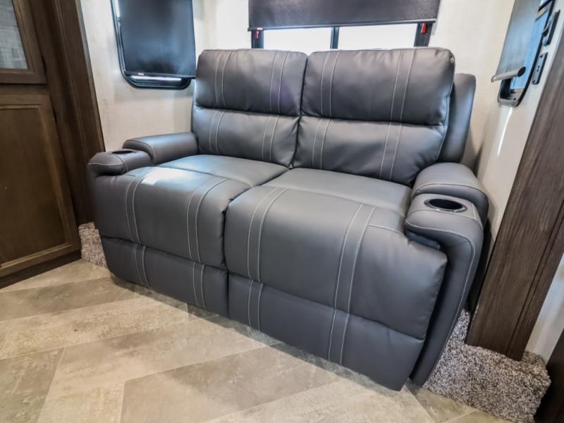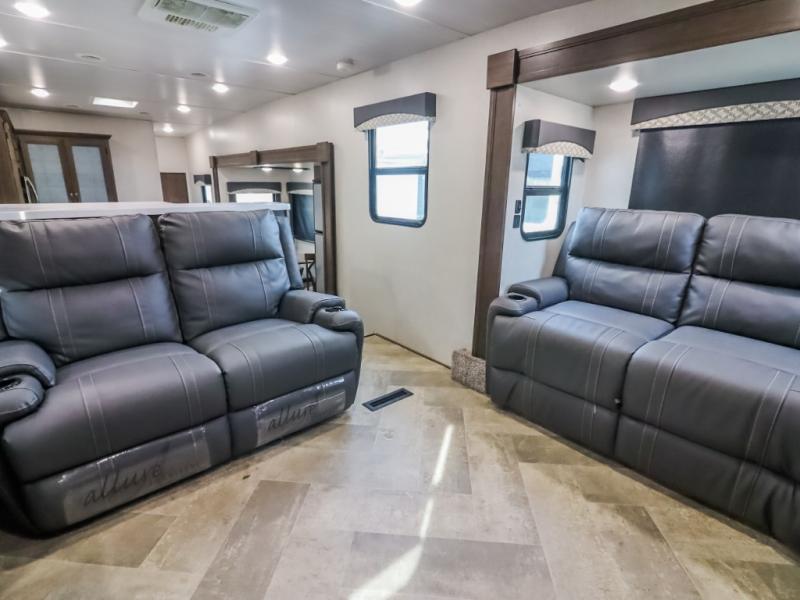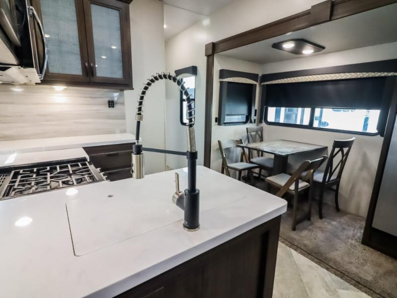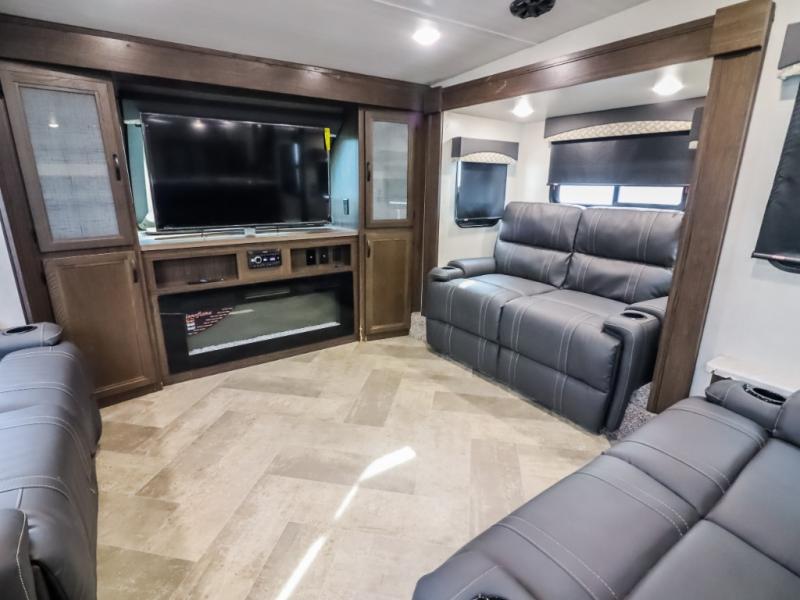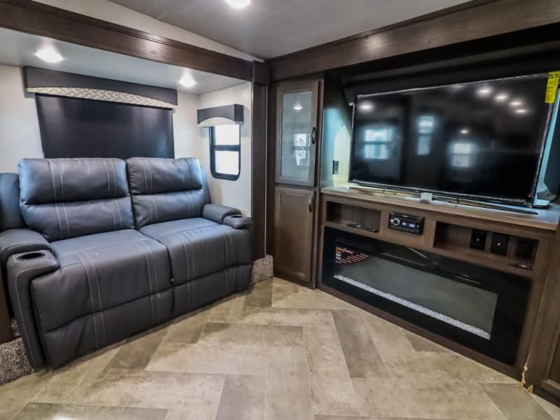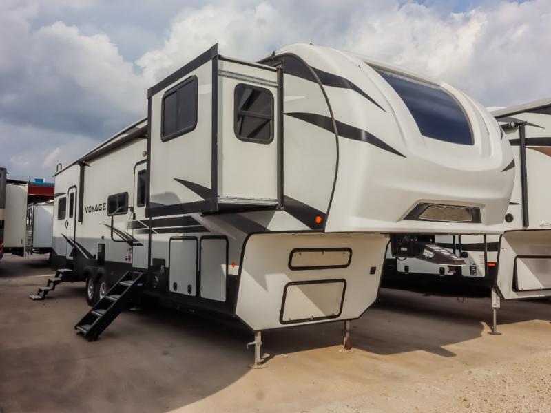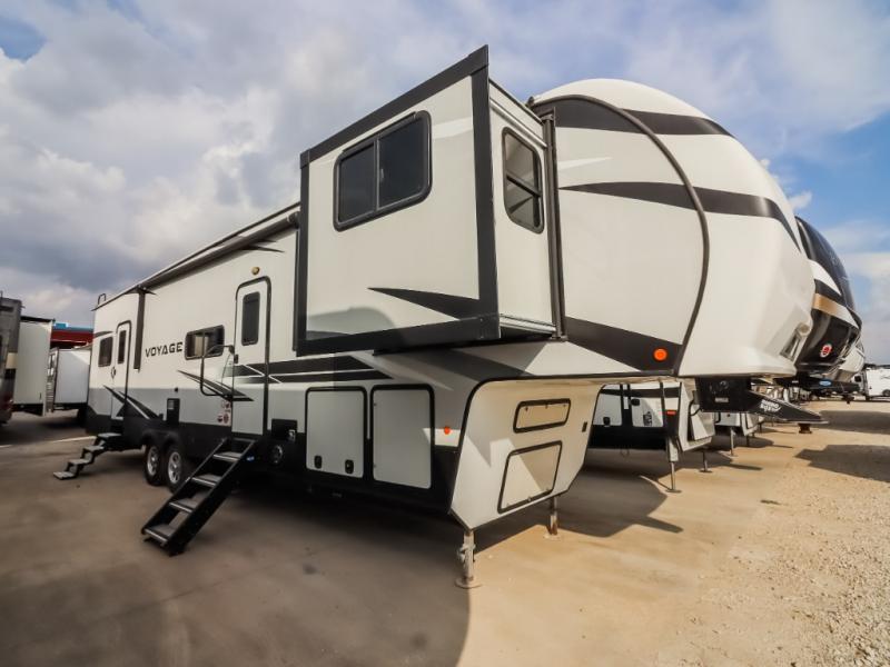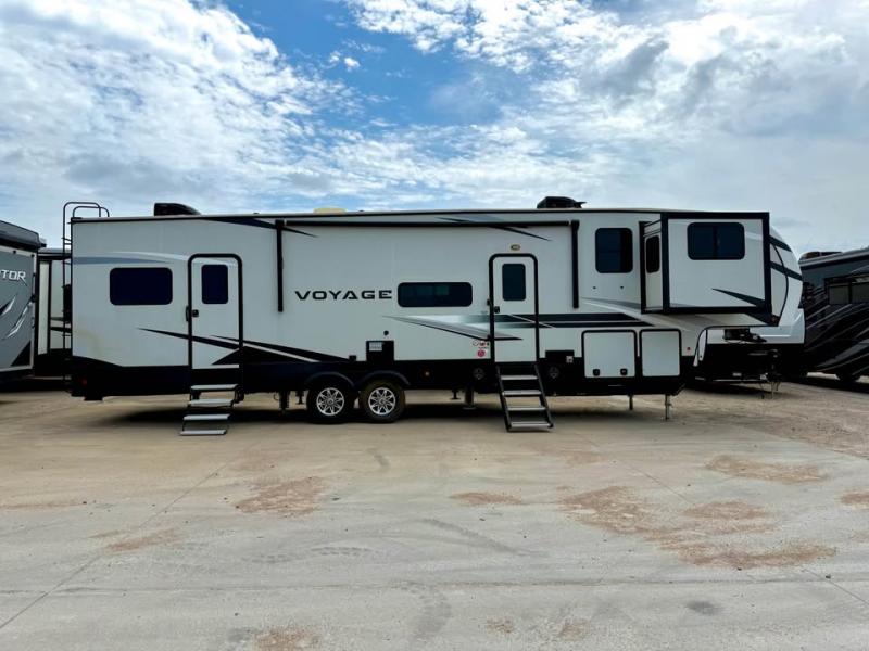 You can take excellent adventures with this Voyage fifth wheel! The separate living room up front is going to feel just like home with its front entertainment center, theater seating, and opposing sofa slides. Right behind the living room is the kitchen which has two pantries, an entryway closet, a desk, a slide out, and a free-standing table with chairs. The dual-entry bathroom has a large skylight above the shower, residential bath fixtures, and a large medicine cabinet with mirror. The queen bed slide has nightstands on either side as well as a private entrance into the bathroom and an exterior entrance.