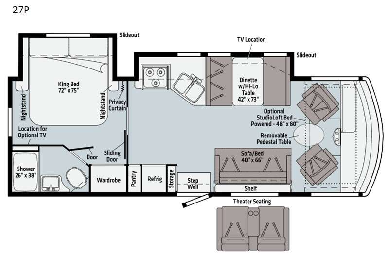 This can be the perfect couples coach or a family favorite! From the furniture that doubles as extra sleeping space as well as the optional StudioLoft bed, you can easily take the kids or grandkids with you! The master bedroom offers a privacy curtain as well as a slide out king-size bed with nightstands, and you can close the sliding door to make this a master suite with a corner bathroom for even more privacy. And the captain's seats swivel as well as slide and recline and there is a removable pedestal table for more dining space, and the cook will have full amenities include a 10 cu. ft. refrigerator to store extra beverages and cold items.