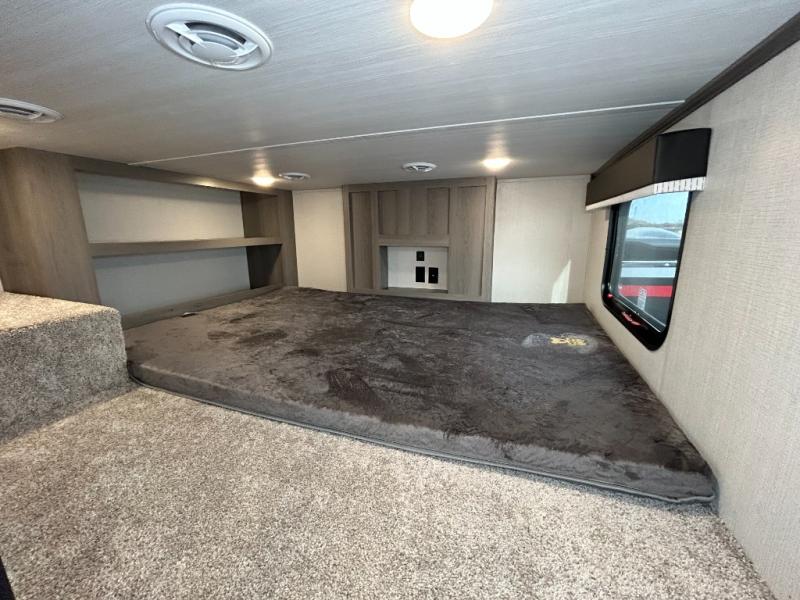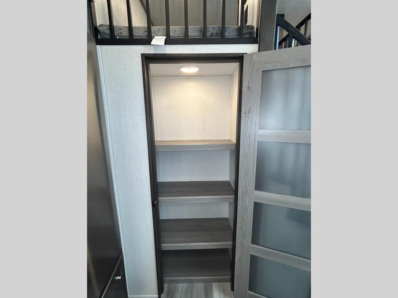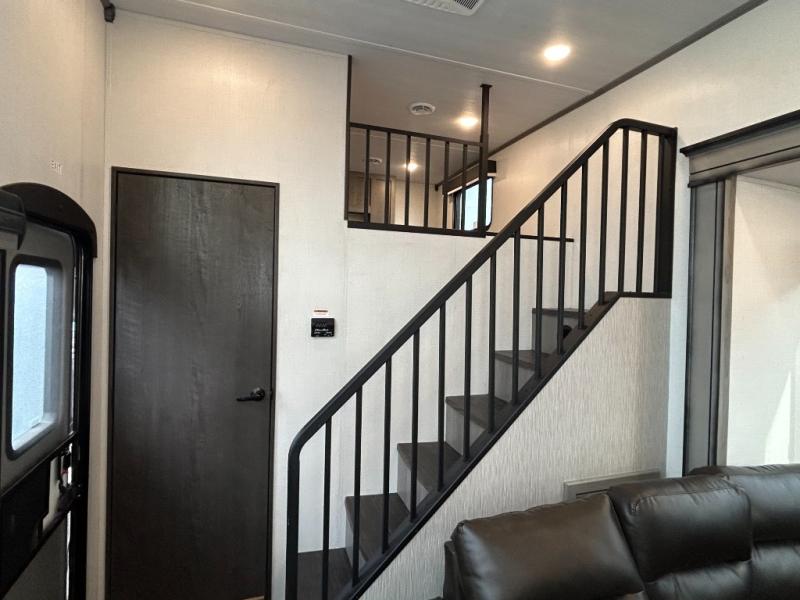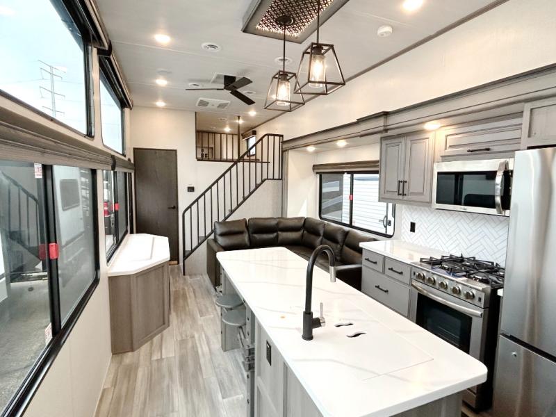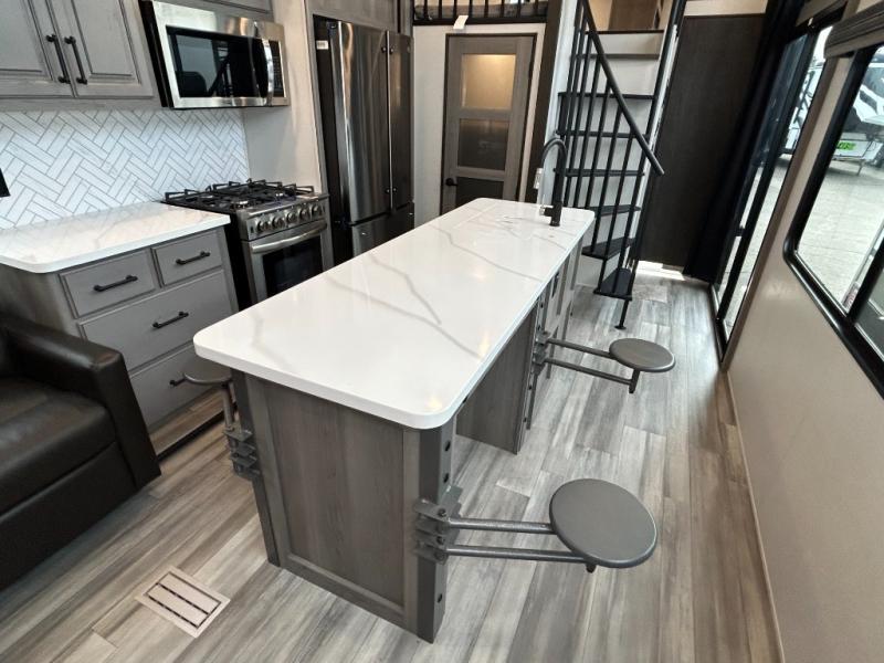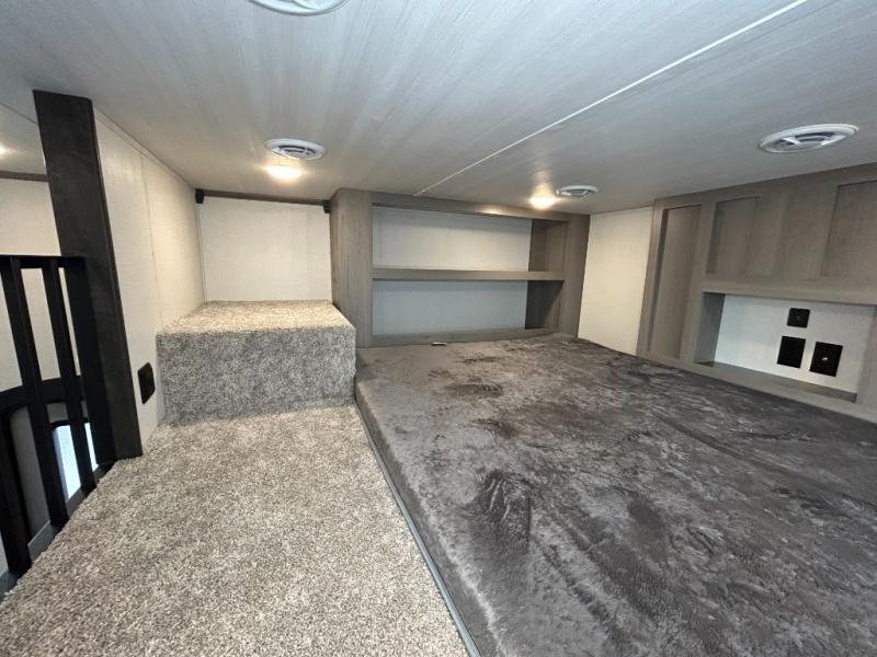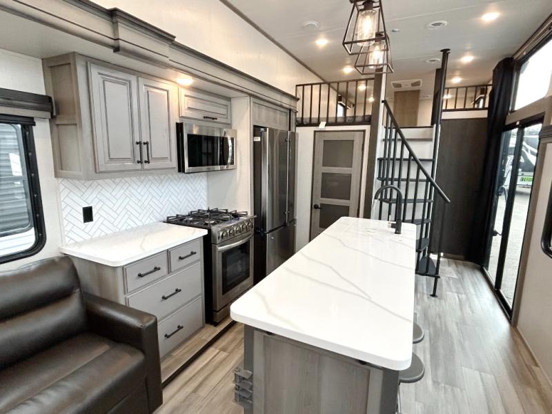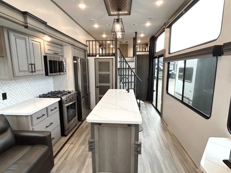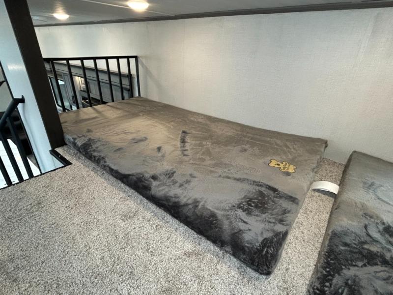 This destination trailer is so accommodating, you may just want to camp all year long! The owners will have the front bedroom all to themselves with a king bed slide out, dresser, and master closet so everything has a place. Above this room is the front loft with stairs that includes three 39" x 74" beds/sleeping spaces and storage shelves, making it perfect for little ones! The spacious full rear bath includes dual bath sinks, a large shower with a seat, and a closet with washer/dryer prep if you want to add these appliances. And just outside the bath, you'll find the second set of stairs that leads to the rear loft with a 54" x 81" bed, an entertainment center, and storage shelves for your guests. During the day, everyone can meet in the combined living area and kitchen that features a large slide for more space, a sectional sofa, a kitchen island with four barstools, plus an entertainment center with a fireplace!