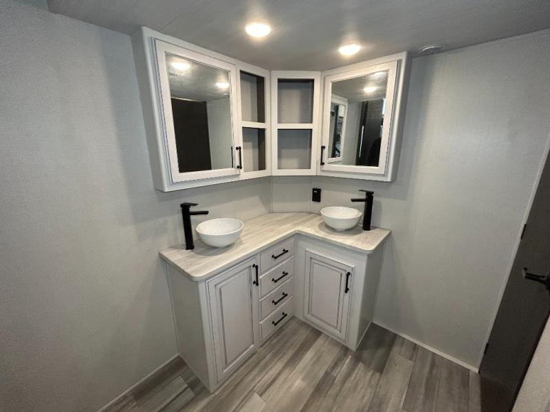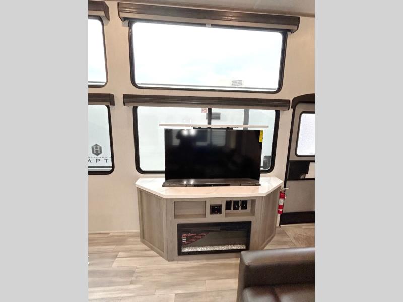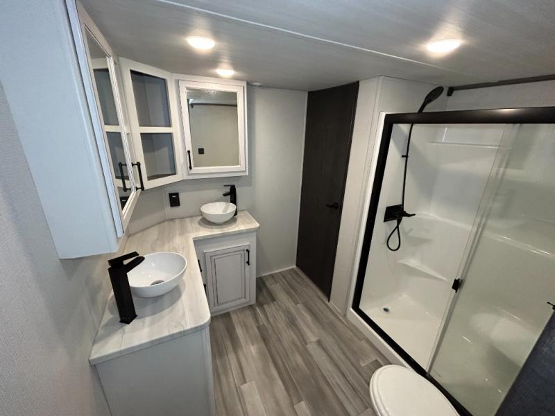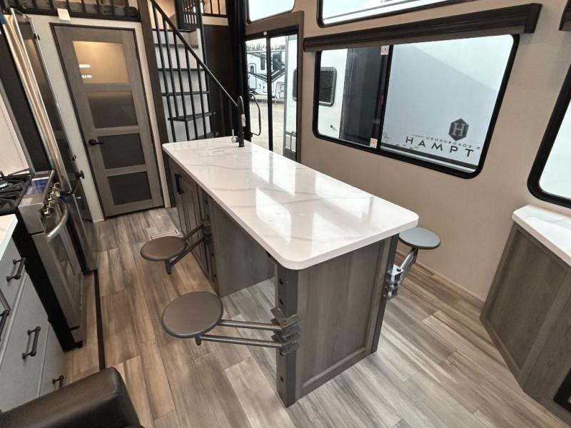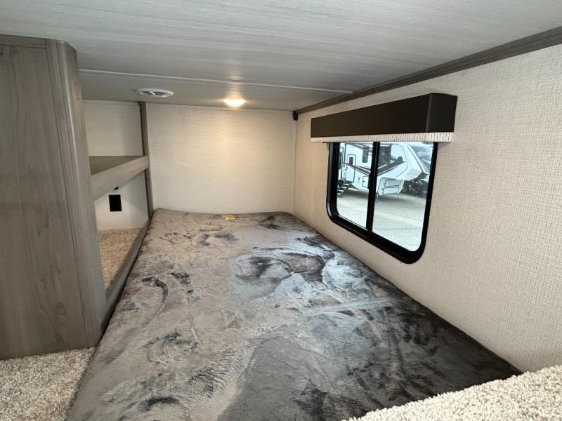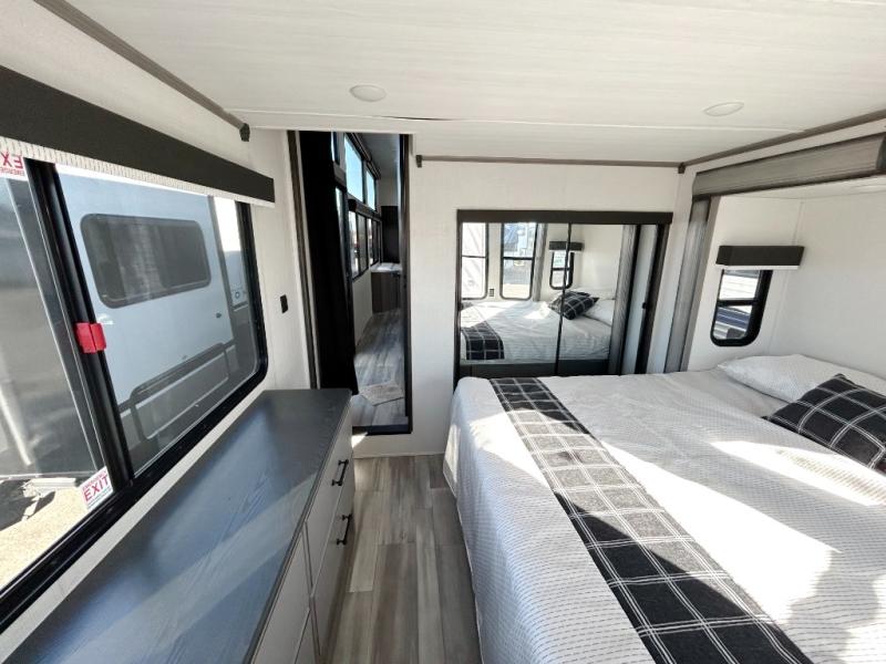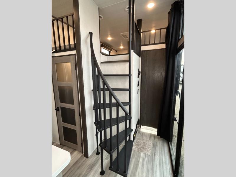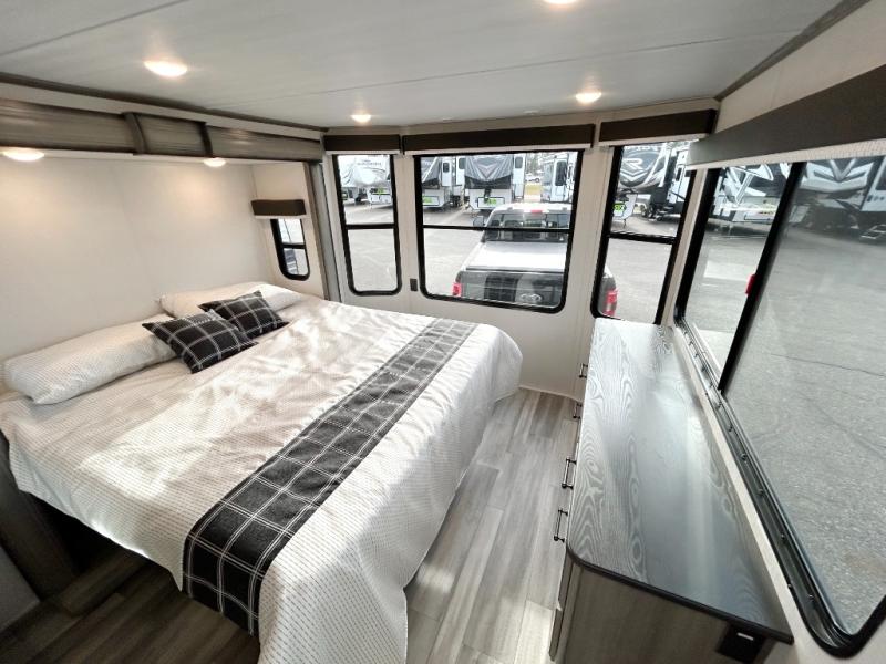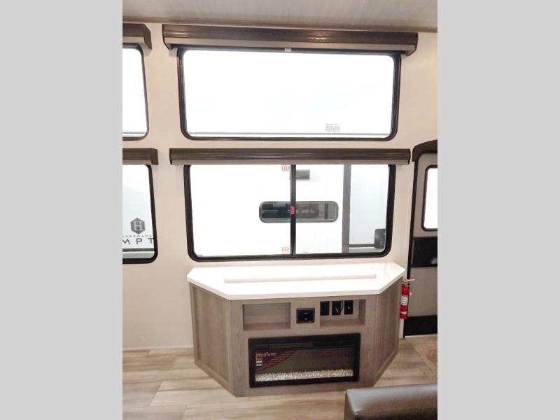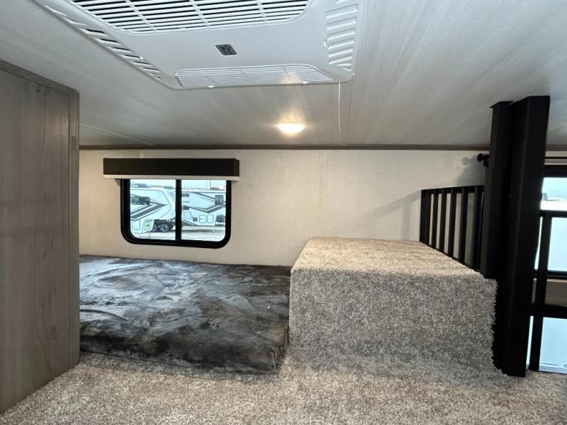 This destination trailer is so accommodating, you may just want to camp all year long! The owners will have the front bedroom all to themselves with a king bed slide out, dresser, and master closet so everything has a place. Above this room is the front loft with stairs that includes three 39" x 74" beds/sleeping spaces and storage shelves, making it perfect for little ones! The spacious full rear bath includes dual bath sinks, a large shower with a seat, and a closet with washer/dryer prep if you want to add these appliances. And just outside the bath, you'll find the second set of stairs that leads to the rear loft with a 54" x 81" bed, an entertainment center, and storage shelves for your guests. During the day, everyone can meet in the combined living area and kitchen that features a large slide for more space, a sectional sofa, a kitchen island with four barstools, plus an entertainment center with a fireplace!