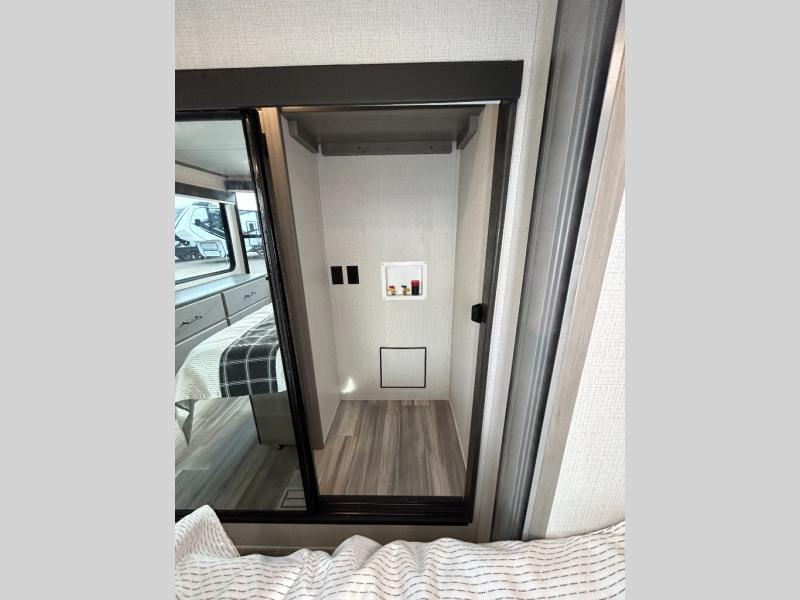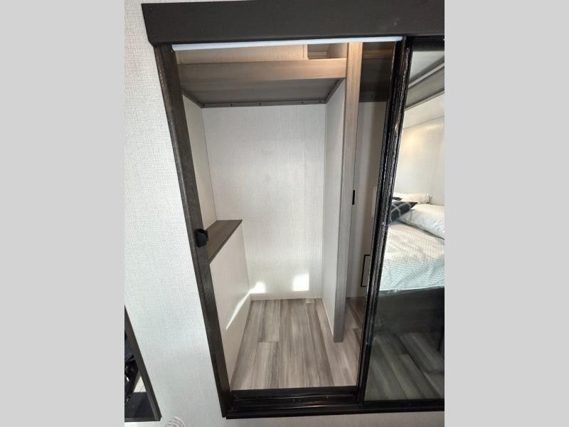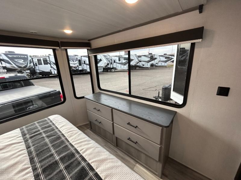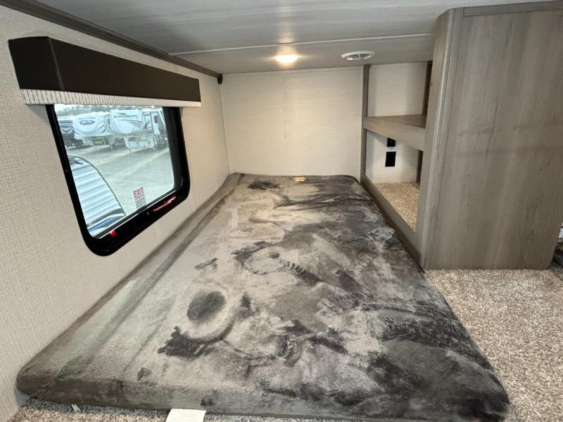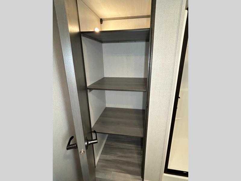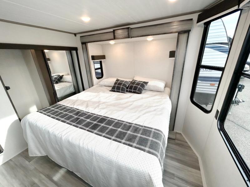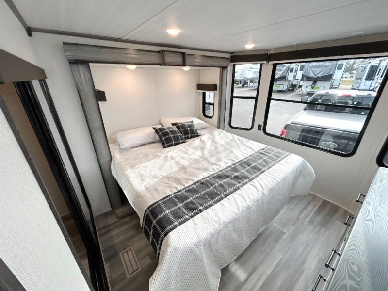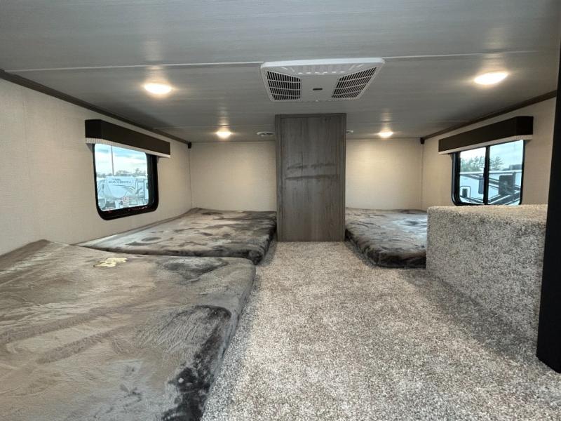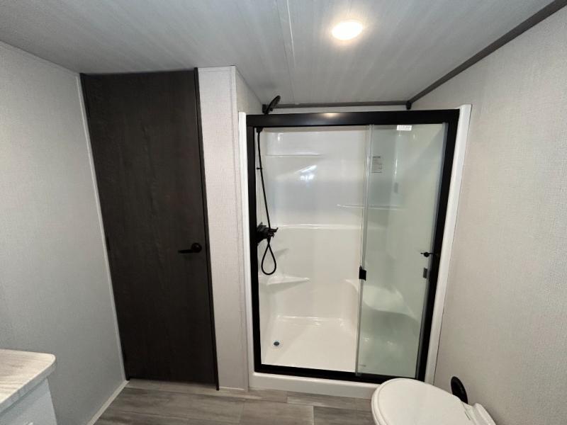 This destination trailer is so accommodating, you may just want to camp all year long! The owners will have the front bedroom all to themselves with a king bed slide out, dresser, and master closet so everything has a place. Above this room is the front loft with stairs that includes three 39" x 74" beds/sleeping spaces and storage shelves, making it perfect for little ones! The spacious full rear bath includes dual bath sinks, a large shower with a seat, and a closet with washer/dryer prep if you want to add these appliances. And just outside the bath, you'll find the second set of stairs that leads to the rear loft with a 54" x 81" bed, an entertainment center, and storage shelves for your guests. During the day, everyone can meet in the combined living area and kitchen that features a large slide for more space, a sectional sofa, a kitchen island with four barstools, plus an entertainment center with a fireplace!