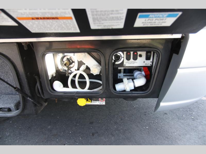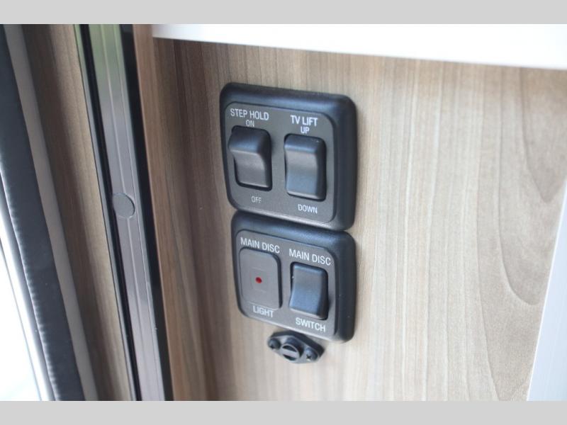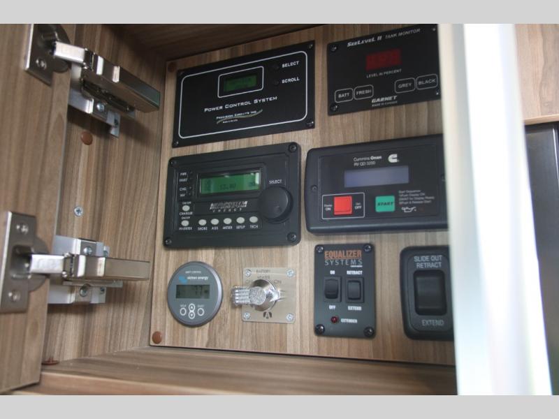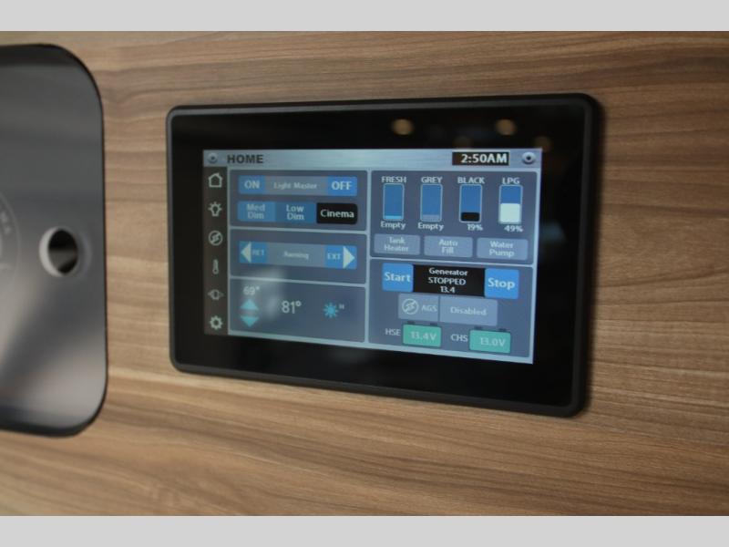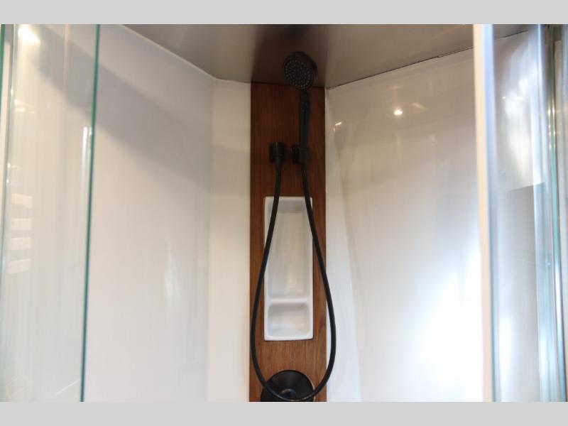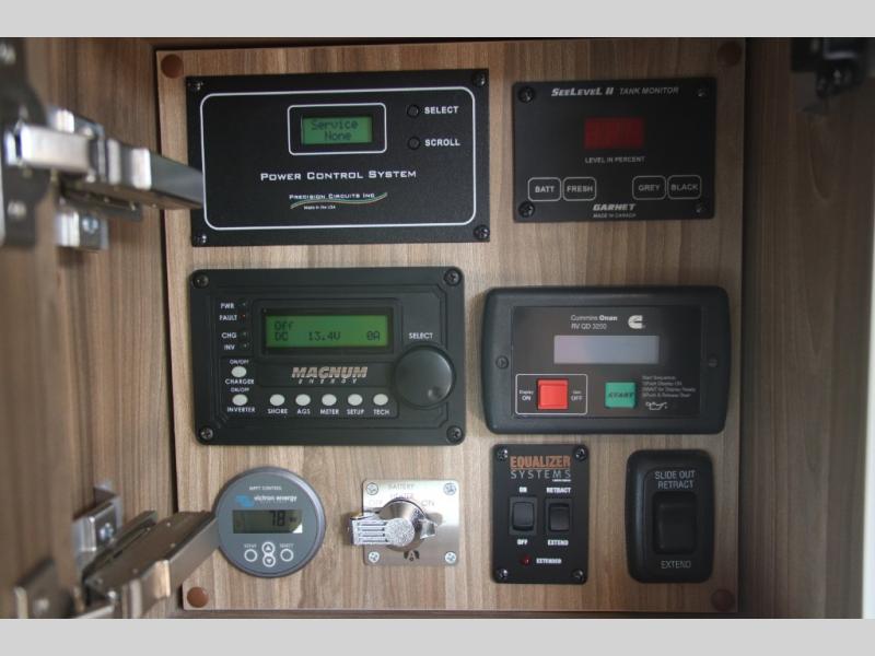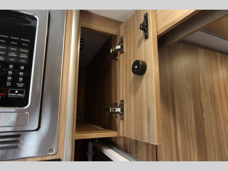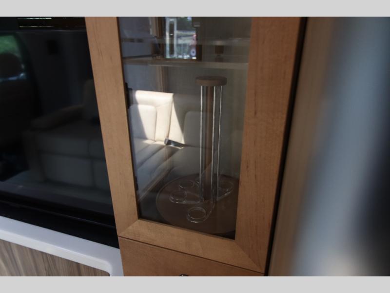 Get ready to explore, unwind and "glamp" where ever you decide! This coach brings you everything you will need, plus much much more! The power slide offers a Murphy suite that retracts and fits seamlessly with the luxury automotive body style. With a touch of a button on the multiplex control panel, you will have more floor space to relax on the reclining sofa that includes two seatbelts or pull down the Murphy bed at night. There is more seating on the captain's chairs that swivel around to face the interior, and there are two tables that adjust to different heights for your needs. The kitchen provides a two-burner gas stove and large stainless steel Kohler sink and faucet, and there is a convection microwave, a slide-out pantry and a refrigerator with freezer a few steps away.