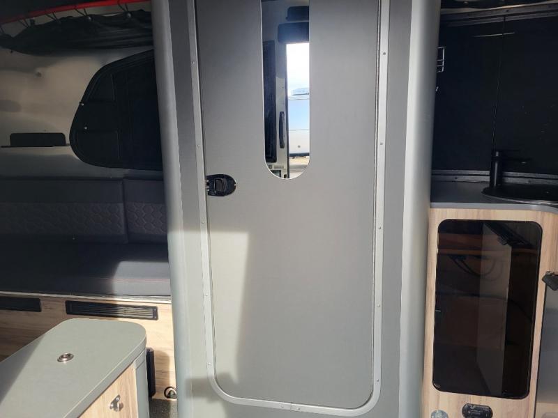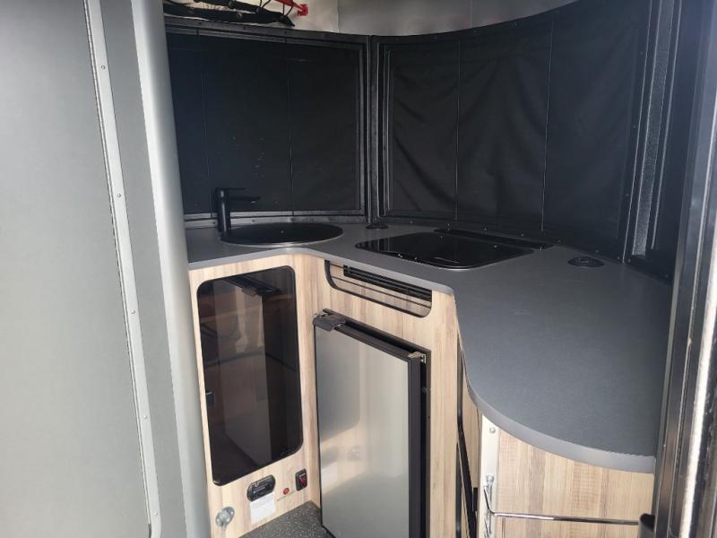 Looking for three extra inches of road clearance in an aerodynamic and easy to tow trailer? This 16X includes a black shadow window design, Goodyear all-terrain tires, solar front window protection, and stainless steel rock guards for protection against road debris. You can sleep two on the split benches or convert the half-bed on one side and the full bed that spans the back of the trailer. The two tables with benches allow you to dine with seating for five, surf the web, read a book and you can store the tables under the cushions. Get cleaned up in the wet bath complete with a shower, toilet and sink. And the cook will love the views while using the two-burner gas stove, sink and refrigerator. This Basecamp also offers front panoramic windows, storage above the propane tanks, solar panel input, and a rear hatch allowing you to take your snowboards, skis, paddleboards and/or kayaks, plus an exterior shower and optional solar panels, plus more!