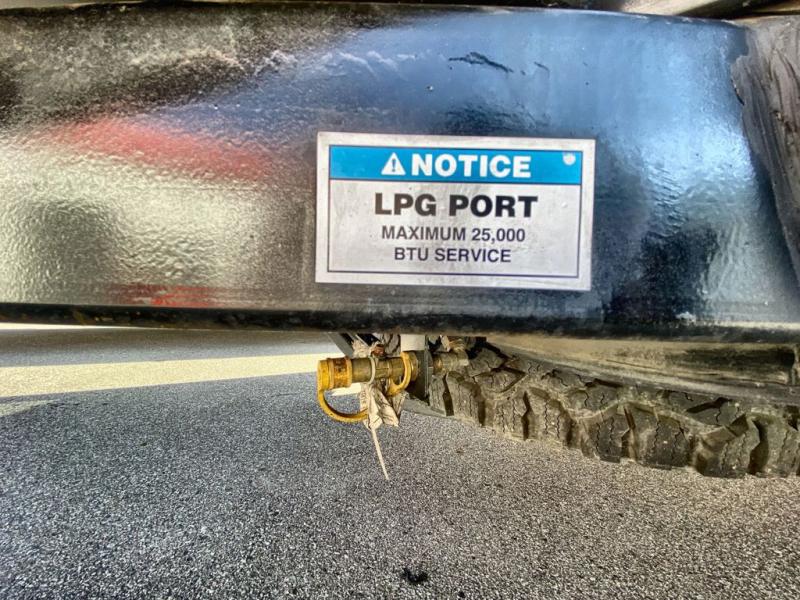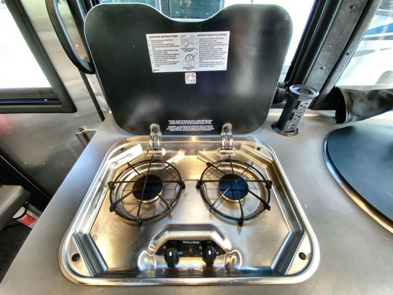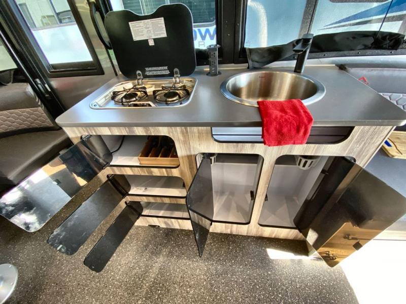 toilet so you can rinse off from a day outdoors, the galley kitchen gives the cook a place to make warm meals and store drinks and leftovers. This Basecamp also offers front panoramic windows, storage above the propane tanks, solar panel input, and a steel entry step. There is also a full-size spare tire, cast aluminum LED tail light and a rear hatch allowing you to take your snowboards, skis, paddleboards and/or kayaks, plus an exterior shower and optional solar panels.