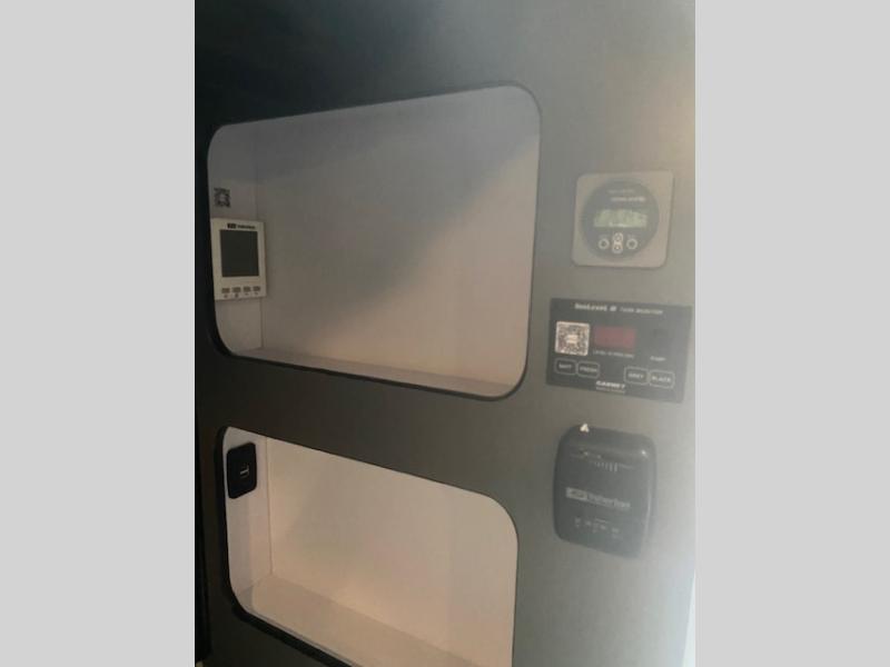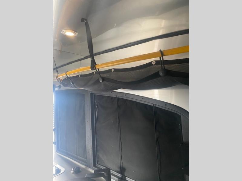 toilet so you can rinse off from a day outdoors, the galley kitchen gives the cook a place to make warm meals and store drinks and leftovers. This Basecamp also offers front panoramic windows, storage above the propane tanks, solar panel input, and a steel entry step. There is also a full-size spare tire, cast aluminum LED tail light and a rear hatch allowing you to take your snowboards, skis, paddleboards and/or kayaks, plus an exterior shower and optional solar panels.