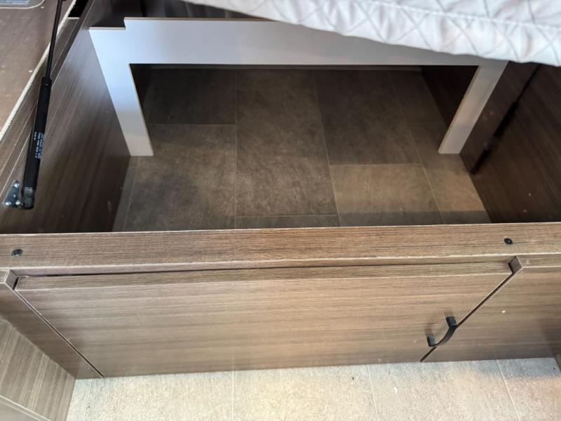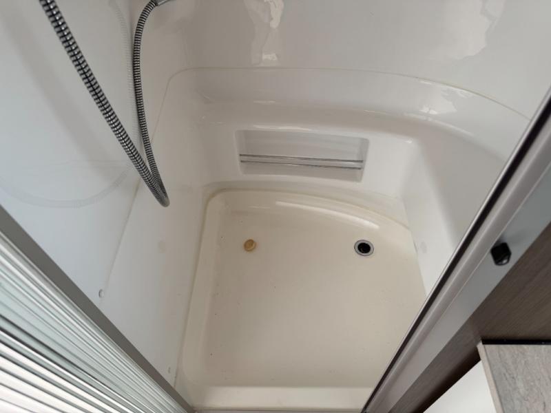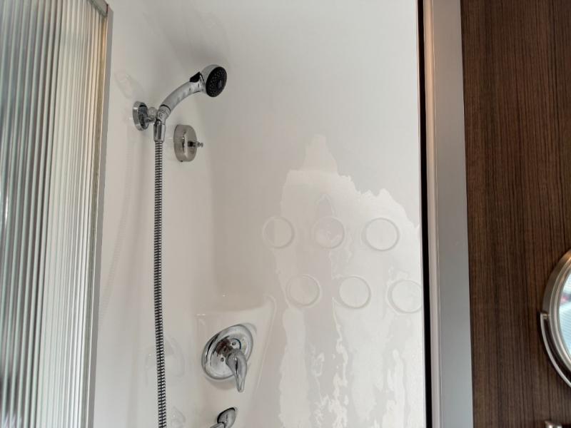 The pillowtop memory foam mattress fits perfectly into the curves of this Caravel travel trailer which offers you the perfect place to relax! There are panoramic windows surrounding this area with blackout curtains that you can close when you need some privacy, and the LED reading lights will provide some illumination while you are lounging. You can also lift up the bed to reveal the under-bed storage. The U-shaped dinette is another feature that provides two uses. It can be a great dining place for four people, or it can serve as a bed for two. The bathroom is located in the back for a little more privacy, and it offers a large vanity, a retractable clothes line in the shower, and a removable handheld shower head.