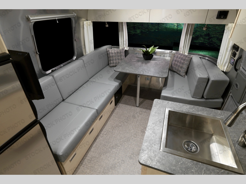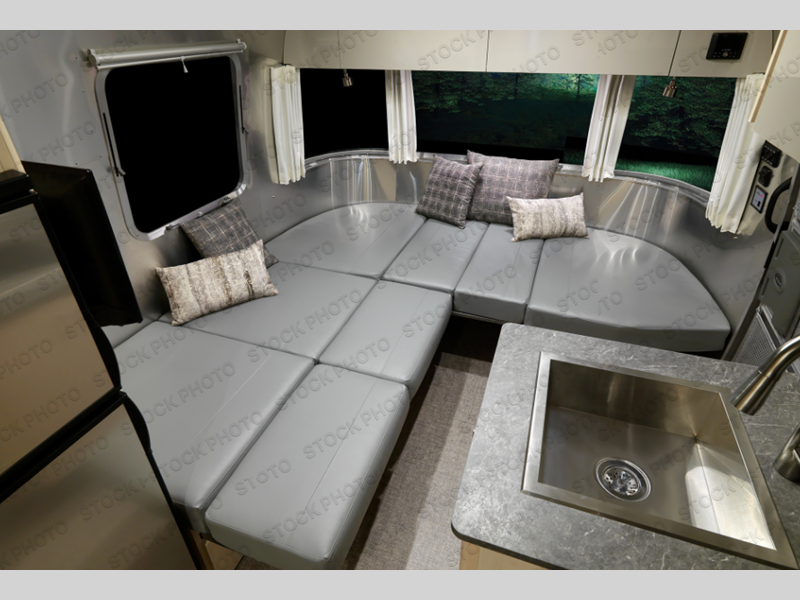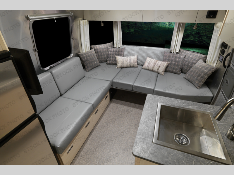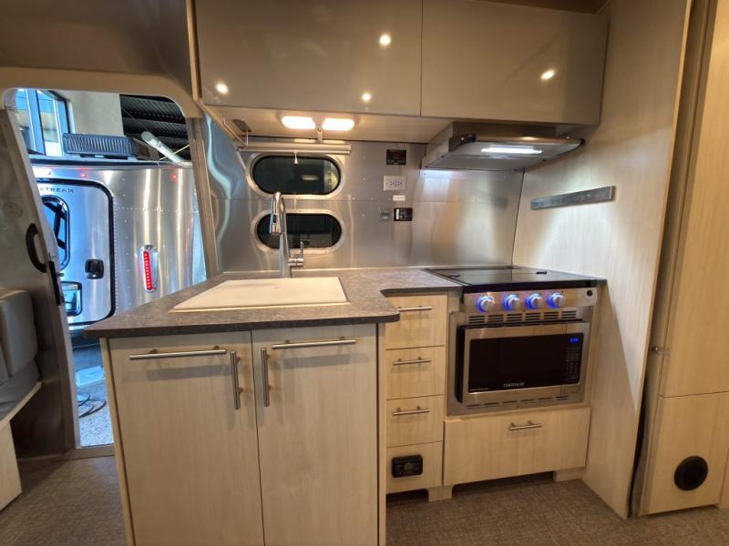 With each Flying Cloud travel trailer by Airstream, there are two axles, and each is built for ease of towing, plus there is a rear-view camera to make reversing and parking easier, and stainless steel front stone guards to protect the lower segments from road debris. The iconic Airstream design is created outside and inside by the semi-monocoque aluminum superstructure, the temperature reducing one-piece white aluminum roof, the panoramic front windows, and the stylish aluminum wheels. And almost every interior wall surface is covered in aluminum, giving the living space a clean and sophisticated appearance, even the appliances and sinks are stainless.