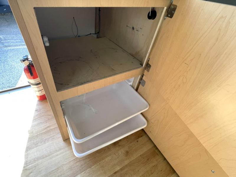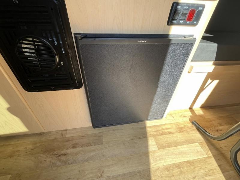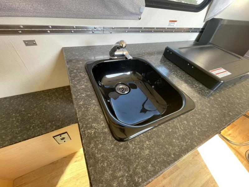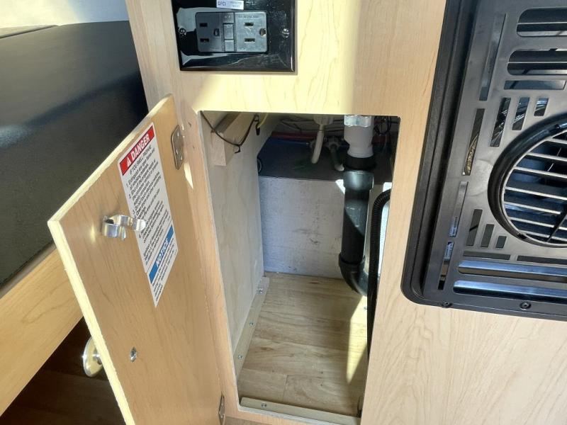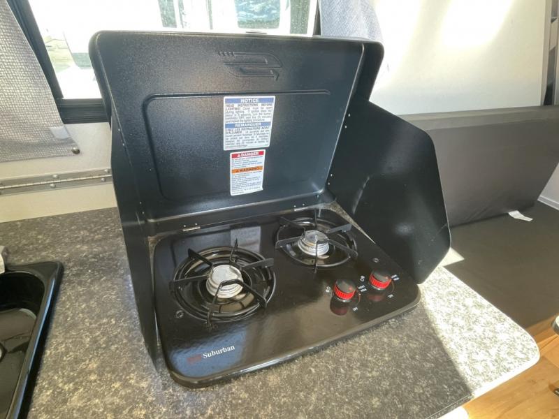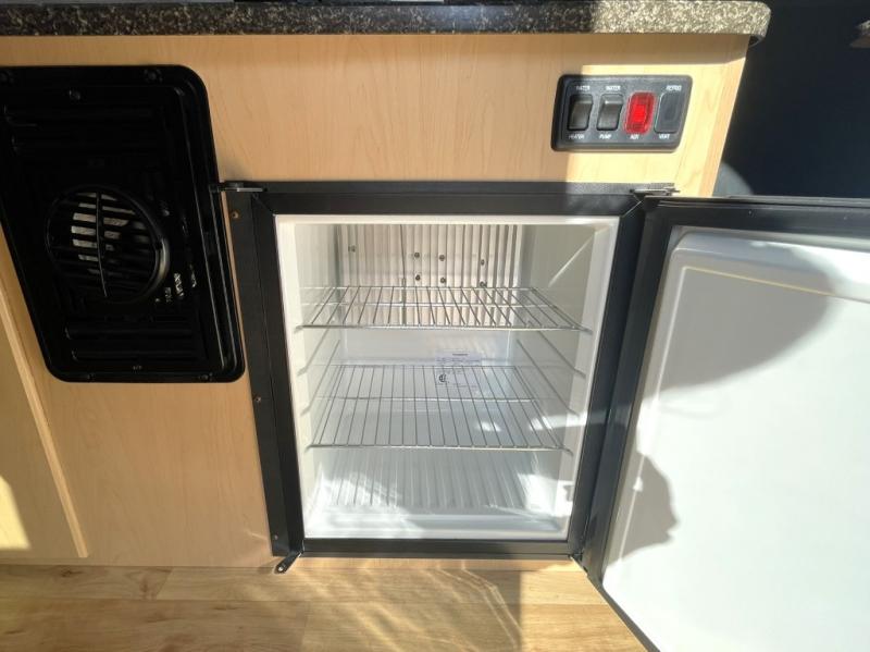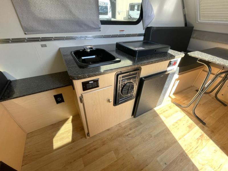 The built-in two-burner stove, sink, and slide-out 12V refrigerator/freezer let you prepare meals with ease wherever you camp. Enjoy fresh coffee in the morning or cook up a hearty dinner without stepping outside your camper.