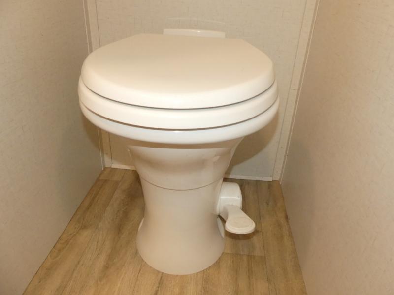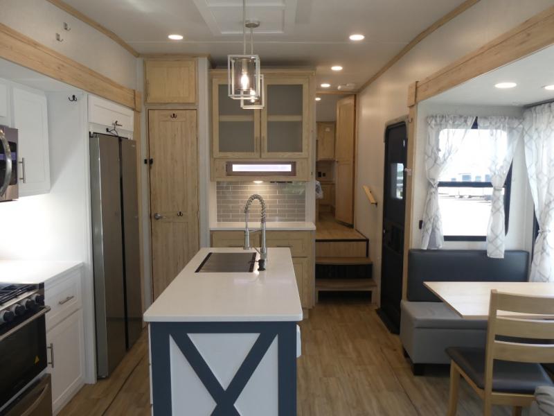 This fifth wheel has everything you will need for a comfortable camping trip! It features a kitchen island with countertop space to prepare meals that can be cooked on the three burner cooktop then enjoyed while seated at the floating dinette table that has two chairs on one side and a movable ottoman with flip up storage on the other side. You can store your dishes in the storage hutch and snacks inside one of two pantries. The front private bedroom has a queen bed and a wardrobe slide to hang your clothes, and an entrance into the dual entry bathroom. The rear living area has dual recliner theater seating across from an entertainment center which has a 50" class HDTV with hidden storage behind it and is also on a swing mount for all to see even at the rear sleeper sofa!