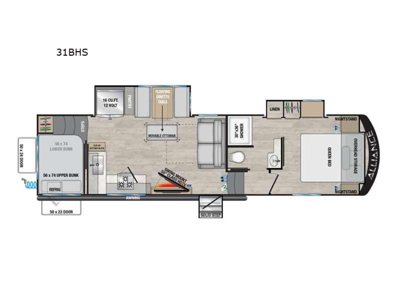A benchmark chassis creates a space saver upper deck with each one of these Avenue fifth wheels by Alliance RV! The 101 in. wide-body construction gives you more room to walk around and the flush slide out floors throughout prevent any tripping. There are Azdel composite sidewalls inside and out, and a seamless fully walkable PVC roof for extreme durability, zero maintenance, and it is more solar reflective because of the bright white color. Twin 13,500 BTU A/C units provide 27,000 BTUs of cooling power which are ultra quiet and independently controlled keeping you comfortable during your entire trip. And, the fully enclosed and heated underbelly means that you can extend your camping season into the colder months if you like. You are sure to love the "no carpet zone" making each Avenue easy to clean and allergen free, not to mention pet friendly with vinyl flooring throughout. And, strategically placed Atrium windows in the bedroom and living area will not only provide more light, cross ventilation and fresh air, but bring a spectacular view of your surroundings right inside. You can maximize your space throughout with innovative storage solutions like the hidden storage behind the TV, inside the end tables, ottoman, and dinette chairs. Come choose your favorite model today!