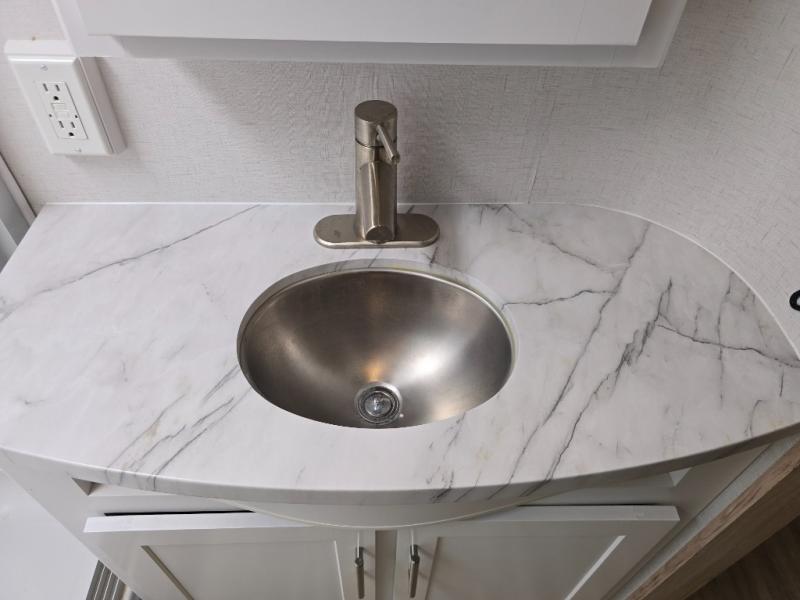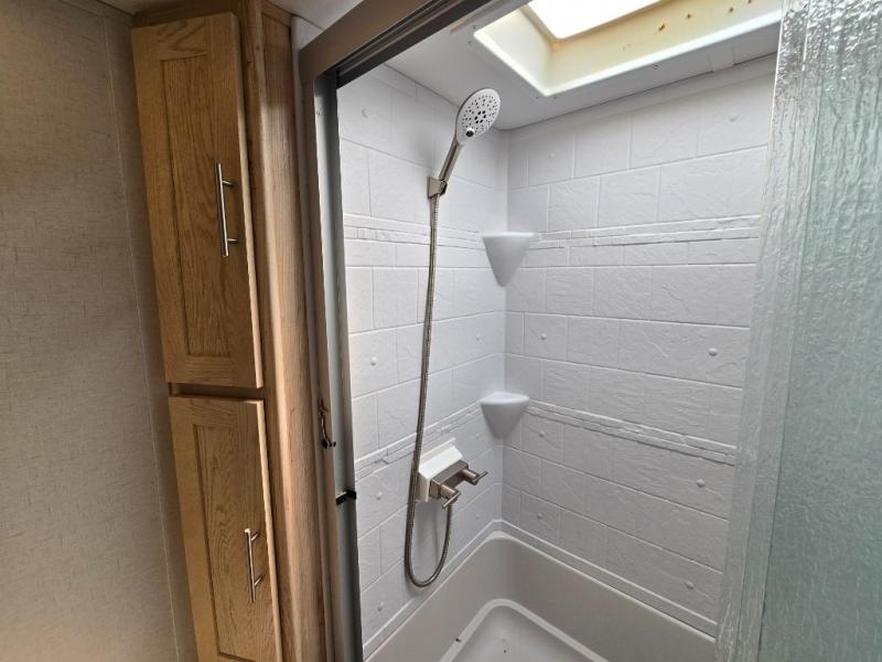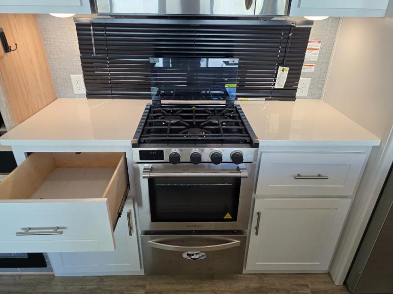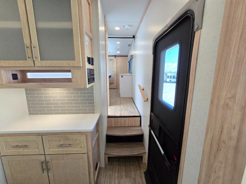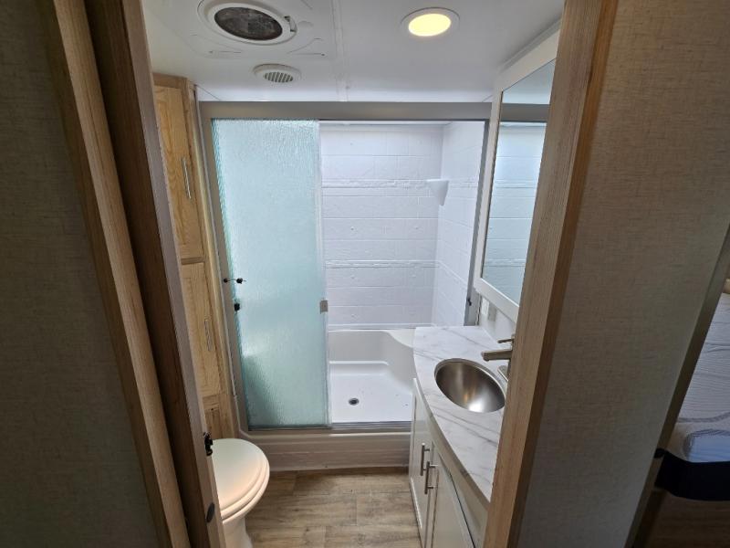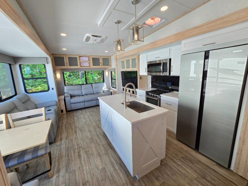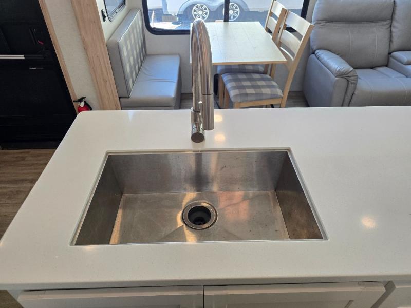 A benchmark chassis creates a space saver upper deck with each one of these Avenue fifth wheels by Alliance RV! The 101 in. wide-body construction gives you more room to walk around and the flush slide out floors throughout prevent any tripping. There are Azdel composite sidewalls inside and out, and a seamless fully walkable PVC roof for extreme durability, zero maintenance, and it is more solar reflective because of the bright white color. Twin 13,500 BTU A/C units provide 27,000 BTUs of cooling power which are ultra quiet and independently controlled keeping you comfortable during your entire trip. And, the fully enclosed and heated underbelly means that you can extend your camping season into the colder months if you like. You are sure to love the "no carpet zone" making each Avenue easy to clean and allergen free, not to mention pet friendly with vinyl flooring throughout. And, strategically placed Atrium windows in the bedroom and living area will not only provide more light, cross ventilation and fresh air, but bring a spectacular view of your surroundings right inside. You can maximize your space throughout with innovative storage solutions like the hidden storage behind the TV, inside the end tables, ottoman, and dinette chairs. Come choose your favorite model today!
