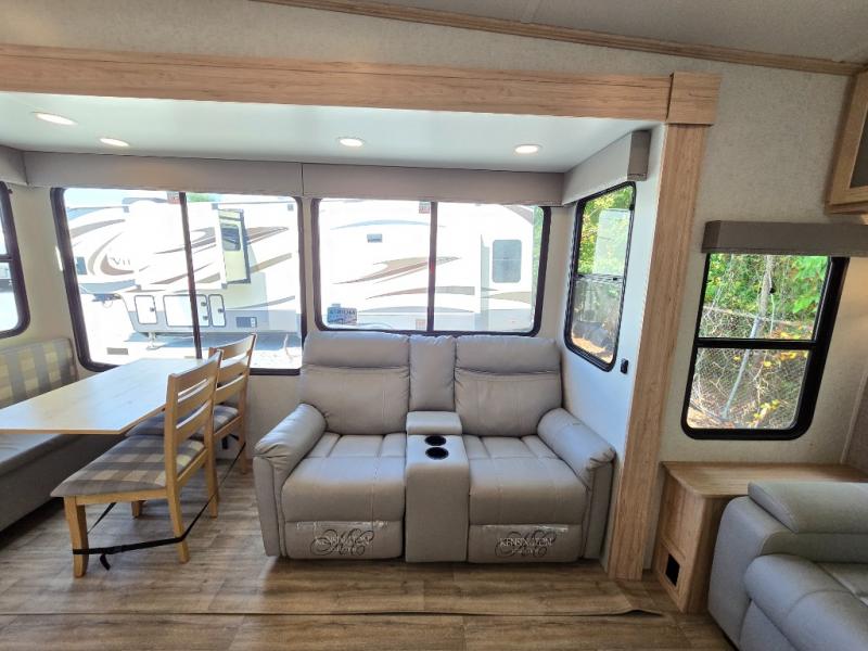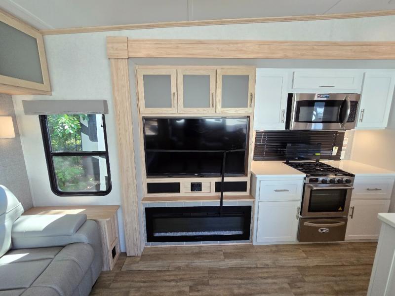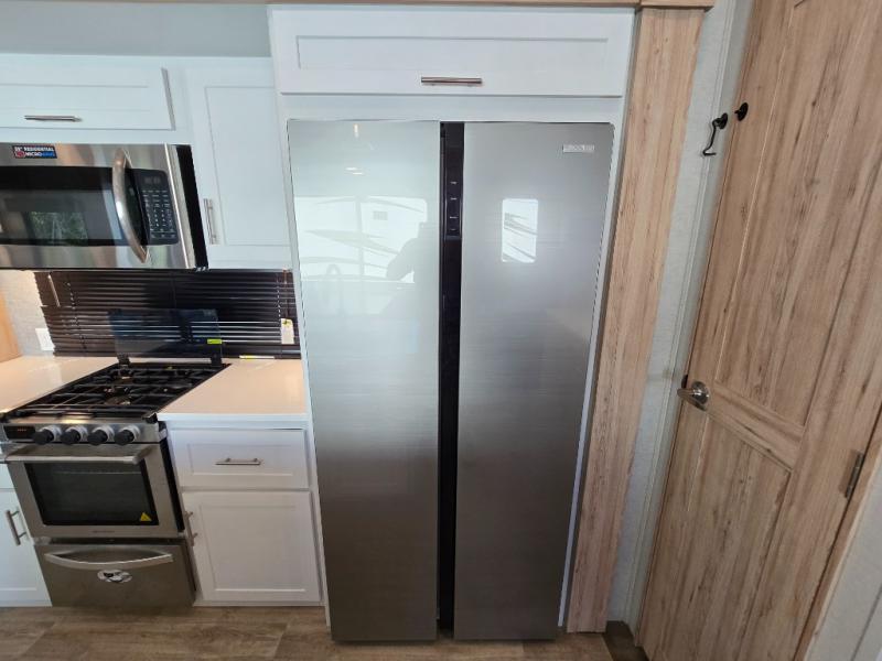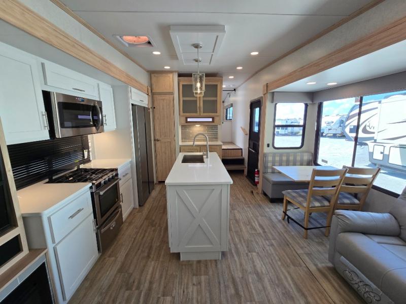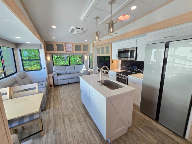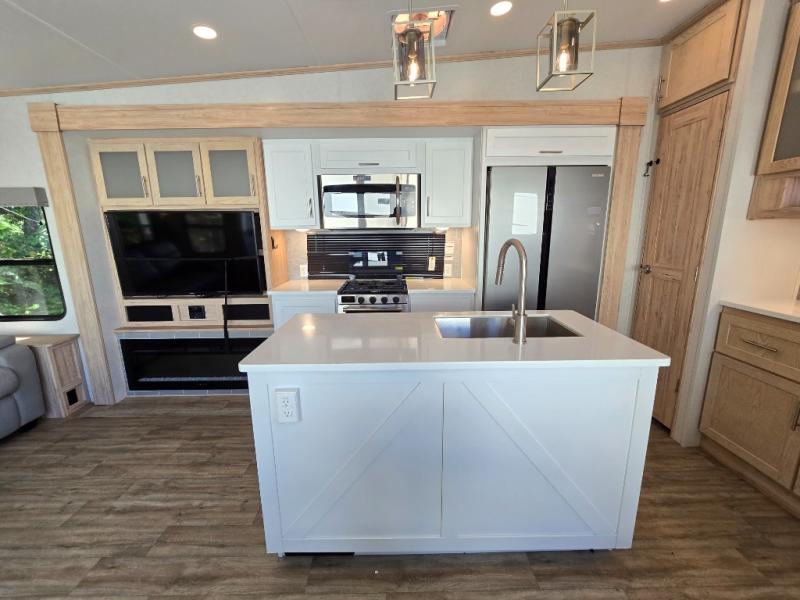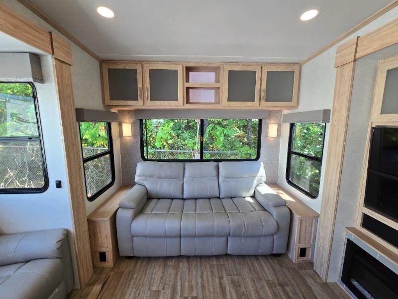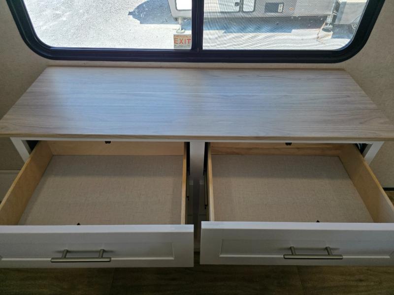 A kitchen island with countertop space makes it easy to prepare meals in this fifth wheel! The floating dinette table has two chairs on one side and a movable ottoman with flip up storage on the other side to keep your games or extra table cloths in. You can store your dishes and snacks inside the hutch/pantry or in the second pantry. The front private bedroom has a queen bed slide but can be switched out for the optional king bed if you like. There is also a dresser and large wardrobe for storage, and either side of the wardrobe has been prepped for a washer and dryer which you could add for those extended trips. The rear living area has dual recliner theater seating across from an entertainment center which has a 50" class HDTV with hidden storage behind it and is also on a swing mount for all to see even at the rear sleeper sofa!