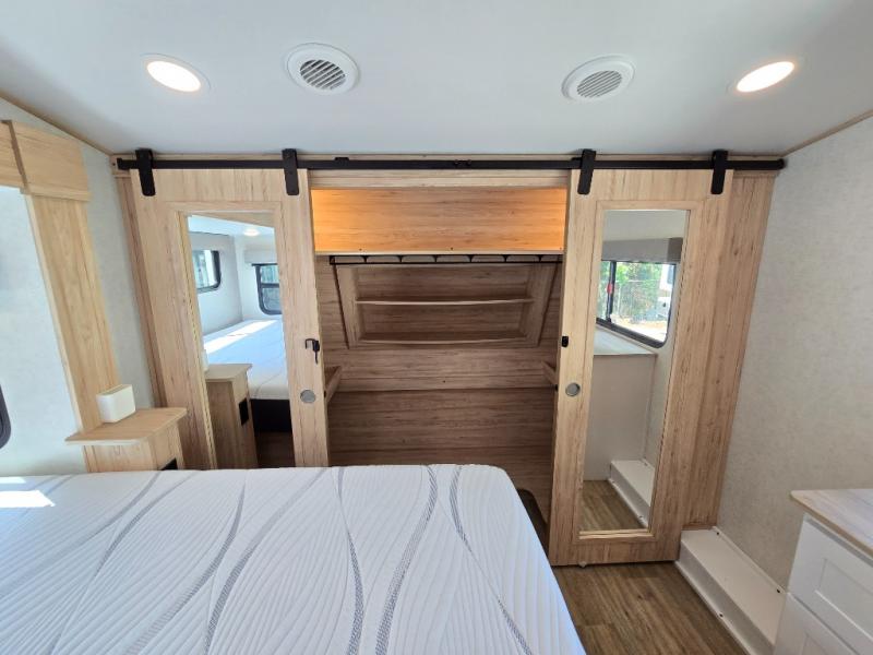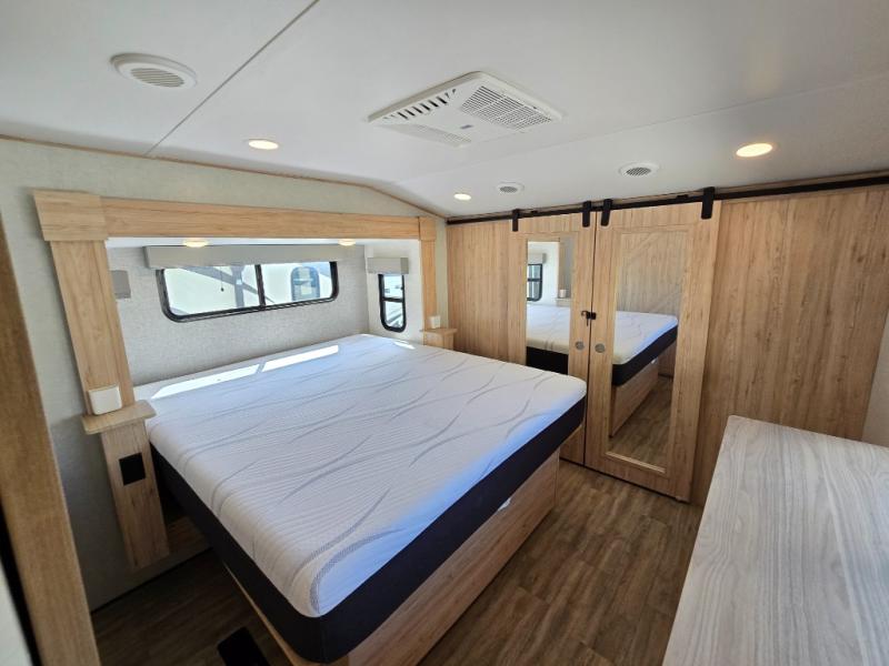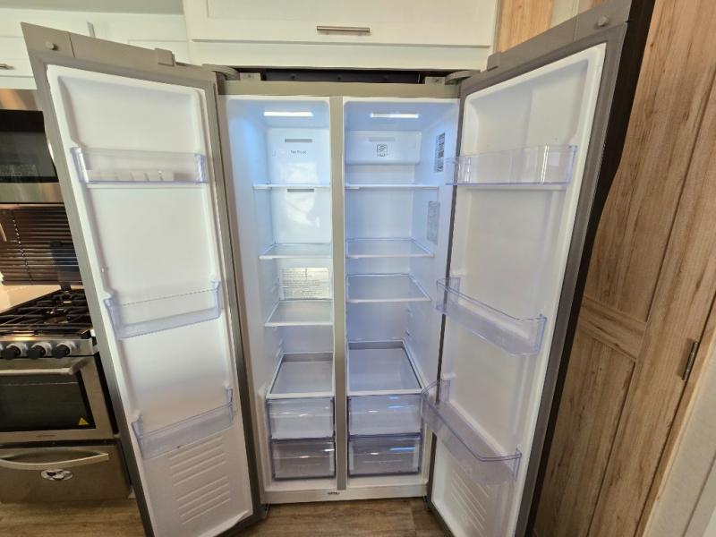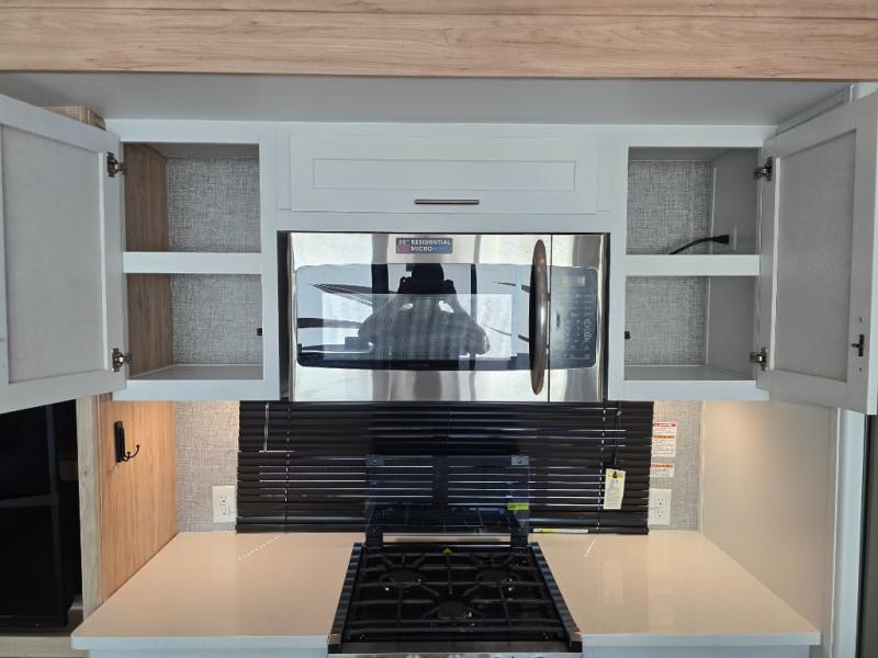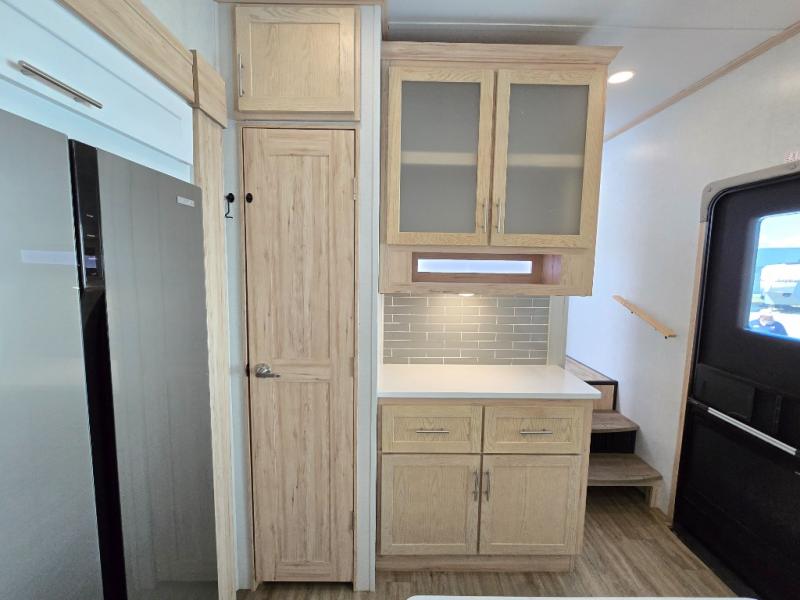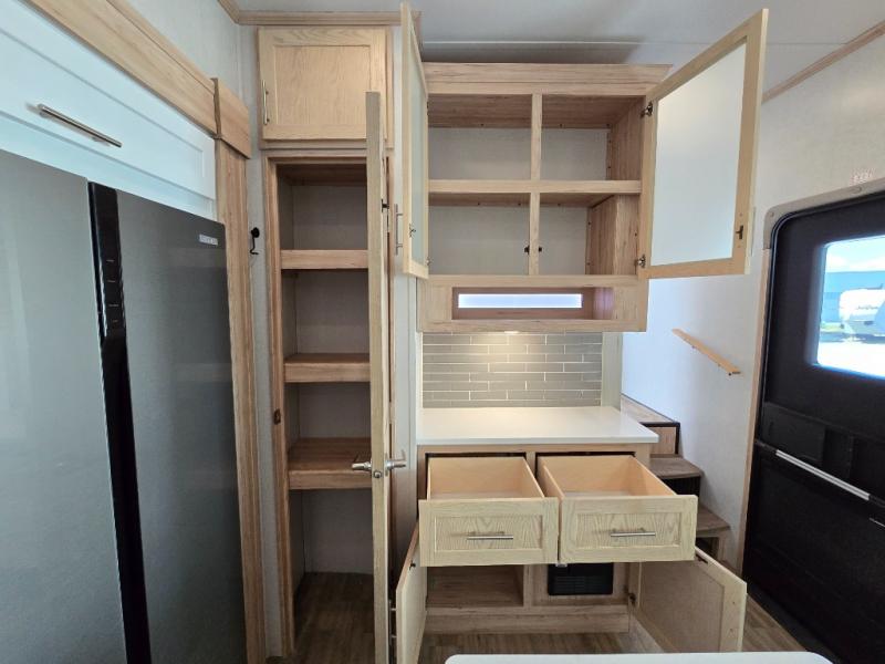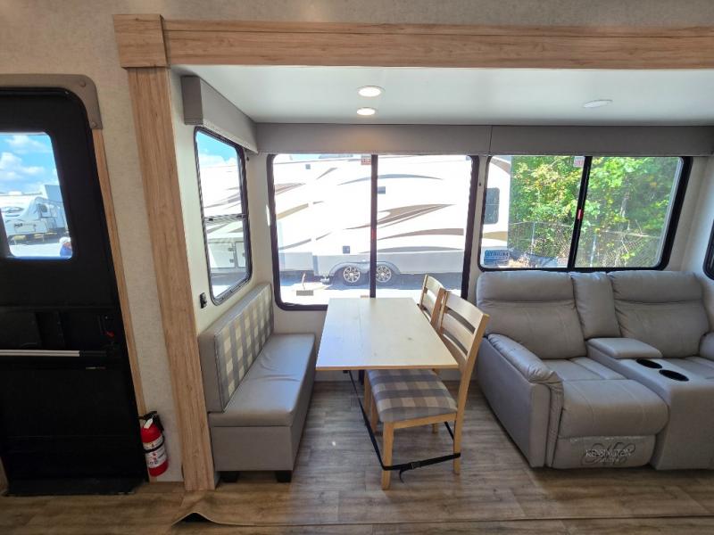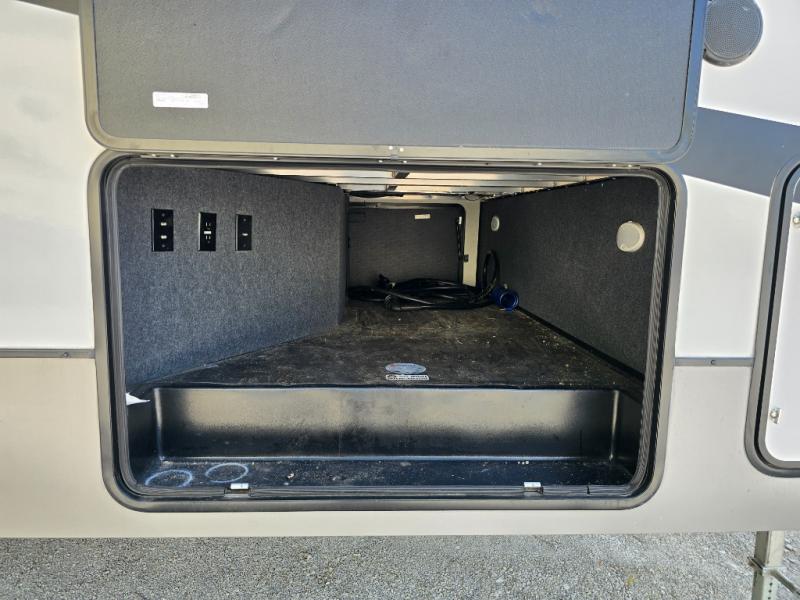 A kitchen island with countertop space makes it easy to prepare meals in this fifth wheel! The floating dinette table has two chairs on one side and a movable ottoman with flip up storage on the other side to keep your games or extra table cloths in. You can store your dishes and snacks inside the hutch/pantry or in the second pantry. The front private bedroom has a queen bed slide but can be switched out for the optional king bed if you like. There is also a dresser and large wardrobe for storage, and either side of the wardrobe has been prepped for a washer and dryer which you could add for those extended trips. The rear living area has dual recliner theater seating across from an entertainment center which has a 50" class HDTV with hidden storage behind it and is also on a swing mount for all to see even at the rear sleeper sofa!