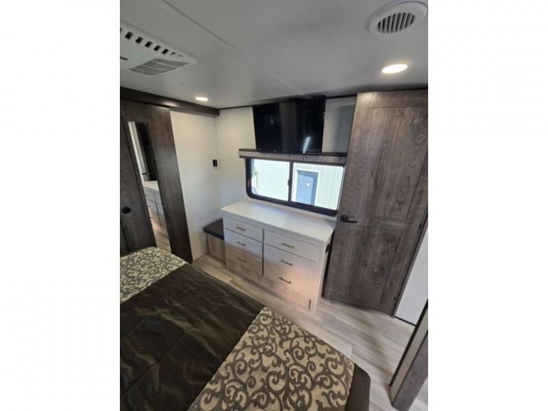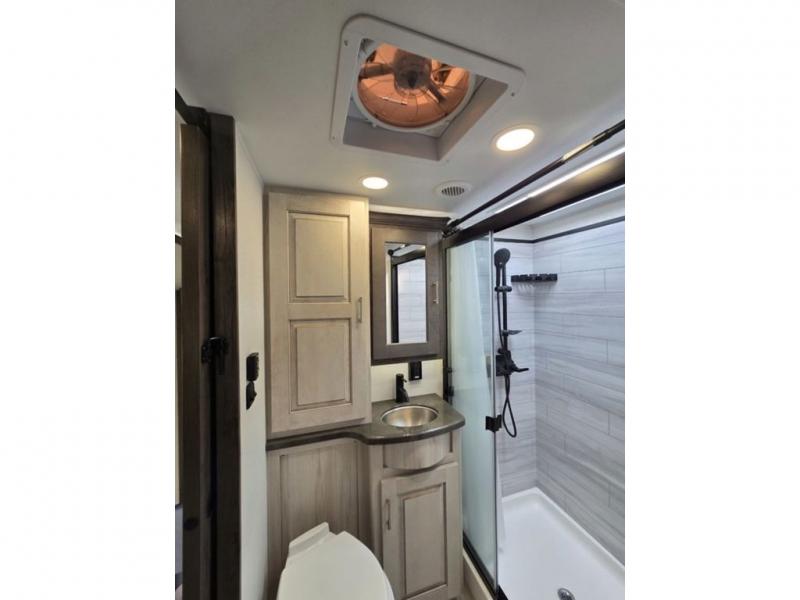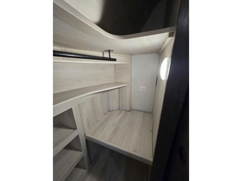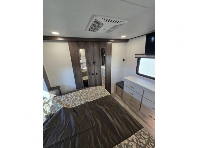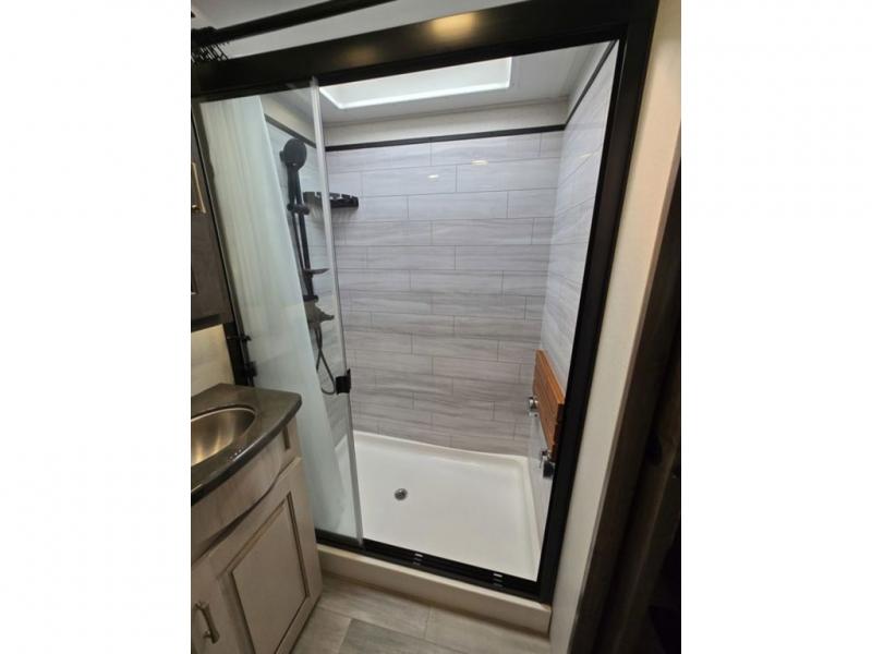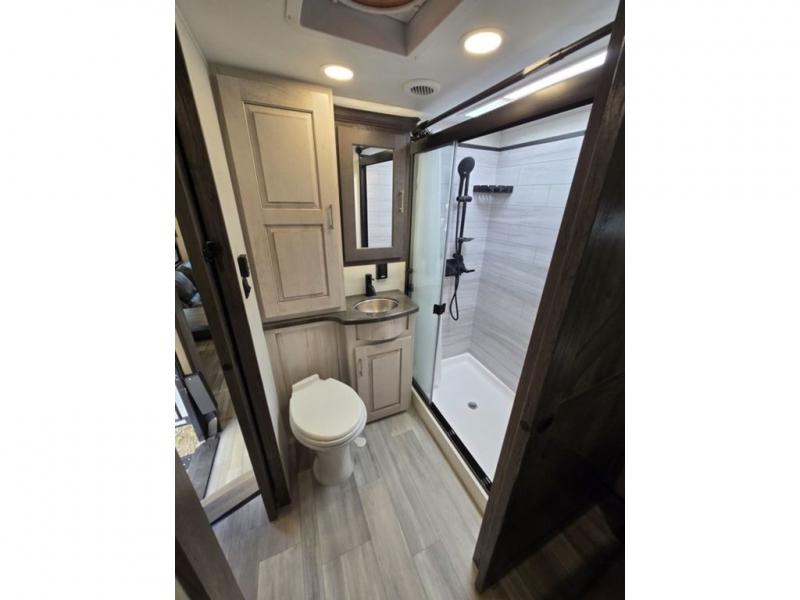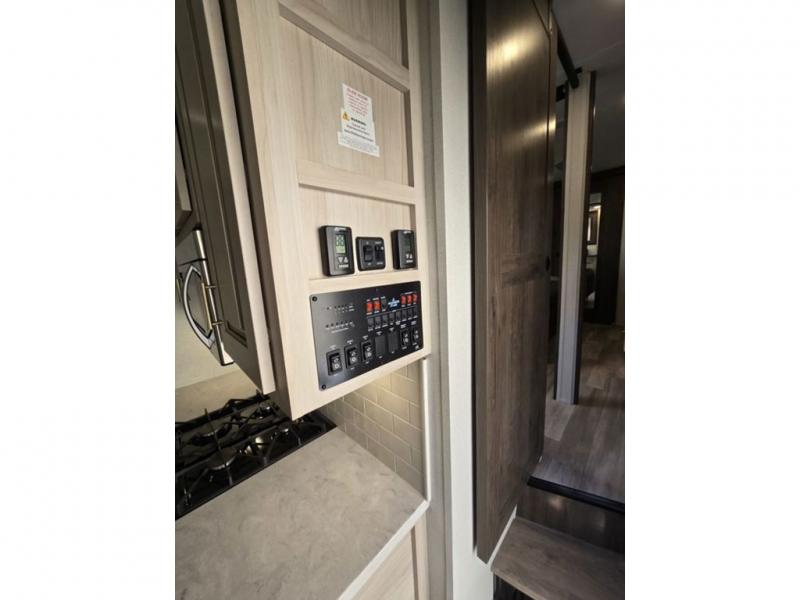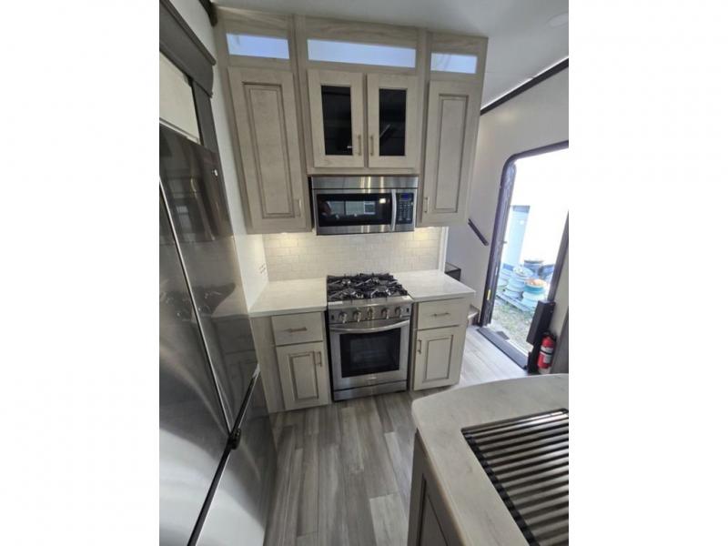 This middle kitchen will be the cook's favorite area with the Insignia range with a 12,000 BTU burner, a 3.73 cu. ft. oven, and an Insignia residential microwave, plus the kitchen island with a stainless steel farm sink and extra counter space to prepare and serve meals. The rear living area offers a sleeper sofa next to the pull-out fireplace with storage and the 50" Smart TV. You can also relax on the dual recliner love seat, and dine, work or play games at the floating dinette table. The bedroom is up front and offers an oasis with a king bed slide or choose the queen option, a dresser with flip-up hidden storage, a seat to use to put on your shoes, and a front wardrobe with a space to add a washer/dryer option to keep all your clothes clean. And the double entry bathroom includes a large residential shower, a porcelain toilet with soft close seat and more. One walk-through and this will be the one!