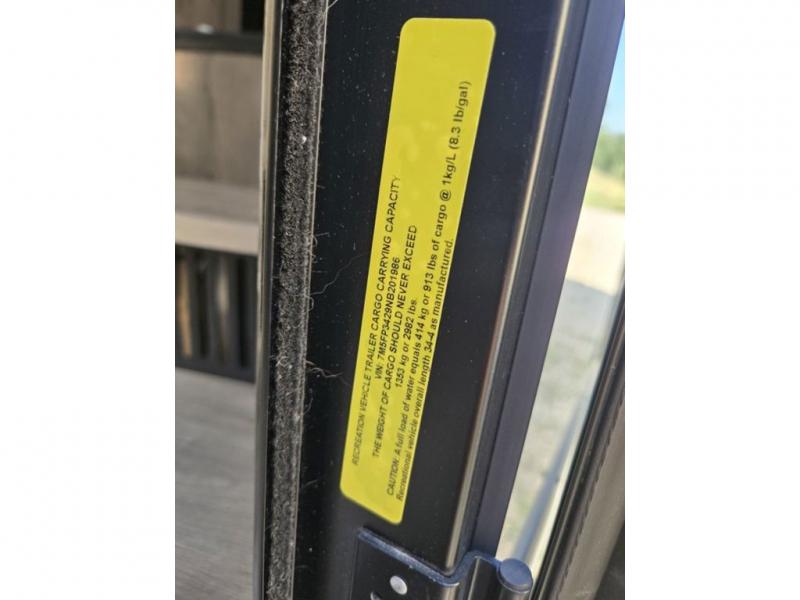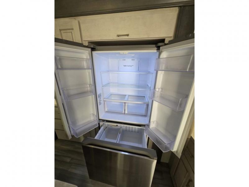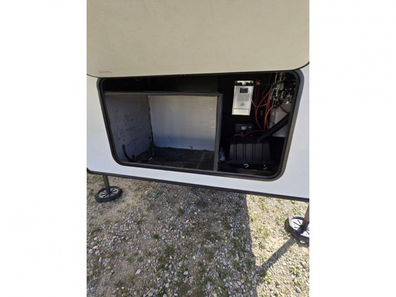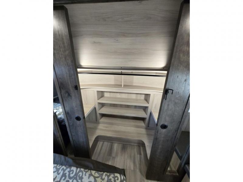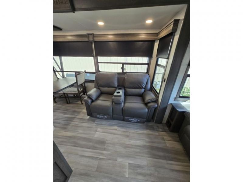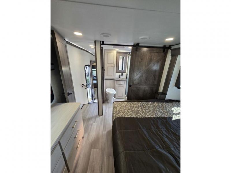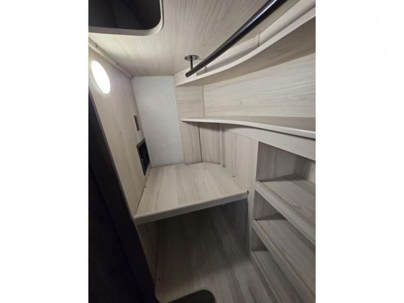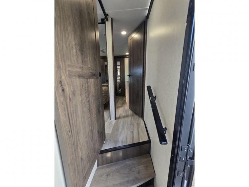This middle kitchen will be the cook's favorite area with the Insignia range with a 12,000 BTU burner, a 3.73 cu. ft. oven, and an Insignia residential microwave, plus the kitchen island with a stainless steel farm sink and extra counter space to prepare and serve meals. The rear living area offers a sleeper sofa next to the pull-out fireplace with storage and the 50" Smart TV. You can also relax on the dual recliner love seat, and dine, work or play games at the floating dinette table. The bedroom is up front and offers an oasis with a king bed slide or choose the queen option, a dresser with flip-up hidden storage, a seat to use to put on your shoes, and a front wardrobe with a space to add a washer/dryer option to keep all your clothes clean. And the double entry bathroom includes a large residential shower, a porcelain toilet with soft close seat and more. One walk-through and this will be the one!