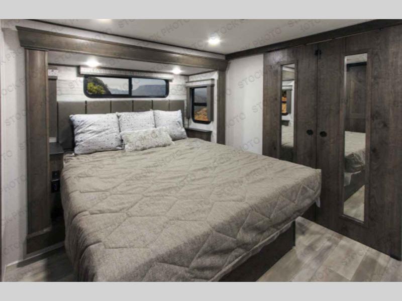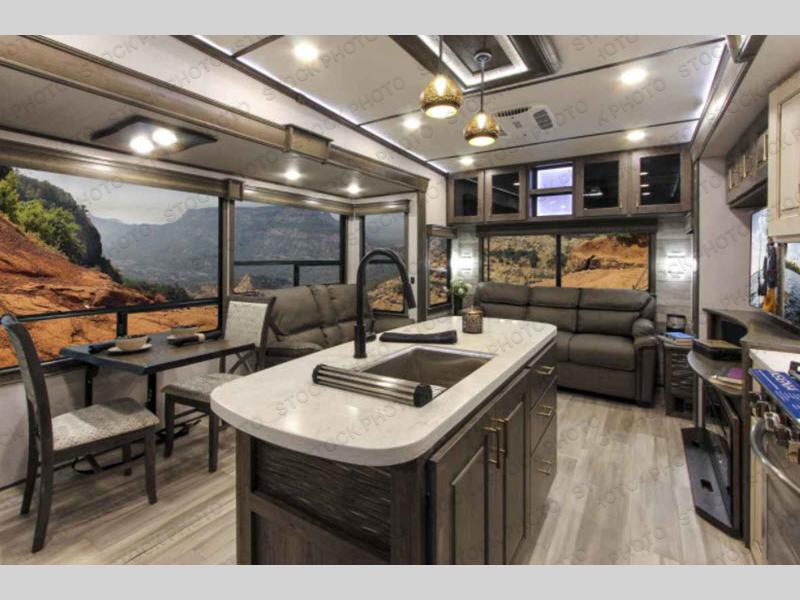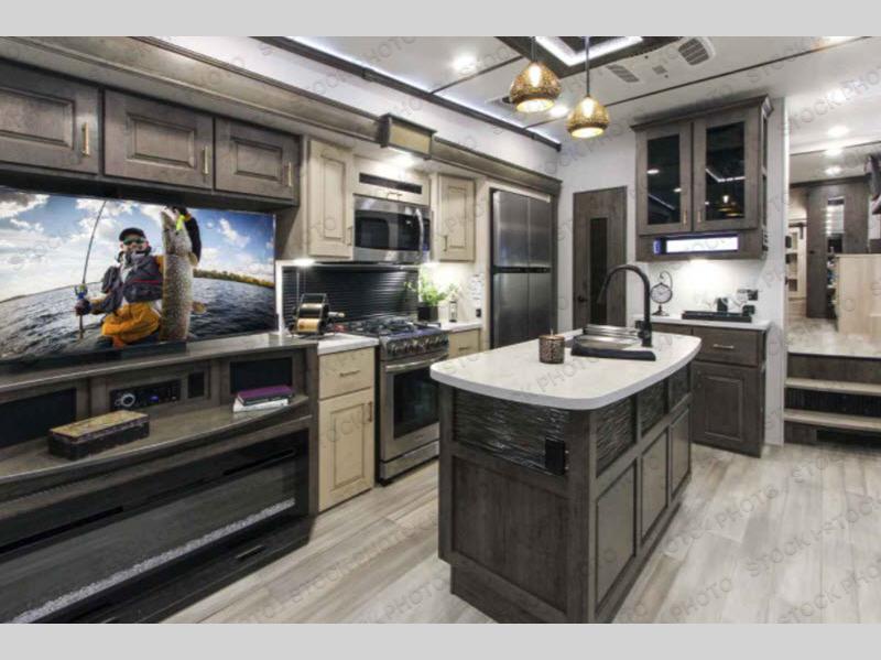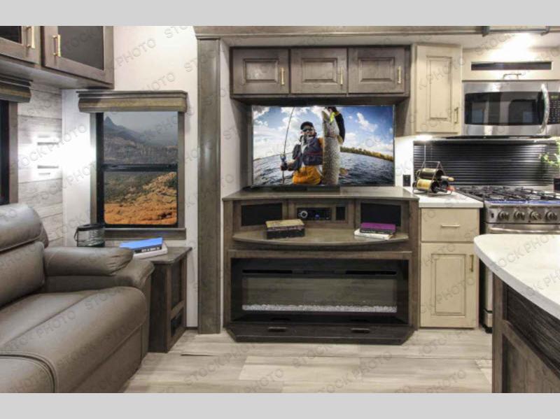 Search for the best views, the nicest RV park or a place you haven't seen for years with this Paradigm in tow! From the king bed slide in the master bedroom, the Smart TV, the dresser with flip-up hidden storage and the front wardrobe to the rear living area with a sleeper sofa near the pull-out fireplace with storage, you might decide to live in this fifth wheel. The full bathroom offers a large residential shower, a porcelain toilet with soft close seat, and storage for your linens, while the kitchen gives you two pantries, an island with a stainless steel farm sink and a space prepped for a dishwasher option, plus a residential microwave, range and oven to make meals. And you will love the dual recliner love seat and the floating dinette table. There are so many more features included, take this fifth wheel home today!