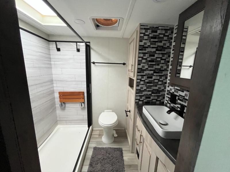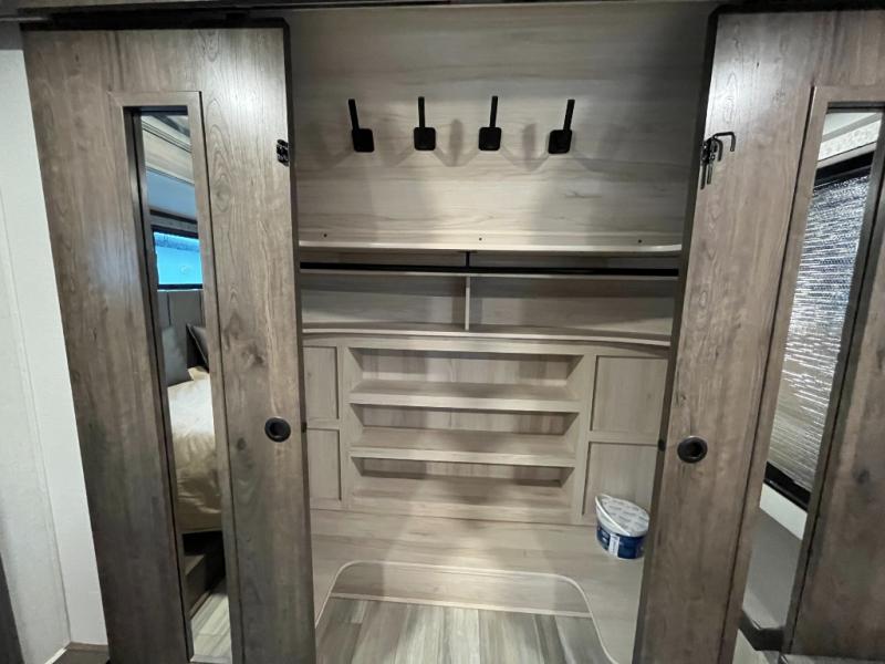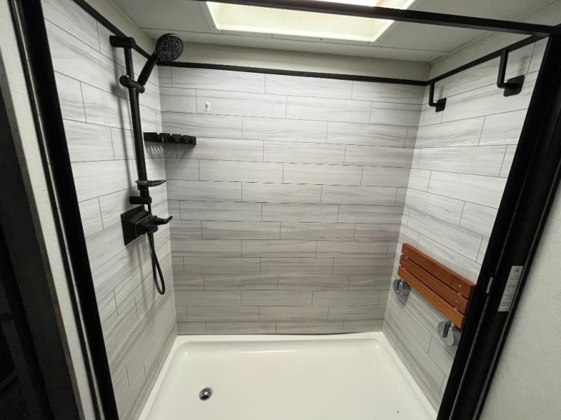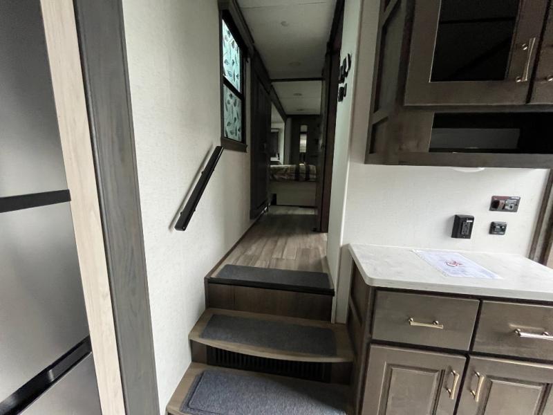 Travel to see family and friends while living in this RV or while on vacation with beautiful views out of the many atrium windows once at your destination. You will love the spacious rear living area thanks to the dual opposing slides which include the kitchen amenities and the 50" Smart TV with pull-out fireplace including storage below, plus the dual recliner love seat which is super comfortable and the floating dinette table with four chairs. The kitchen island includes a stainless steel farm sink and counter space to utilize many ways, plus you can add a dishwasher option if you like. The full bathroom is up the steps towards the front bedroom and includes a 61" x 30" shower. You even have more floor space in the hallway thanks to the slide out which includes shelf storage, plus more shelves and a king bed in the bedroom. You will find lots of useful storage in the bedroom as well. And don't forget about all the exterior features, take a look!