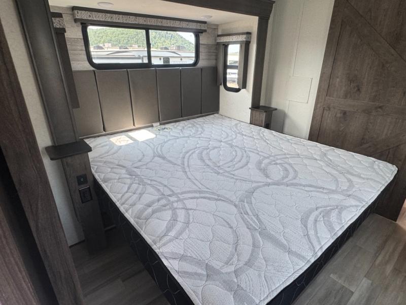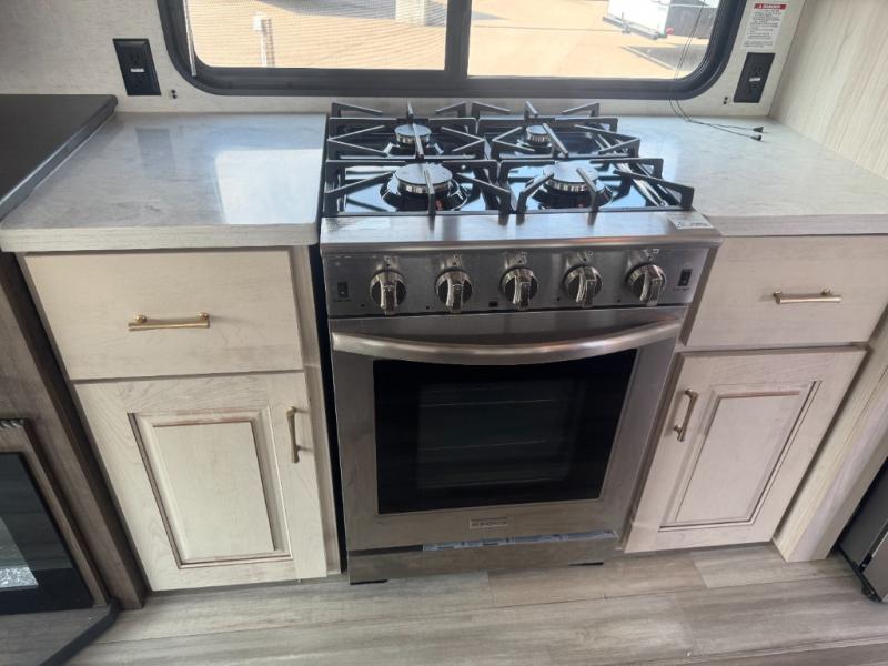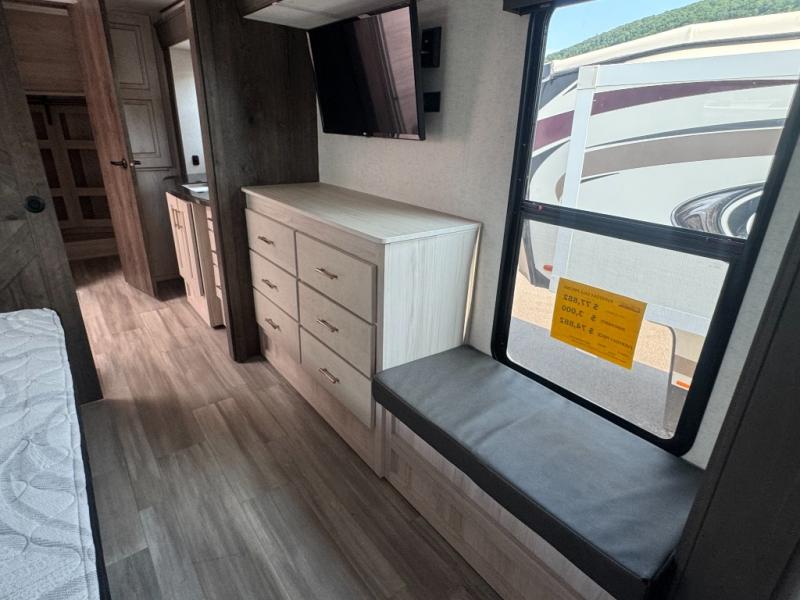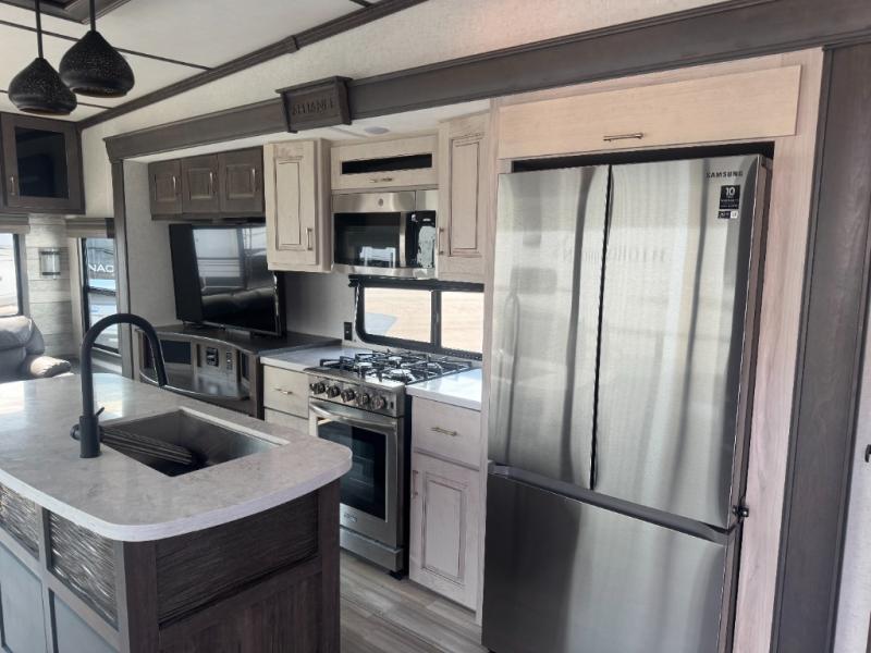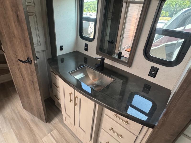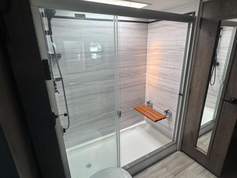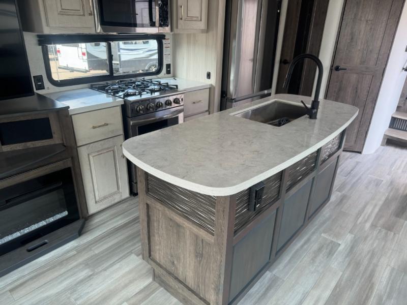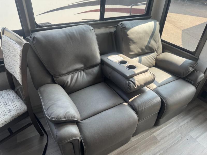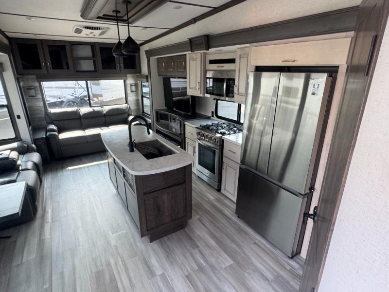 Whether you decide to be a full-timer or a long-trip traveler, this Paradigm offers so many comforts and conveniences you will love seeing nature while under the two awnings with only a few steps to get back inside to rest and relax in your own spacious fifth wheel! The large full bathroom might be the reason you decide to be a owner because you will have a large 61" x 30" shower to get cleaned up in, linen storage, and a walk-in closet with a hamper, shelves, and a space prepped for a washer/dryer option. The bedroom allows you to sleep like a king and gives you extra floor space with the two slides, and storage in the flip-top dresser and under the seat, plus you can watch the Smart TV. The space saving sliding doors offer style as well. The cook will love all the residential appliances, you can even choose the residential refrigerator option. The kitchen island gives you a stainless steel farm sink and a place to add a dishwasher option. The half bath is super convenient just like the entry sitting bench/coat rack and closet. And you can relax on the sleeper sofa or the dual recliner love seat. There is so much more to see!