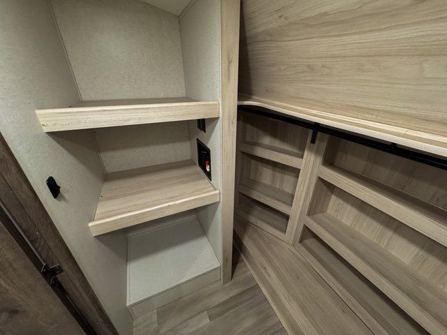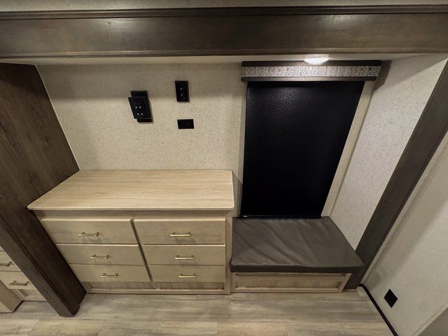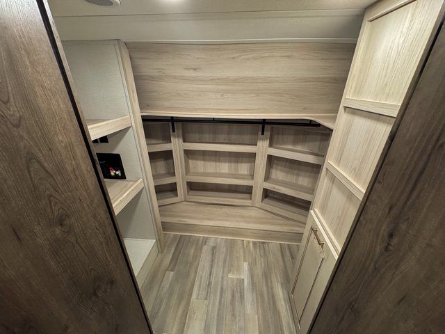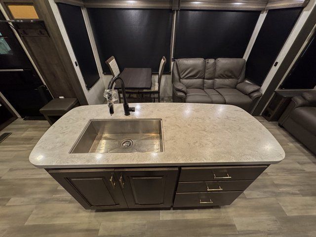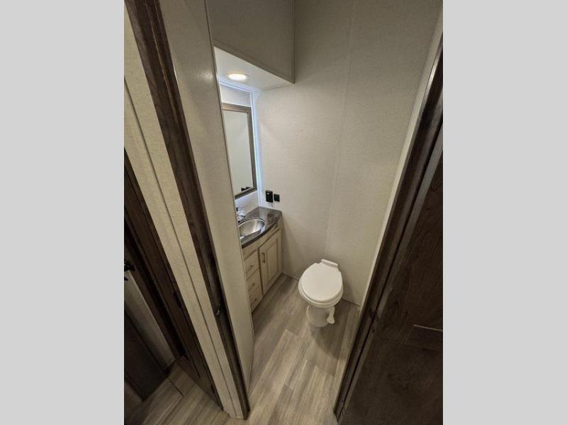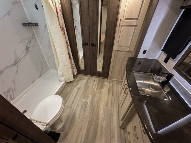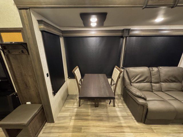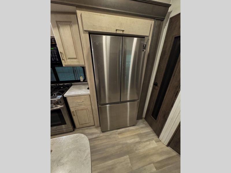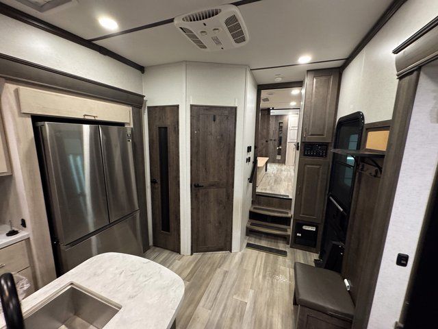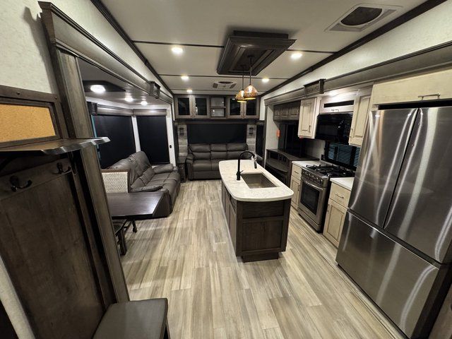 Whether you decide to be a full-timer or a long-trip traveler, this Paradigm offers so many comforts and conveniences you will love seeing nature while under the two awnings with only a few steps to get back inside to rest and relax in your own spacious fifth wheel! The large full bathroom might be the reason you decide to be a owner because you will have a large 61" x 30" shower to get cleaned up in, linen storage, and a walk-in closet with a hamper, shelves, and a space prepped for a washer/dryer option. The bedroom allows you to sleep like a king and gives you extra floor space with the two slides, and storage in the flip-top dresser and under the seat, plus you can watch the Smart TV. The space saving sliding doors offer style as well. The cook will love all the residential appliances, you can even choose the residential refrigerator option. The kitchen island gives you a stainless steel farm sink and a place to add a dishwasher option. The half bath is super convenient just like the entry sitting bench/coat rack and closet. And you can relax on the sleeper sofa or the dual recliner love seat. There is so much more to see!