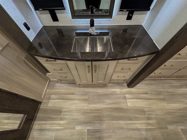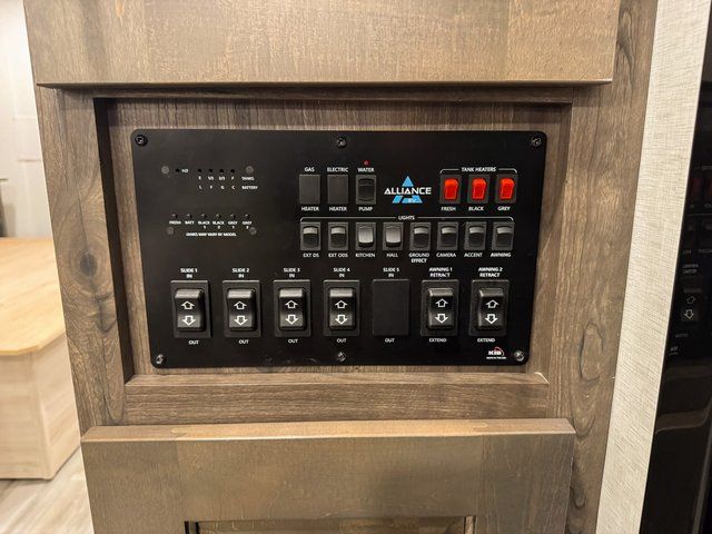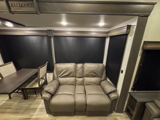 With any Paradigm fifth wheel by Alliance RV, you will experience the next generation advanced frame technology with heavy duty performance running gear. The Benchmark chassis features solid steel 10" l-beam main rails with a 2" torsion tube welded where the running gear attaches, drop frame storage area, flush upper deck design, reinforced goose neck area and a Rota-Flex pin box. The six-point hydraulic auto leveling is faster, stronger and quieter allowing you to enjoy more time away, and the PVC roof is more puncture resistant, ultra bright white and more solar reflective to help keep your fifth wheel cool. The triple 13,500 BTU A/Cs are ultra quiet, independently controlled direct flow A/C units that maximize cooling capacity, plus the 40,000 BTU furnace has flex ducts connected to formed ducts in the floor, and there are dedicated heat vents into the basement and underbelly to keep the tanks and your gear cozy warm during the cooler seasons. Choose luxury, choose convenience, choose to own the best, a Paradigm!