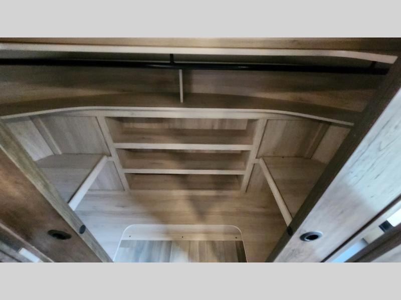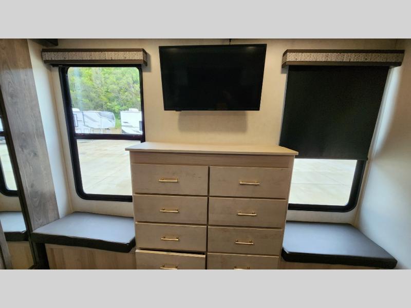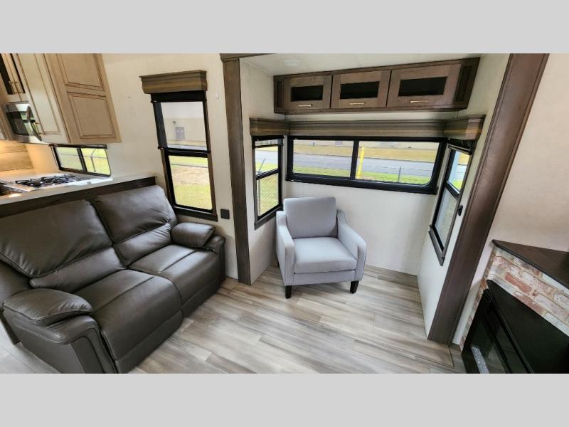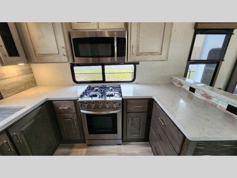 If you enjoy your own space, this fifth wheel offers just that with a separate kitchen in the rear from the middle living area. The kitchen offers lots of counter space, plus residential appliances, and you can choose a residential refrigerator option, a pantry, a stainless steel farm sink and a space prepped to add a dishwasher option. Everyone can dine at the floating dinette with four chairs or while sitting in the living area on the dual recliner love seat or the two sleeper sofas that offer space for overnight guests. The welcoming entry allows you to head to the living area or up the stairs to the front spacious bedroom and hallway thanks to the slide out with storage in the hallway, and shelves plus a king bed in the bedroom. You will find more places for your clothing and things in the front wardrobe, the flip-top dresser and under the two seats. There are more features to see that bring you comfort and convenience, and the style you want. And you can add a few options such as a washer/dryer, an LED motion light strip in the pantry, and/or dual pane windows.