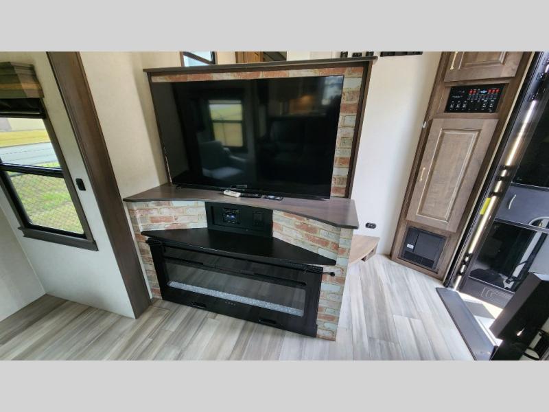 Rear kitchen with a lot of counter and storage space, TV over Fireplace, King Bed, washer/ Dryer hookups, Slide toppers, Hydraulic Auto-leveling, Tank heaters on all tanks, Large shower with bench seat, Residential Fridge