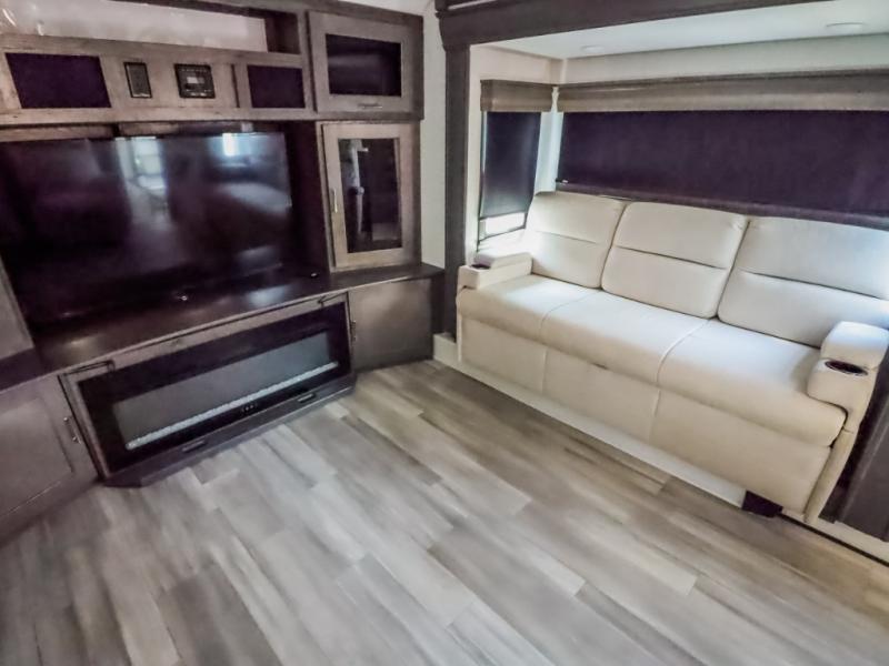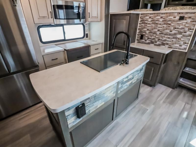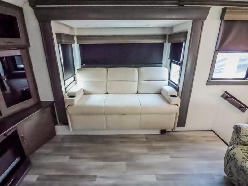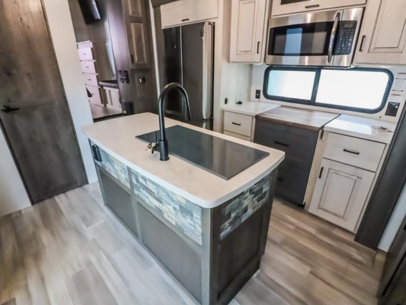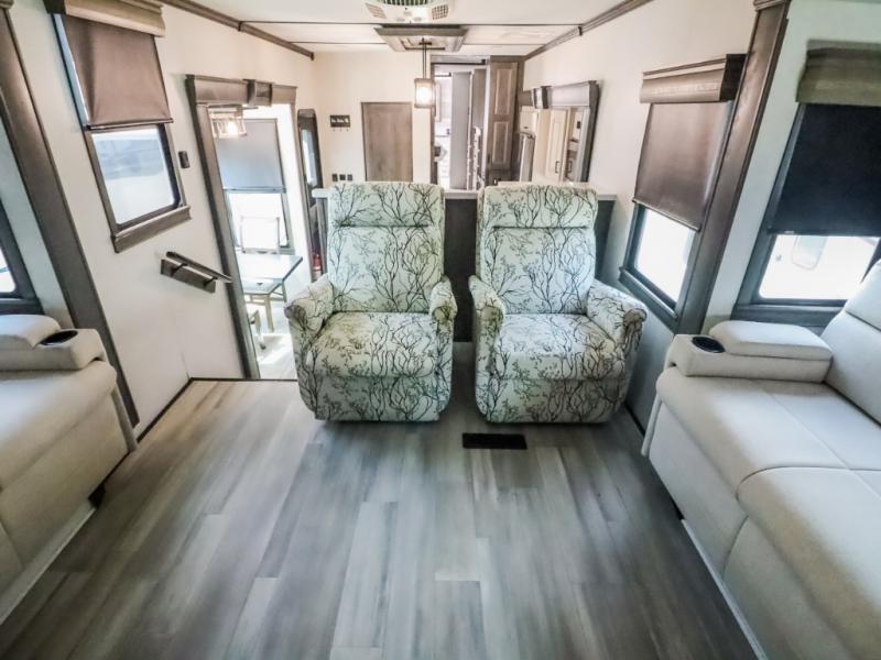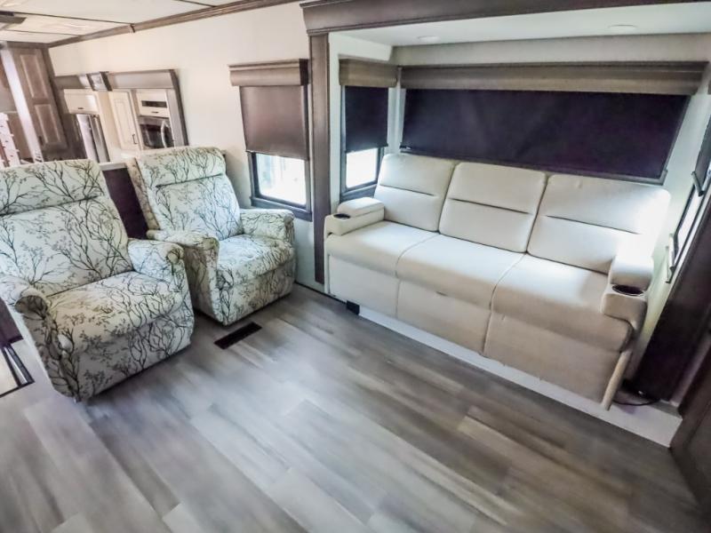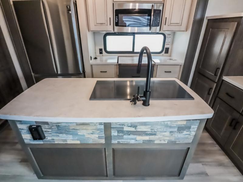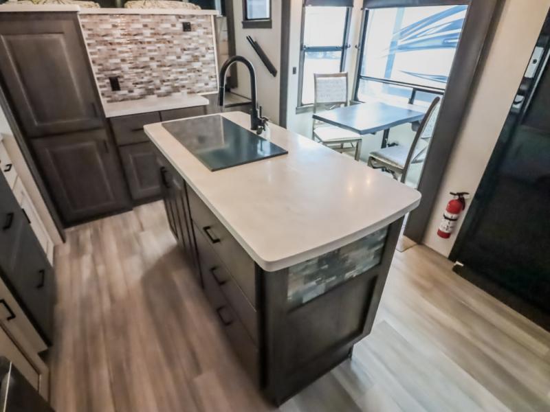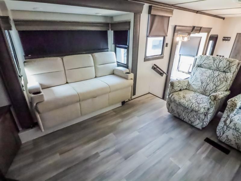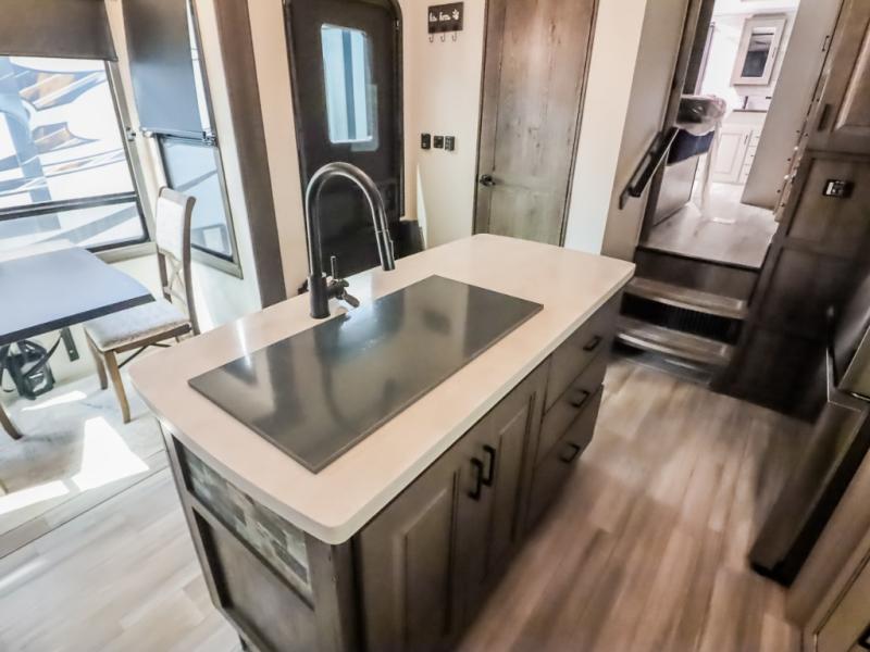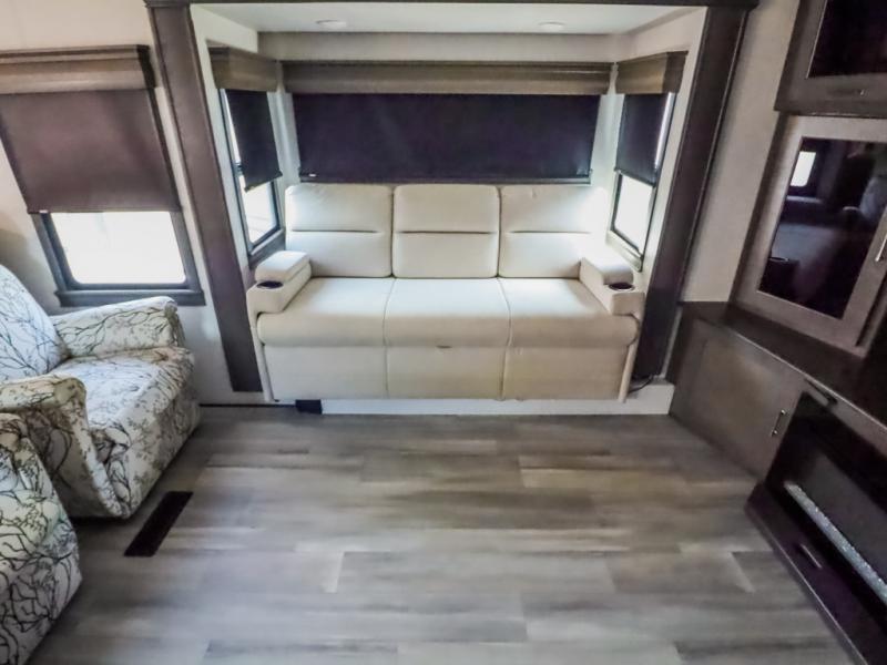 An active family will want this fifth wheel with its exterior basement pull-out tray that measures at 48" x 115" to load up your kayaks and such. Just above this area is the master suite with a rear bathroom that offers a residential shower, a porcelain toilet with soft close seat, plus a wardrobe and shelf storage. The king bed slide gives you more floor space, and you will have a seat, a flip-top dresser, and a Smart TV to watch. The half bath is next to the main entry which is super convenient, and the middle kitchen is separate from the front living area. The cook will love the residential microwave, range and oven, plus the option to add a residential refrigerator, plus the pantry, and the extra counter space on the kitchen island with a stainless steel farm sink. And the views out of the atrium windows in the slide out which includes the floating dinette table are a must see. And when you need to watch the big game, the 55" Smart TV with pull-out fireplace below are up front with the dual recliner love seat and two sleeper sofas.