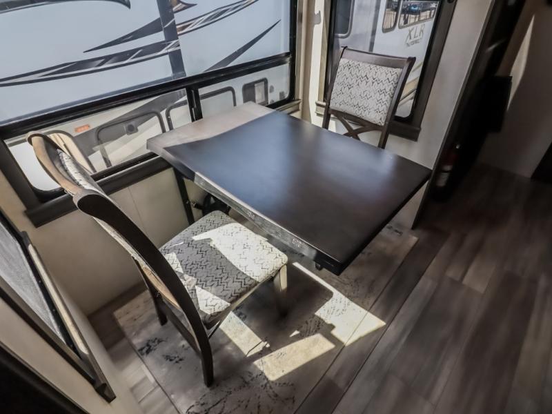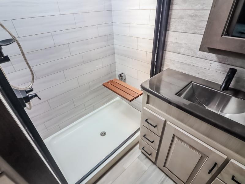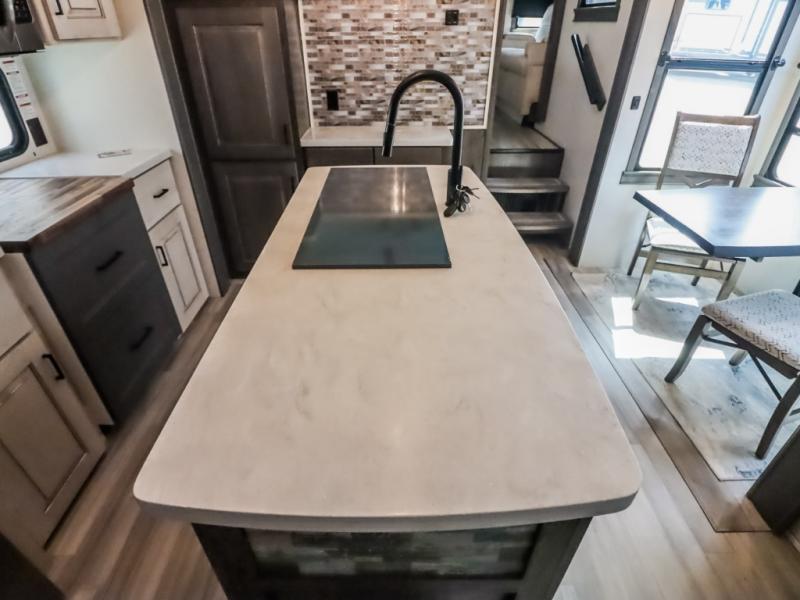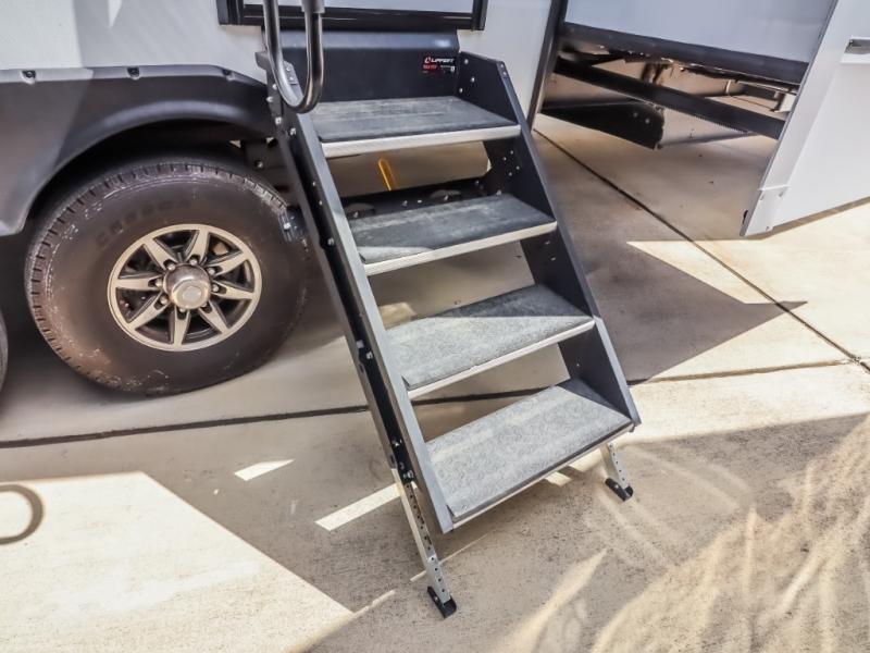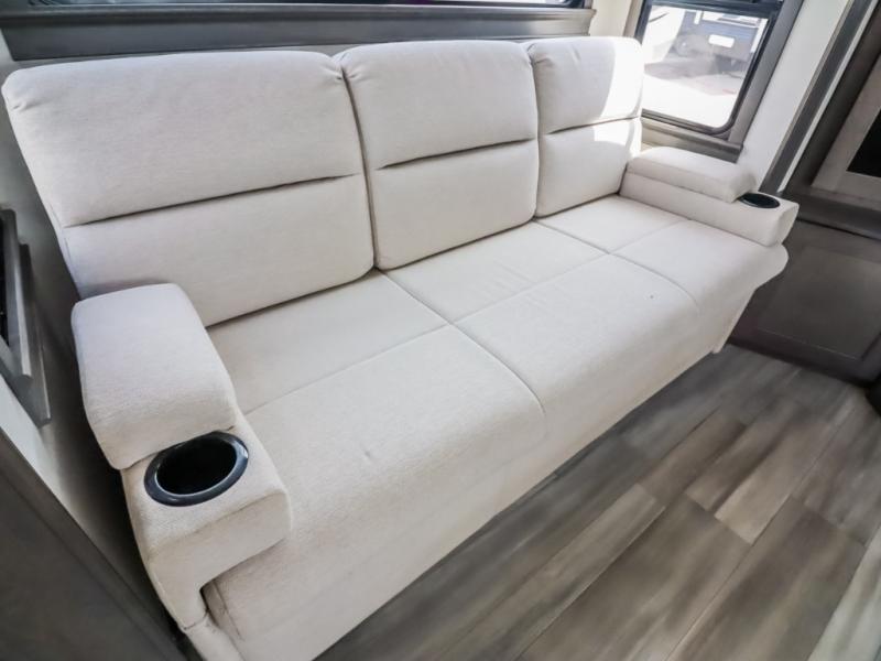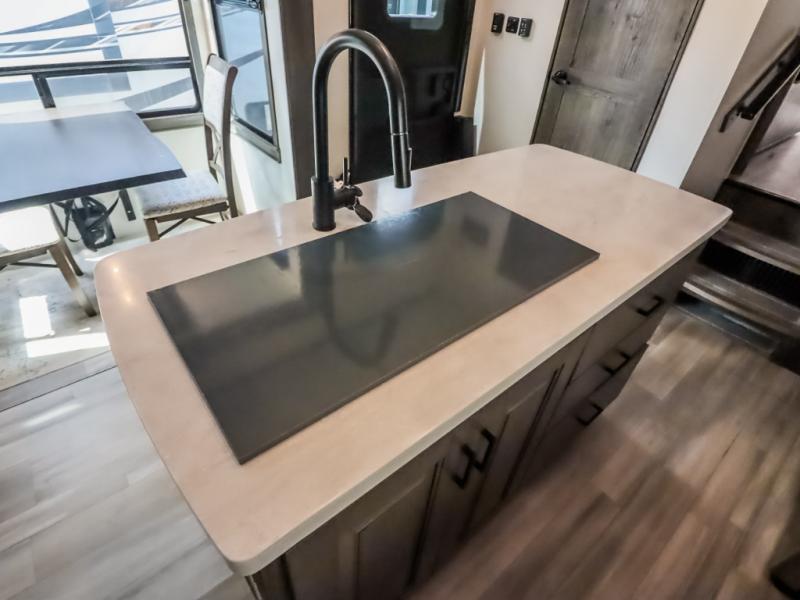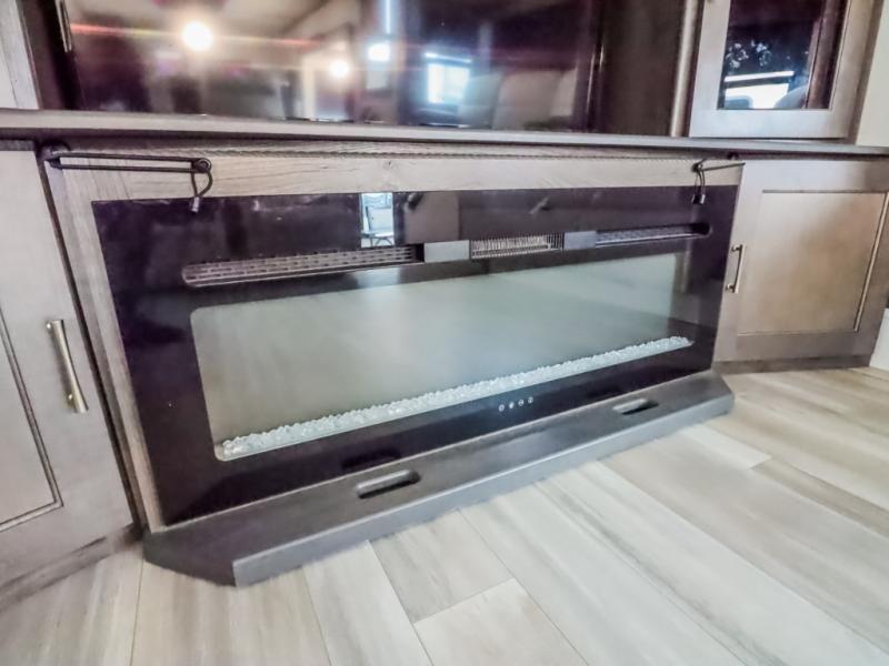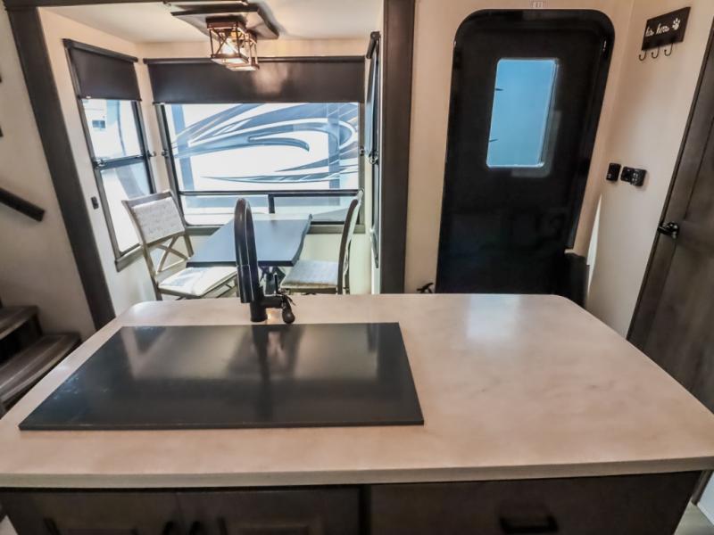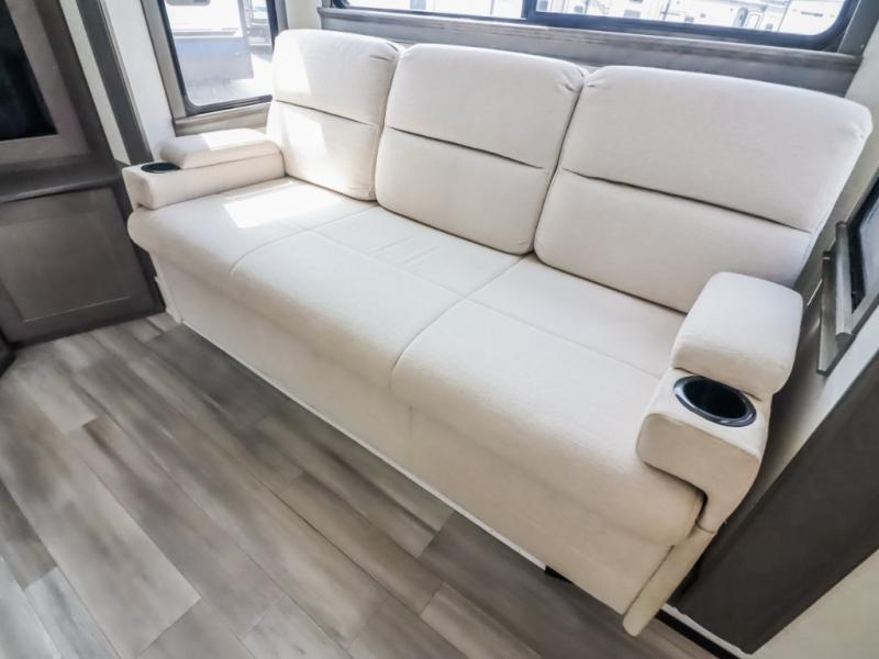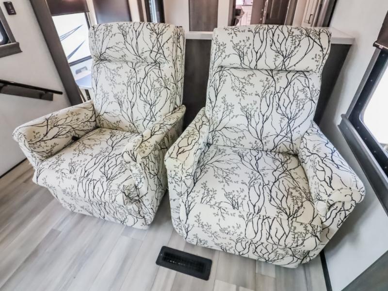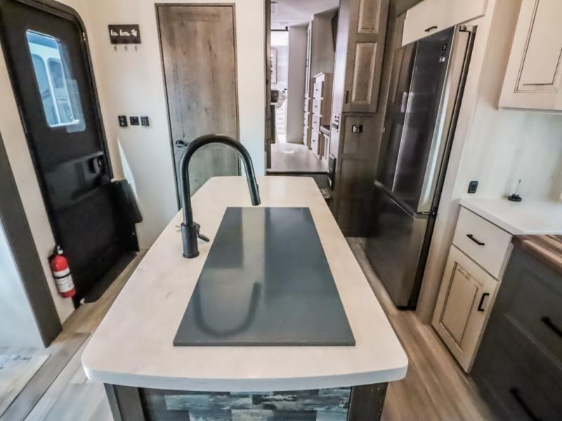 An active family will want this fifth wheel with its exterior basement pull-out tray that measures at 48" x 115" to load up your kayaks and such. Just above this area is the master suite with a rear bathroom that offers a residential shower, a porcelain toilet with soft close seat, plus a wardrobe and shelf storage. The king bed slide gives you more floor space, and you will have a seat, a flip-top dresser, and a Smart TV to watch. The half bath is next to the main entry which is super convenient, and the middle kitchen is separate from the front living area. The cook will love the residential microwave, range and oven, plus the option to add a residential refrigerator, plus the pantry, and the extra counter space on the kitchen island with a stainless steel farm sink. And the views out of the atrium windows in the slide out which includes the floating dinette table are a must see. And when you need to watch the big game, the 55" Smart TV with pull-out fireplace below are up front with the dual recliner love seat and two sleeper sofas.