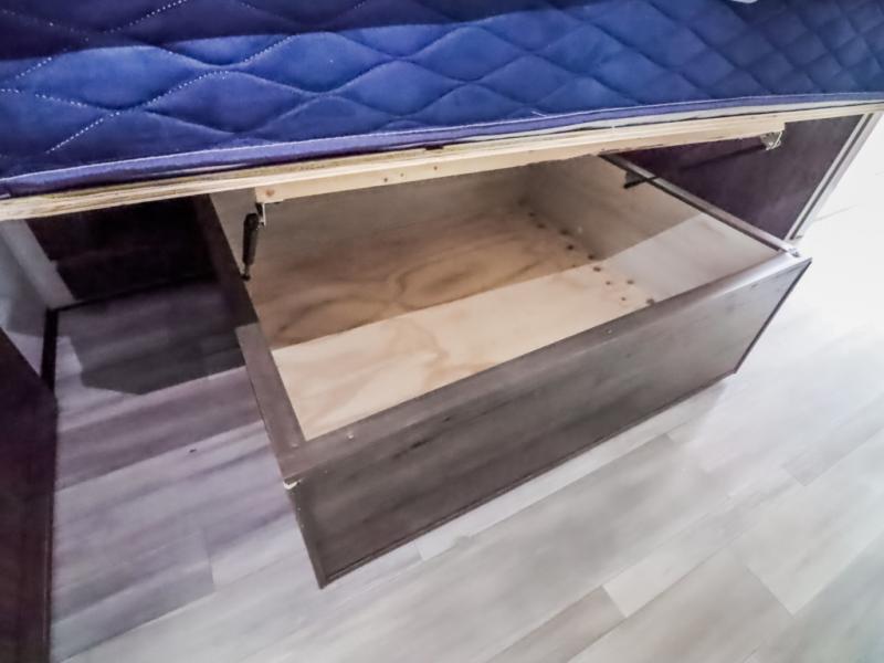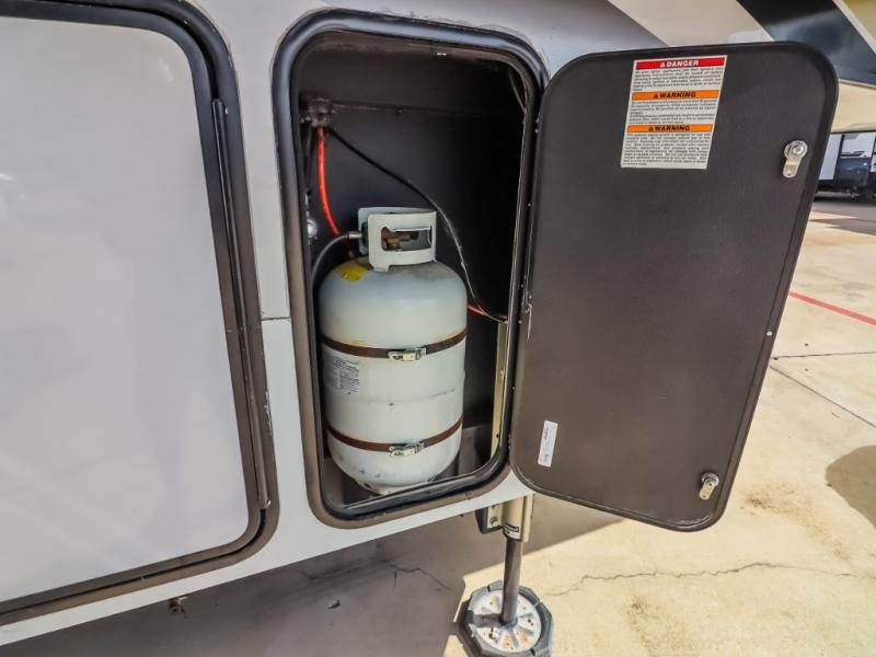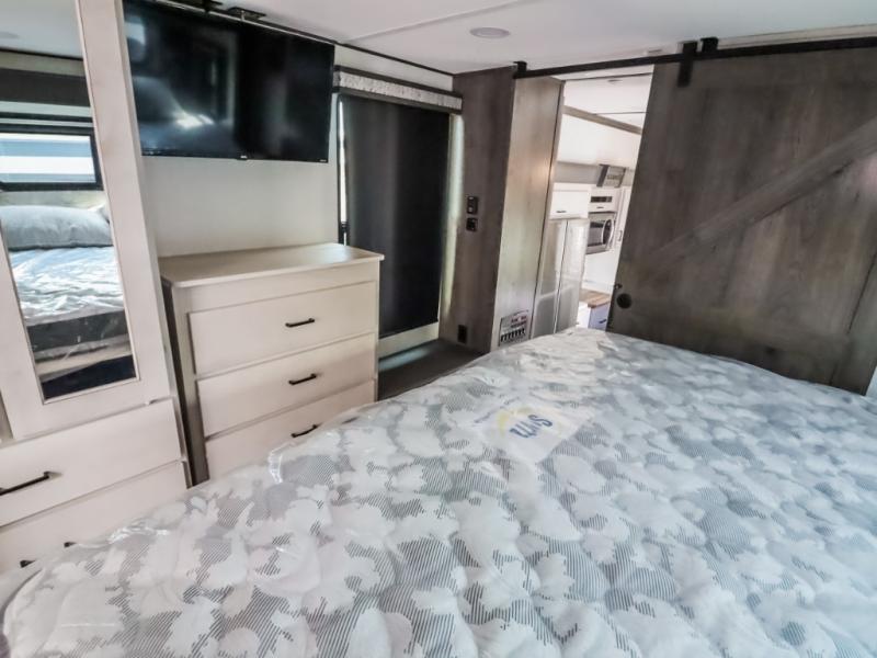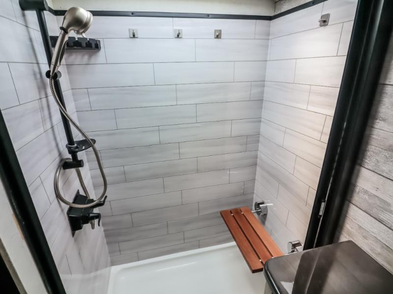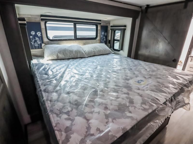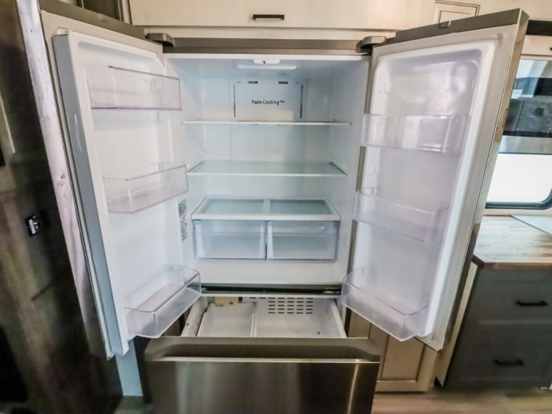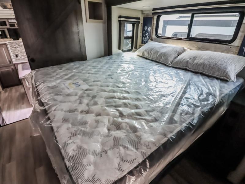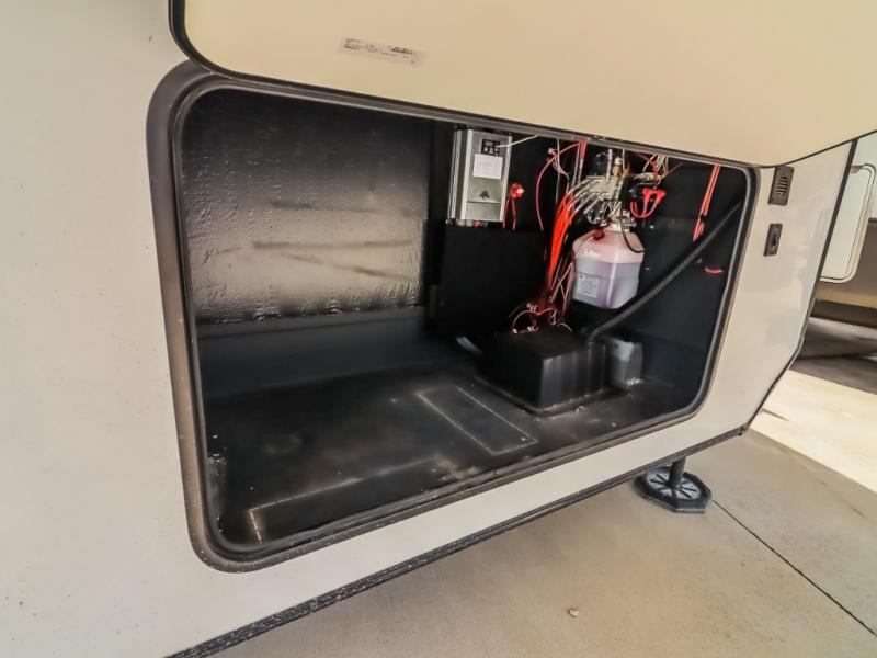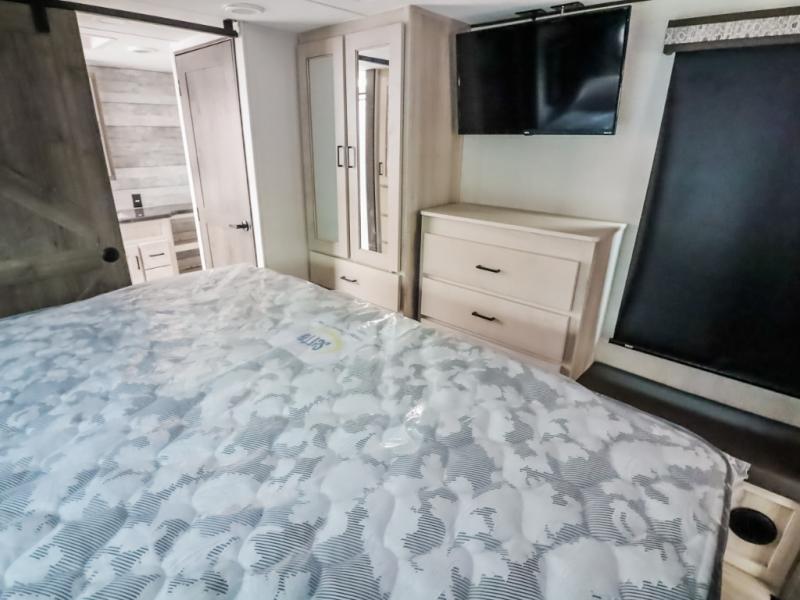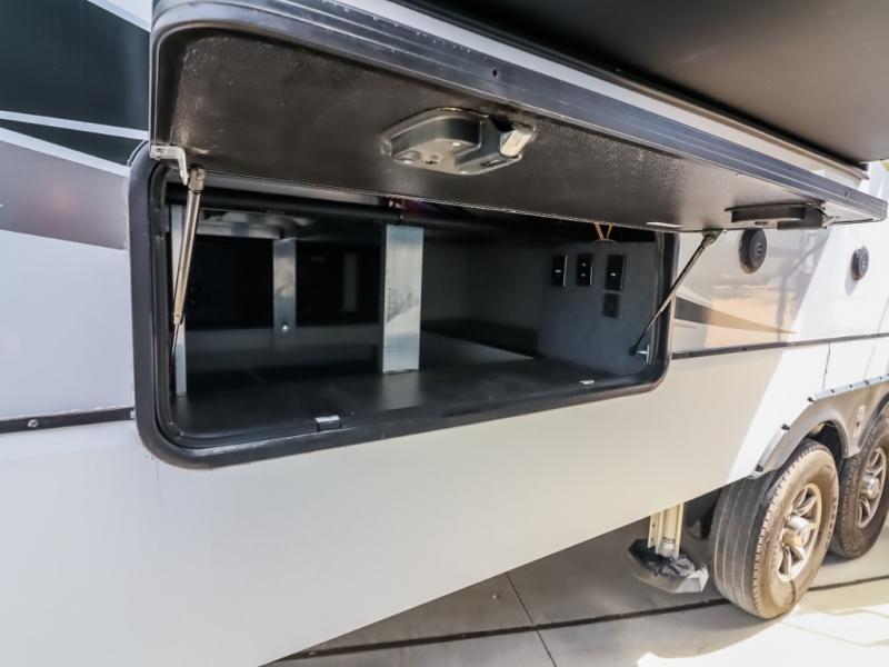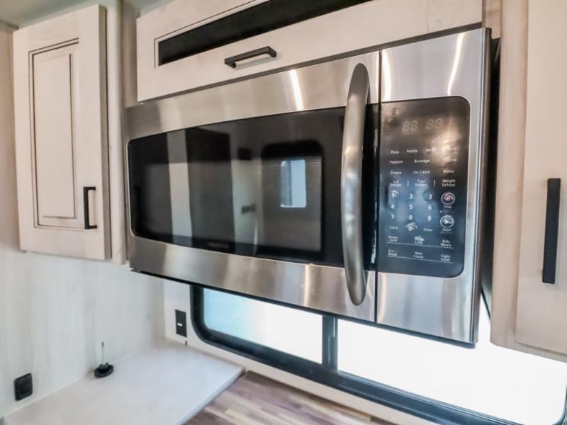An active family will want this fifth wheel with its exterior basement pull-out tray that measures at 48" x 115" to load up your kayaks and such. Just above this area is the master suite with a rear bathroom that offers a residential shower, a porcelain toilet with soft close seat, plus a wardrobe and shelf storage. The king bed slide gives you more floor space, and you will have a seat, a flip-top dresser, and a Smart TV to watch. The half bath is next to the main entry which is super convenient, and the middle kitchen is separate from the front living area. The cook will love the residential microwave, range and oven, plus the option to add a residential refrigerator, plus the pantry, and the extra counter space on the kitchen island with a stainless steel farm sink. And the views out of the atrium windows in the slide out which includes the floating dinette table are a must see. And when you need to watch the big game, the 55" Smart TV with pull-out fireplace below are up front with the dual recliner love seat and two sleeper sofas.