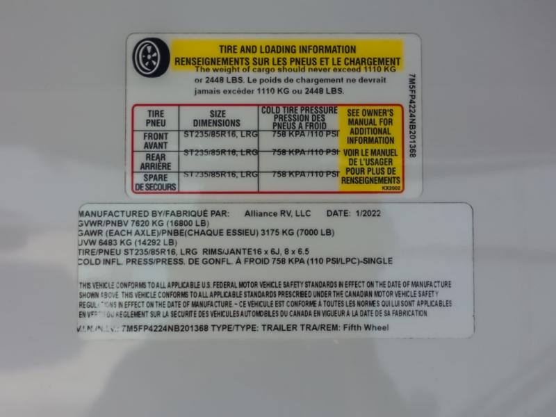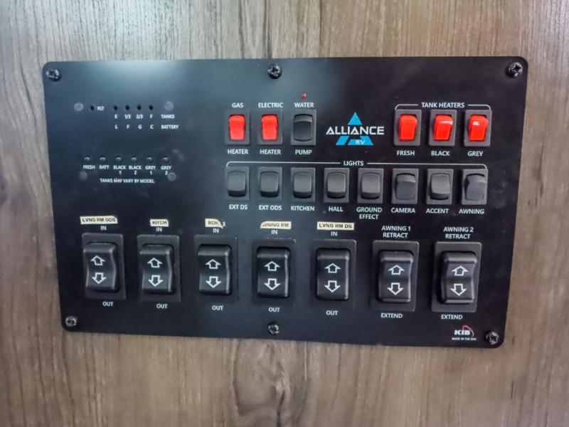 With any Paradigm fifth wheel by Alliance RV, you will experience the next generation advanced frame technology with heavy duty performance running gear. The Benchmark chassis features solid steel 10" l-beam main rails with a 2" torsion tube welded where the running gear attaches, drop frame storage area, flush upper deck design, reinforced goose neck area and a Rota-Flex pin box. The six-point hydraulic auto leveling is faster, stronger and quieter allowing you to enjoy more time away, and the PVC roof is more puncture resistant, ultra bright white and more solar reflective to help keep your fifth wheel cool. The triple 13,500 BTU A/Cs are ultra quiet, independently controlled direct flow A/C units that maximize cooling capacity, plus the 40,000 BTU furnace has flex ducts connected to formed ducts in the floor, and there are dedicated heat vents into the basement and underbelly to keep the tanks and your gear cozy warm during the cooler seasons. Choose luxury, choose convenience, choose to own the best, a Paradigm!