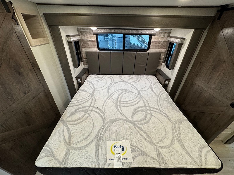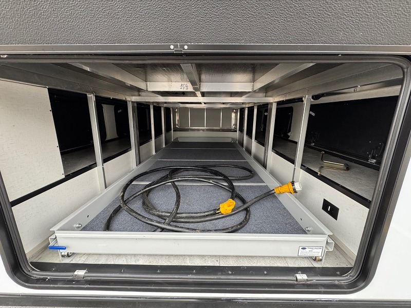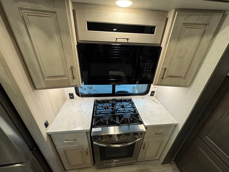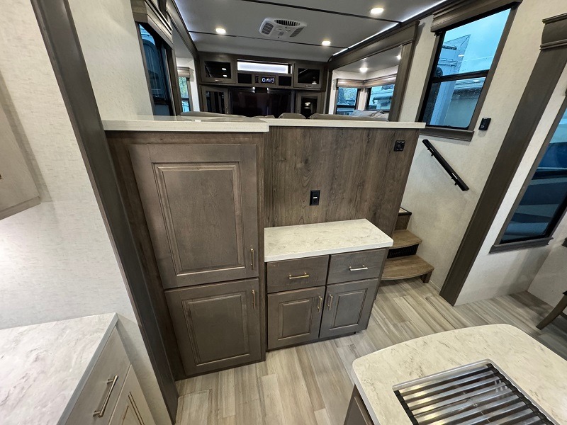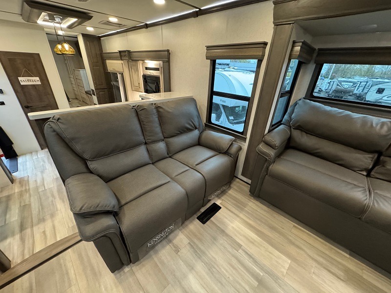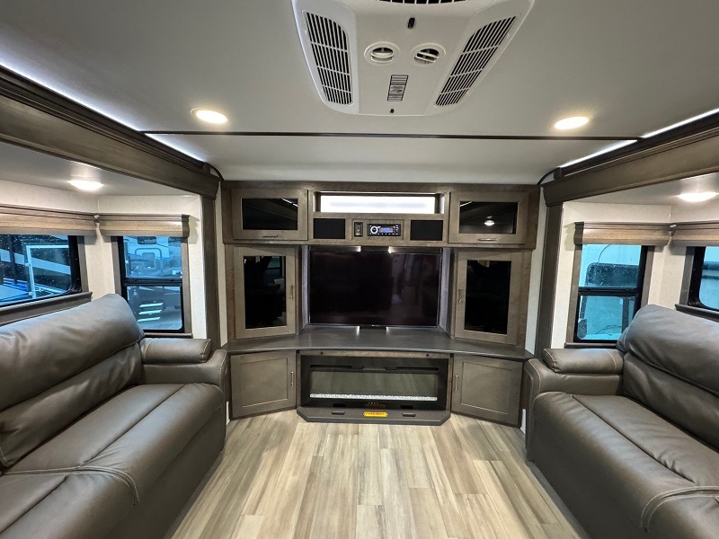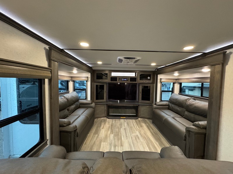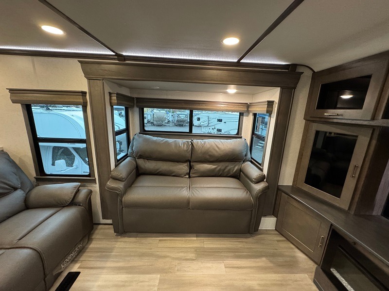 An active family will want this fifth wheel with its exterior basement pull-out tray that measures at 48" x 115" to load up your kayaks and such. Just above this area is the master suite with a rear bathroom that offers a residential shower, a porcelain toilet with soft close seat, plus a wardrobe and shelf storage. The king bed slide gives you more floor space, and you will have a seat, a flip-top dresser, and a Smart TV to watch. The half bath is next to the main entry which is super convenient, and the middle kitchen is separate from the front living area. The cook will love the residential microwave, range and oven, plus the option to add a residential refrigerator, plus the pantry, and the extra counter space on the kitchen island with a stainless steel farm sink. And the views out of the atrium windows in the slide out which includes the floating dinette table are a must see. And when you need to watch the big game, the 55" Smart TV with pull-out fireplace below are up front with the dual recliner love seat and two sleeper sofas.