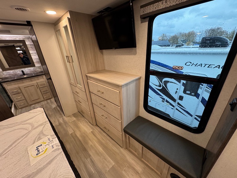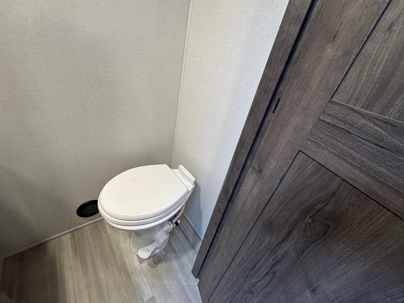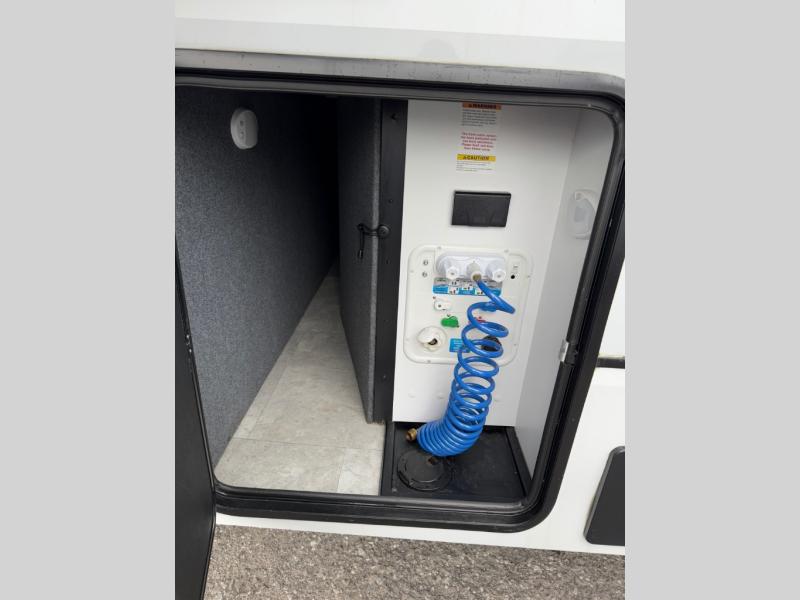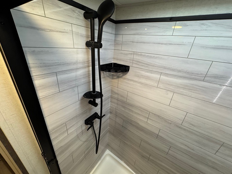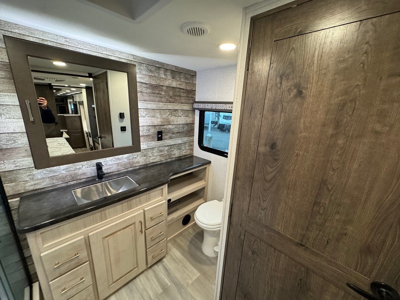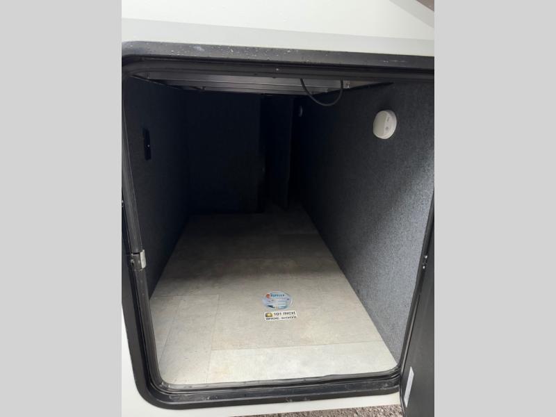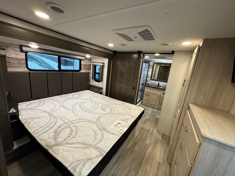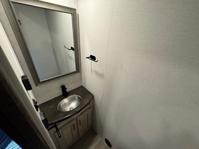 An active family will want this fifth wheel with its exterior basement pull-out tray that measures at 48" x 115" to load up your kayaks and such. Just above this area is the master suite with a rear bathroom that offers a residential shower, a porcelain toilet with soft close seat, plus a wardrobe and shelf storage. The king bed slide gives you more floor space, and you will have a seat, a flip-top dresser, and a Smart TV to watch. The half bath is next to the main entry which is super convenient, and the middle kitchen is separate from the front living area. The cook will love the residential microwave, range and oven, plus the option to add a residential refrigerator, plus the pantry, and the extra counter space on the kitchen island with a stainless steel farm sink. And the views out of the atrium windows in the slide out which includes the floating dinette table are a must see. And when you need to watch the big game, the 55" Smart TV with pull-out fireplace below are up front with the dual recliner love seat and two sleeper sofas.