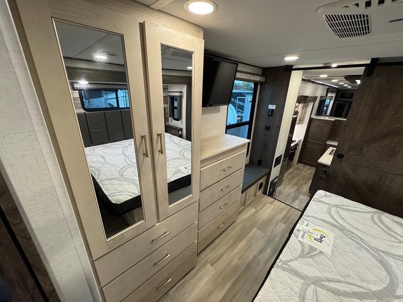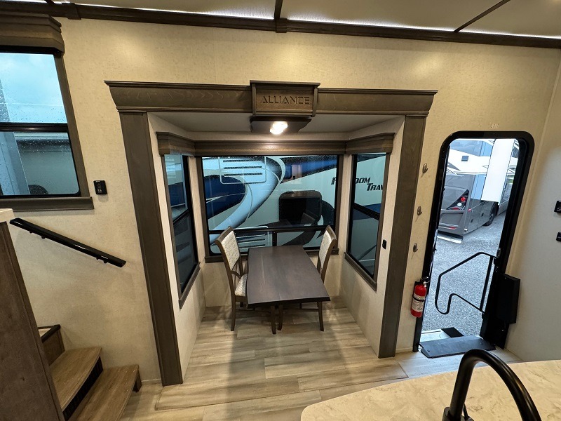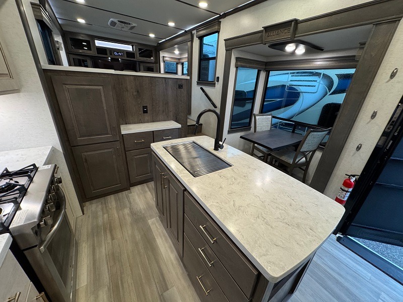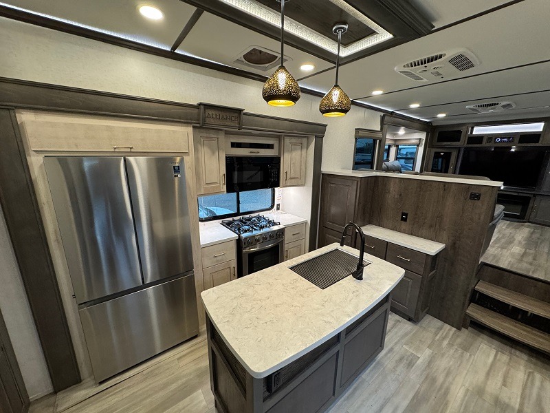 With any Paradigm fifth wheel by Alliance RV, you will experience the next generation advanced frame technology with heavy duty performance running gear. The Benchmark chassis features solid steel 10" l-beam main rails with a 2" torsion tube welded where the running gear attaches, drop frame storage area, flush upper deck design, reinforced goose neck area and a Rota-Flex pin box. The six-point hydraulic auto leveling is faster, stronger and quieter allowing you to enjoy more time away, and the PVC roof is more puncture resistant, ultra bright white and more solar reflective to help keep your fifth wheel cool. The triple 13,500 BTU A/Cs are ultra quiet, independently controlled direct flow A/C units that maximize cooling capacity, plus the 40,000 BTU furnace has flex ducts connected to formed ducts in the floor, and there are dedicated heat vents into the basement and underbelly to keep the tanks and your gear cozy warm during the cooler seasons. Choose luxury, choose convenience, choose to own the best, a Paradigm!