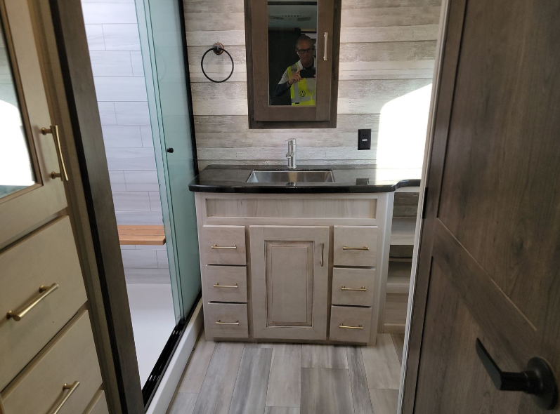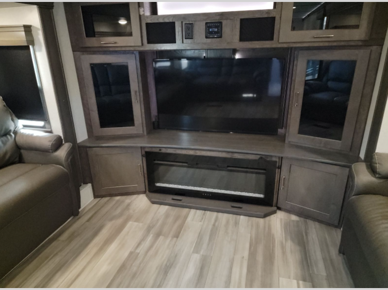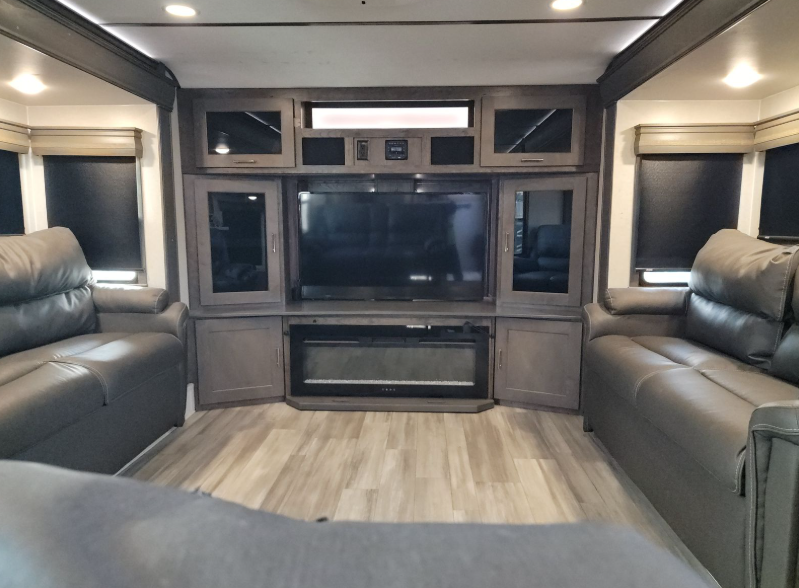 An active family will want this fifth wheel with its exterior basement pull-out tray that measures at 48" x 115" to load up your kayaks and such. Just above this area is the master suite with a rear bathroom that offers a residential shower, a porcelain toilet with soft close seat, plus a wardrobe and shelf storage. The king bed slide gives you more floor space, and you will have a seat, a flip-top dresser, and a Smart TV to watch. The half bath is next to the main entry which is super convenient, and the middle kitchen is separate from the front living area. The cook will love the residential microwave, range and oven, plus the option to add a residential refrigerator, plus the pantry, and the extra counter space on the kitchen island with a stainless steel farm sink. And the views out of the atrium windows in the slide out which includes the floating dinette table are a must see. And when you need to watch the big game, the 55" Smart TV with pull-out fireplace below are up front with the dual recliner love seat and two sleeper sofas.