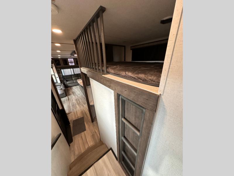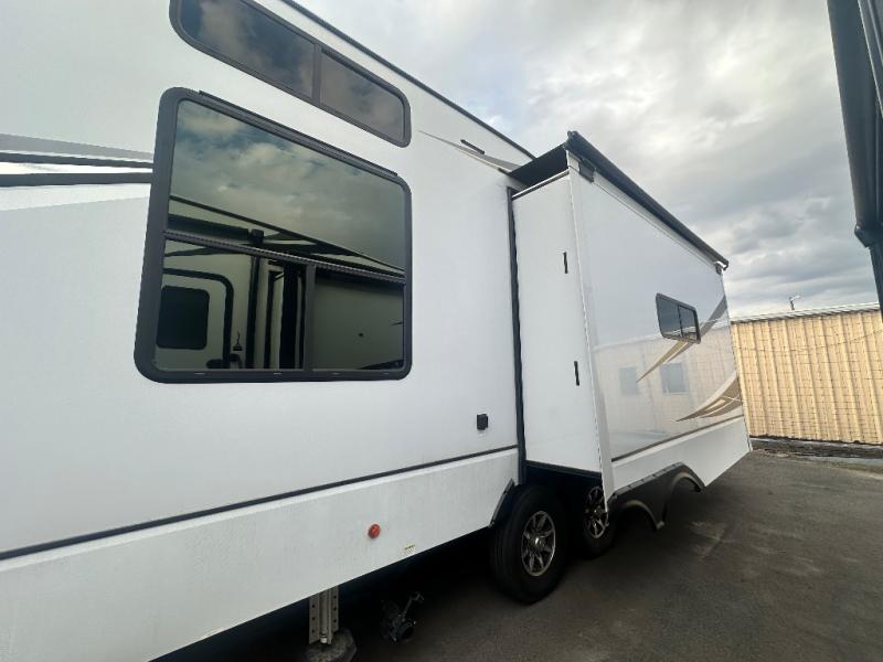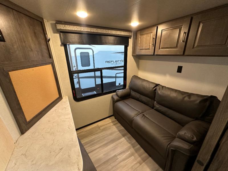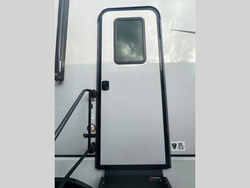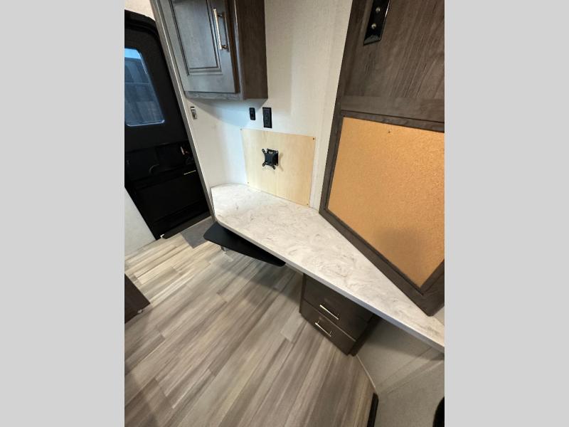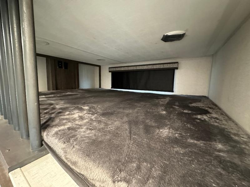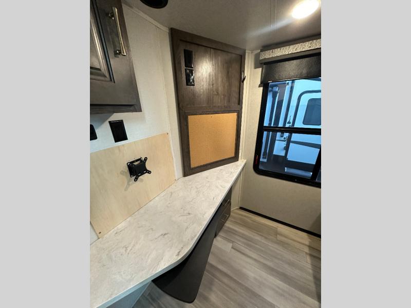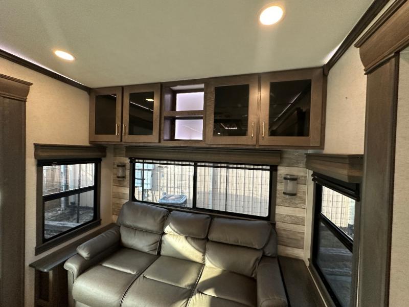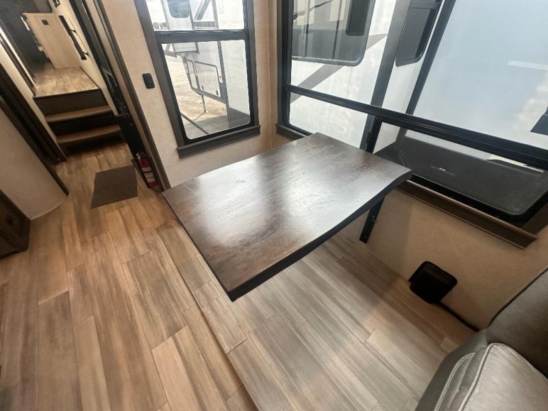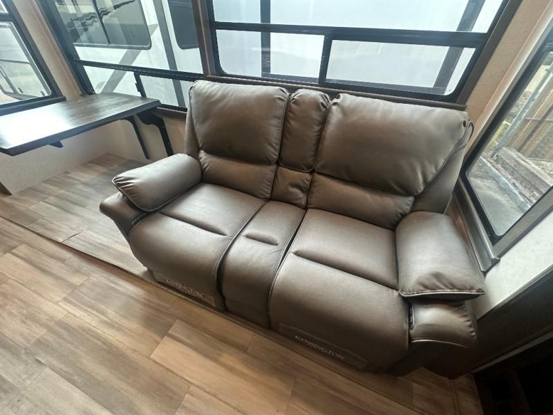 Looking to work while traveling or prefer to have a guest room when friends and family stay overnight? This fifth wheel might just be the answer thanks to the versatile room with a sleeper sofa, overhead storage and a countertop to work from if you wish. You will find a loft above with a ladder for more sleeping or storage space. The full bathroom is between this room and the front master bedroom which offers a king bed slide or choose a queen, a large front wardrobe with a space for a washer/dryer option, a flip-top dresser and a seat to utilize when getting ready. Everyone can gather in the main living and kitchen area that offers residential appliances with the option to add a residential refrigerator, a kitchen island with a space to add the dishwasher option, two pantries, a hutch, and plenty of seating. You can choose from the sleeper sofa, the dual recliner love seat and/or the floating dinette table with four chairs. There is more, step inside!
