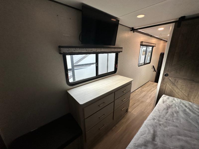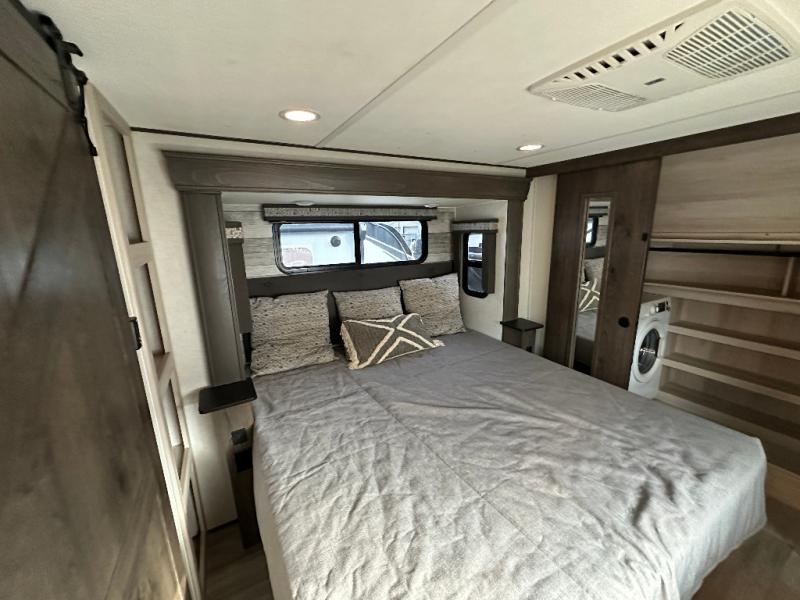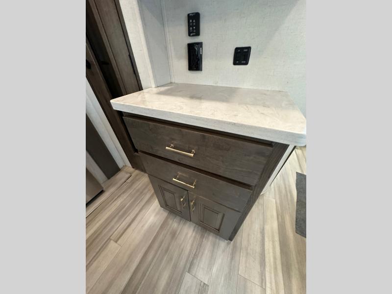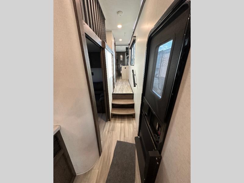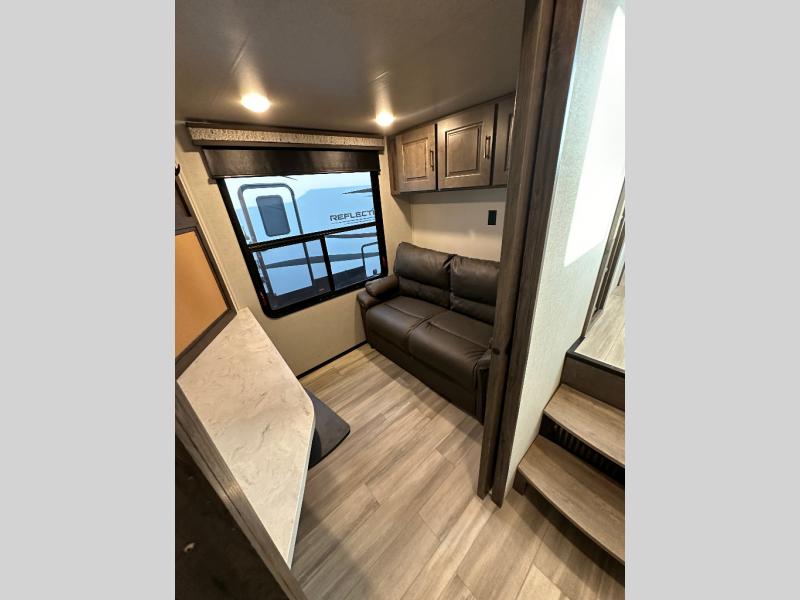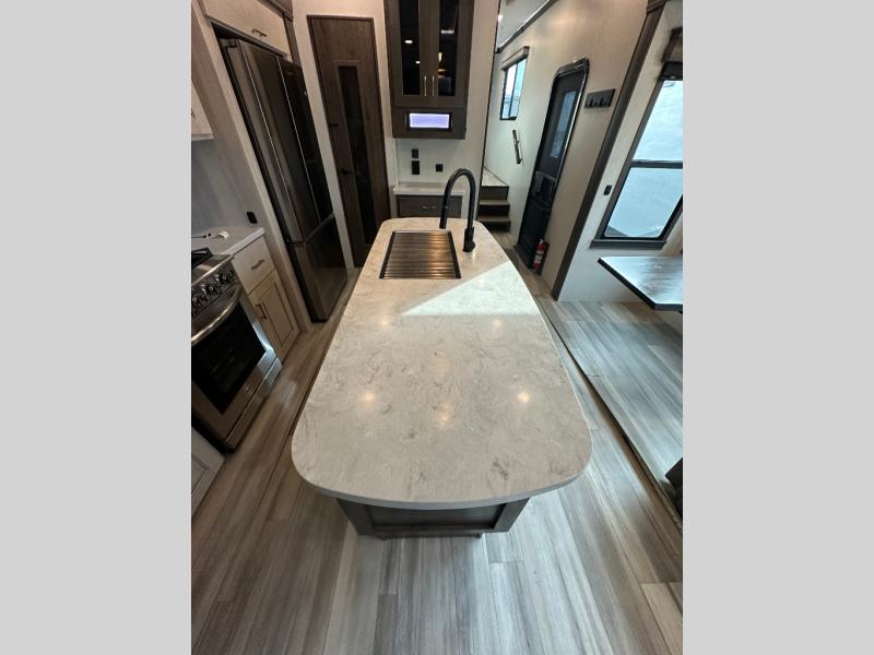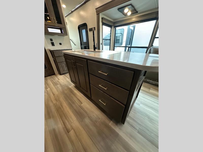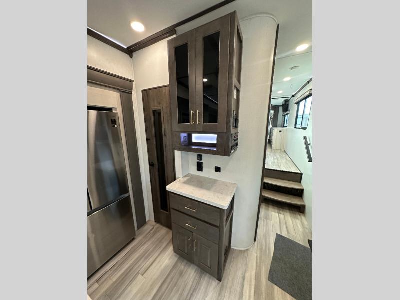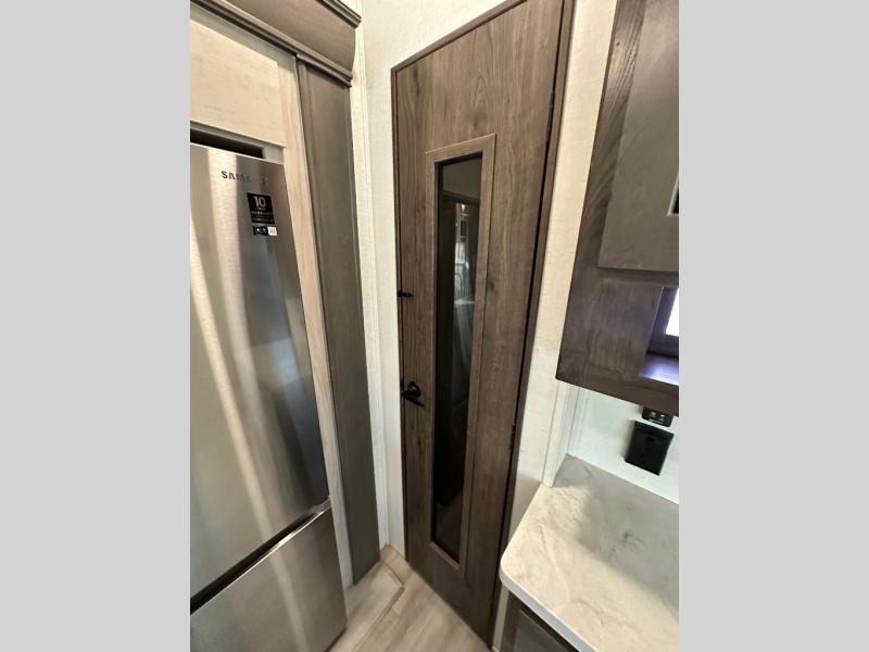 Looking to work while traveling or prefer to have a guest room when friends and family stay overnight? This fifth wheel might just be the answer thanks to the versatile room with a sleeper sofa, overhead storage and a countertop to work from if you wish. You will find a loft above with a ladder for more sleeping or storage space. The full bathroom is between this room and the front master bedroom which offers a king bed slide or choose a queen, a large front wardrobe with a space for a washer/dryer option, a flip-top dresser and a seat to utilize when getting ready. Everyone can gather in the main living and kitchen area that offers residential appliances with the option to add a residential refrigerator, a kitchen island with a space to add the dishwasher option, two pantries, a hutch, and plenty of seating. You can choose from the sleeper sofa, the dual recliner love seat and/or the floating dinette table with four chairs. There is more, step inside!