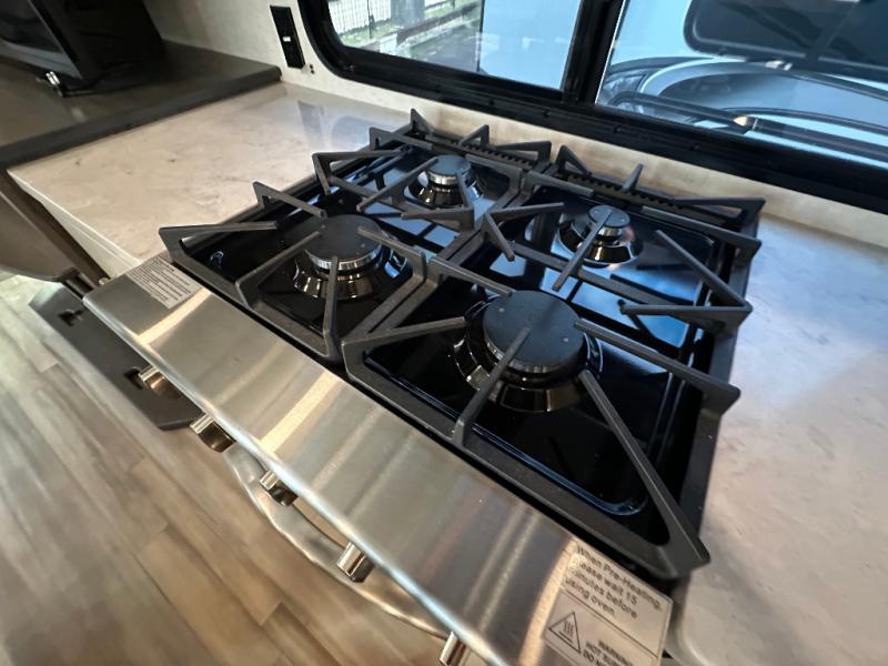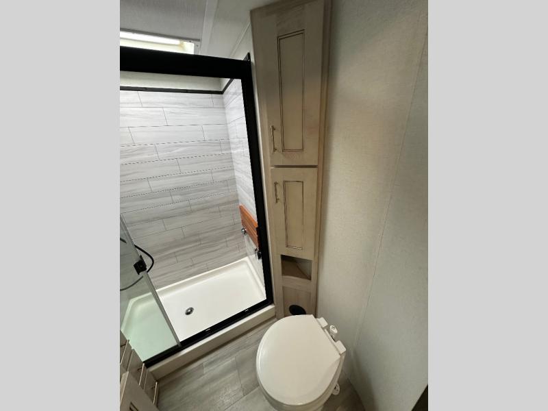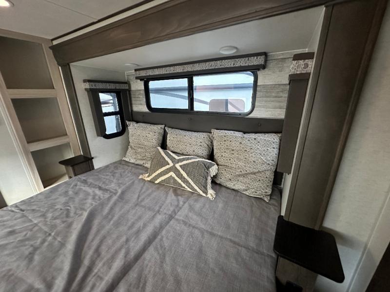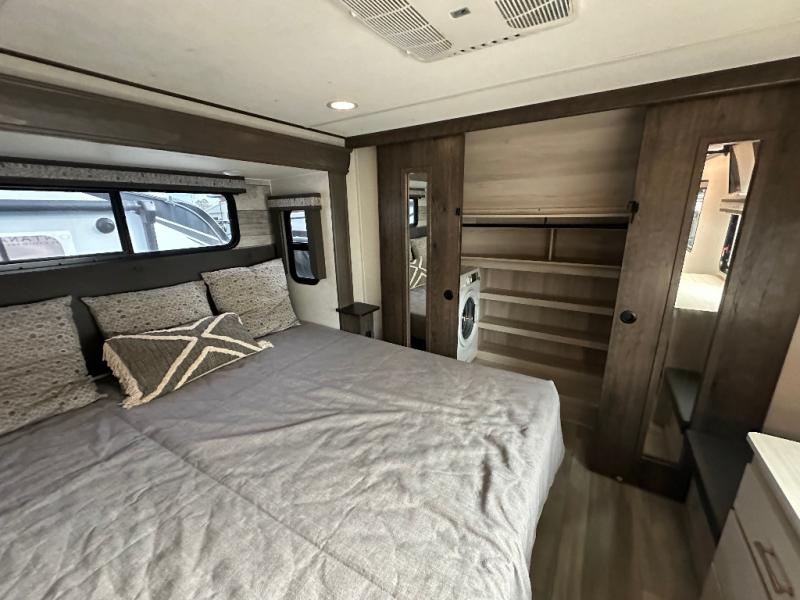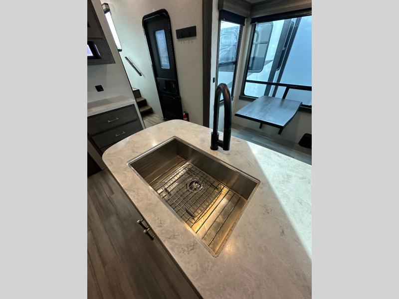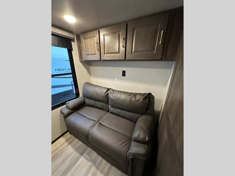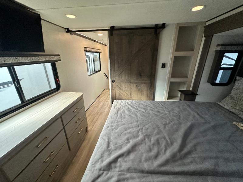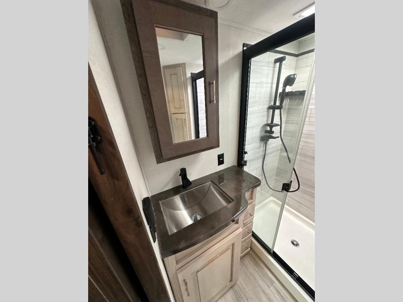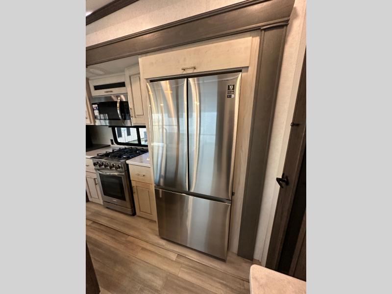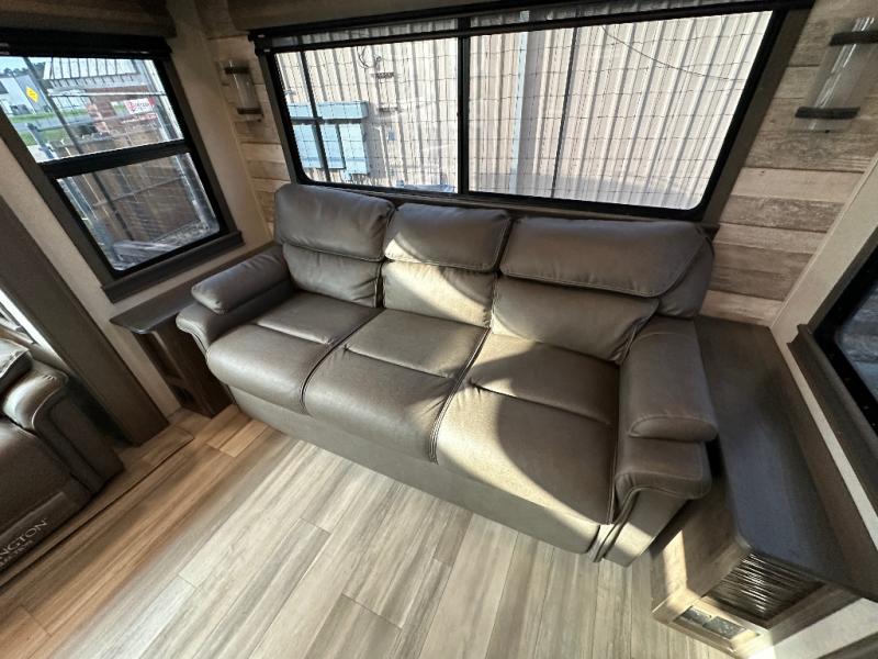 Looking to work while traveling or prefer to have a guest room when friends and family stay overnight? This fifth wheel might just be the answer thanks to the versatile room with a sleeper sofa, overhead storage and a countertop to work from if you wish. You will find a loft above with a ladder for more sleeping or storage space. The full bathroom is between this room and the front master bedroom which offers a king bed slide or choose a queen, a large front wardrobe with a space for a washer/dryer option, a flip-top dresser and a seat to utilize when getting ready. Everyone can gather in the main living and kitchen area that offers residential appliances with the option to add a residential refrigerator, a kitchen island with a space to add the dishwasher option, two pantries, a hutch, and plenty of seating. You can choose from the sleeper sofa, the dual recliner love seat and/or the floating dinette table with four chairs. There is more, step inside!