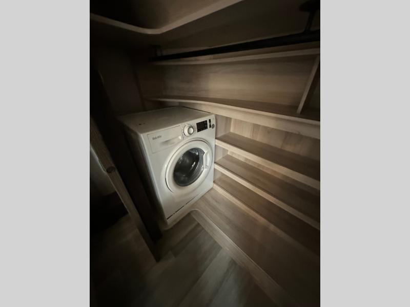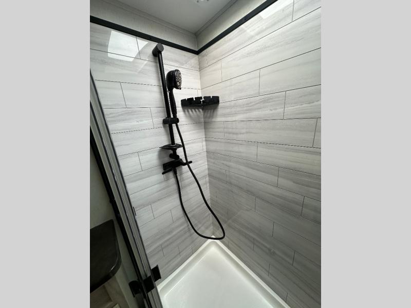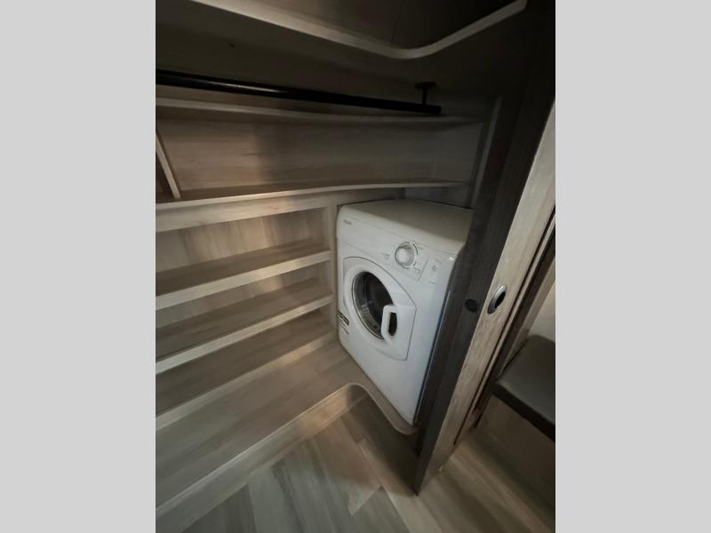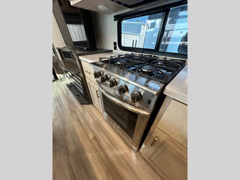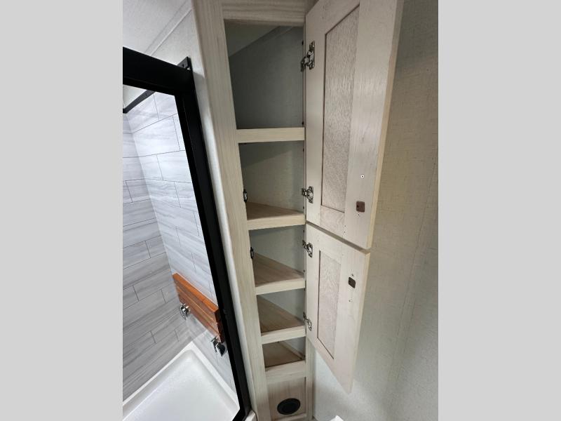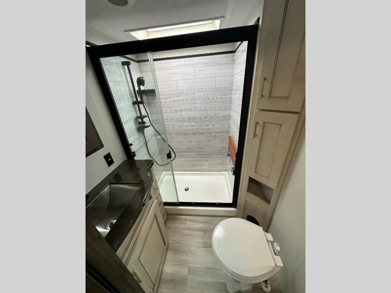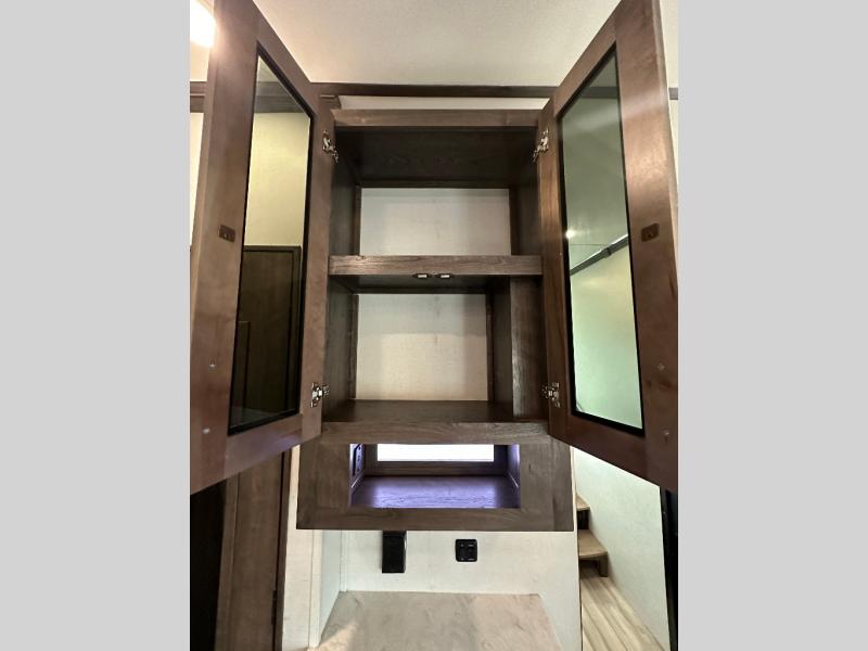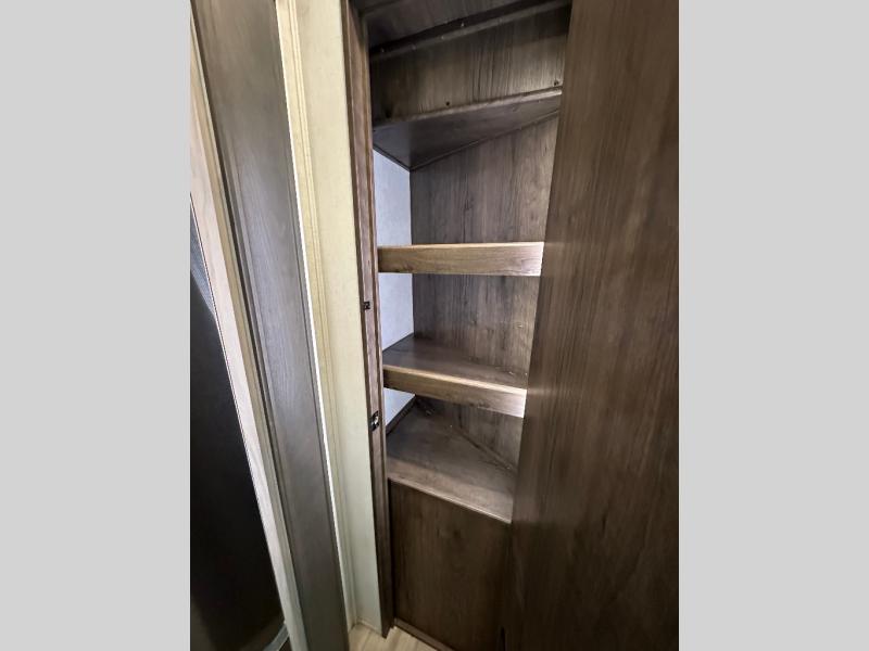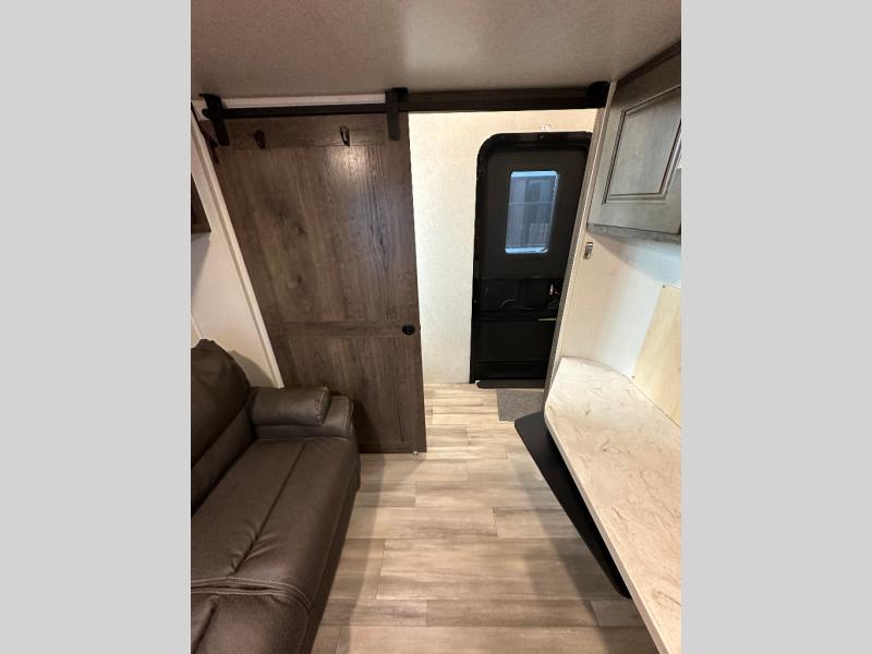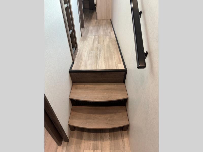 Looking to work while traveling or prefer to have a guest room when friends and family stay overnight? This fifth wheel might just be the answer thanks to the versatile room with a sleeper sofa, overhead storage and a countertop to work from if you wish. You will find a loft above with a ladder for more sleeping or storage space. The full bathroom is between this room and the front master bedroom which offers a king bed slide or choose a queen, a large front wardrobe with a space for a washer/dryer option, a flip-top dresser and a seat to utilize when getting ready. Everyone can gather in the main living and kitchen area that offers residential appliances with the option to add a residential refrigerator, a kitchen island with a space to add the dishwasher option, two pantries, a hutch, and plenty of seating. You can choose from the sleeper sofa, the dual recliner love seat and/or the floating dinette table with four chairs. There is more, step inside!