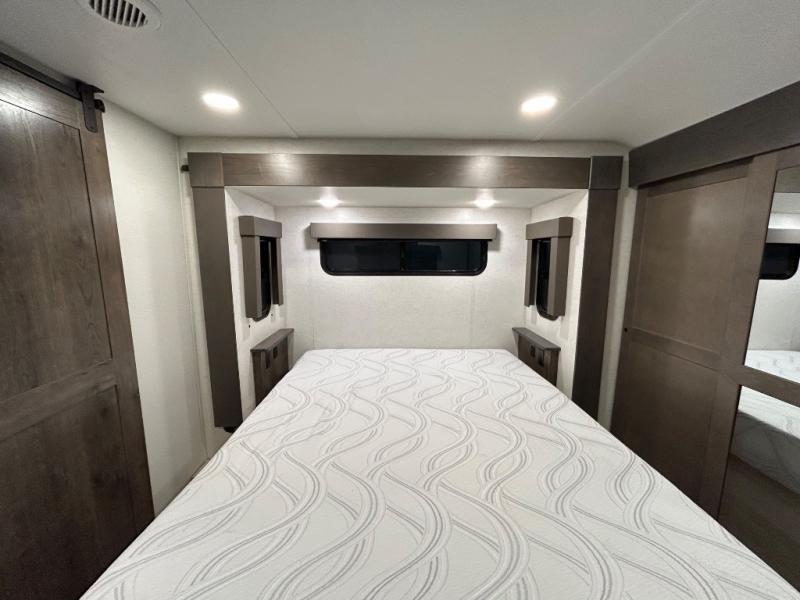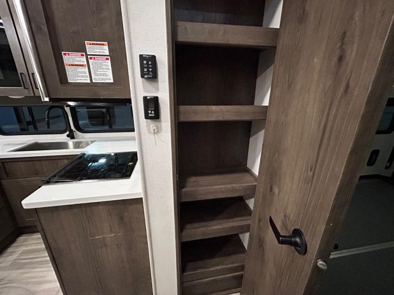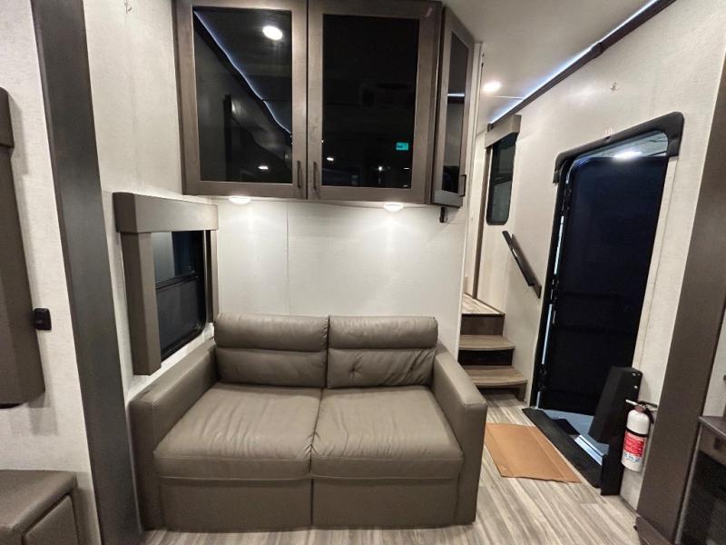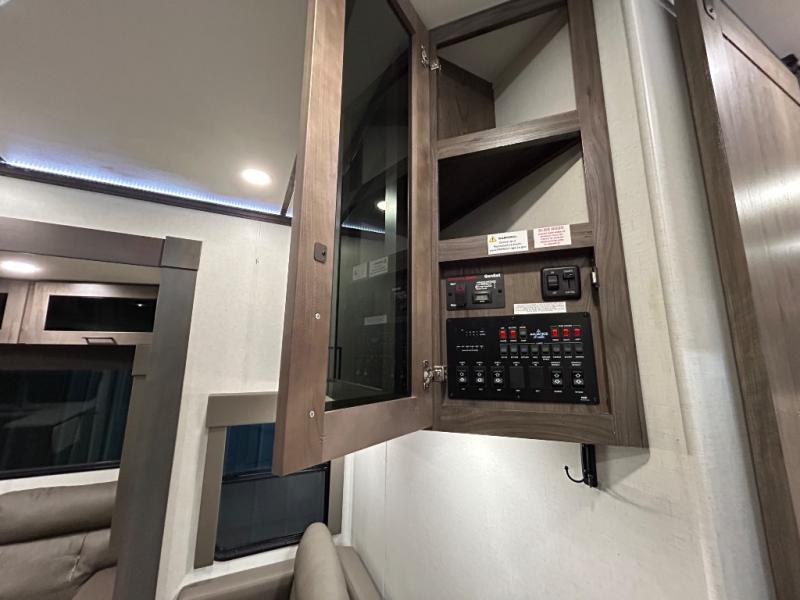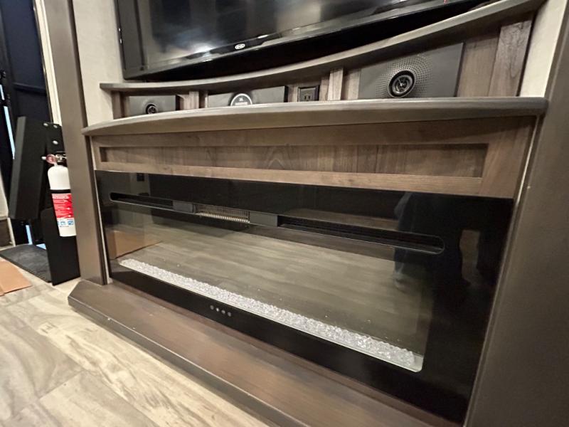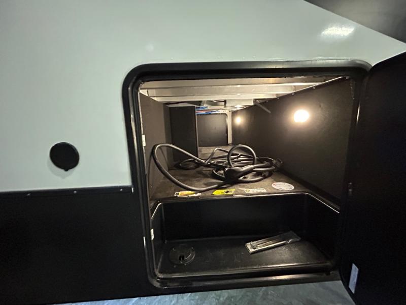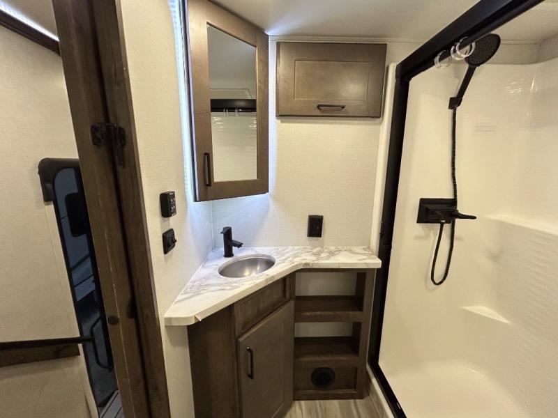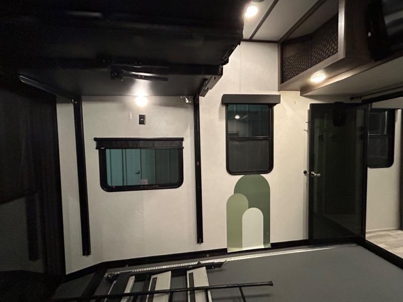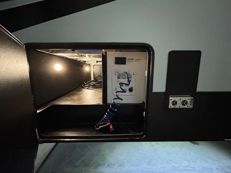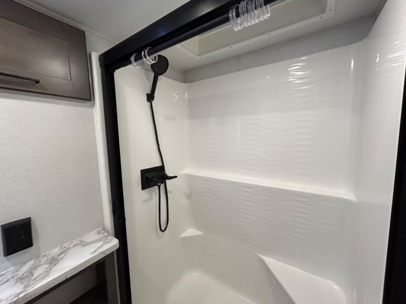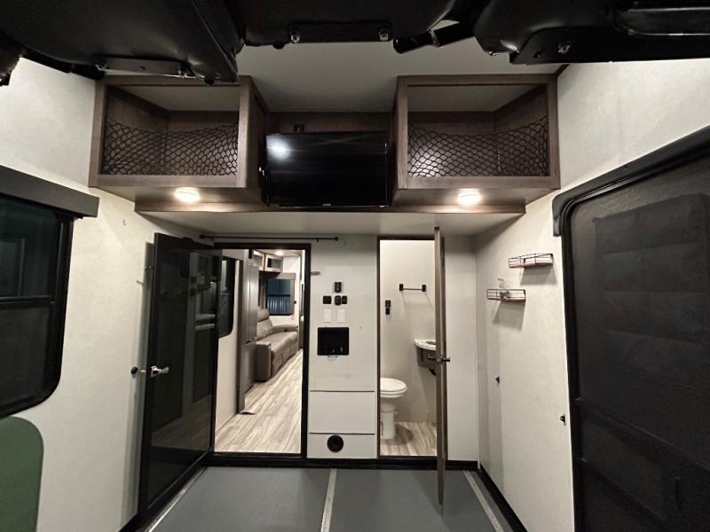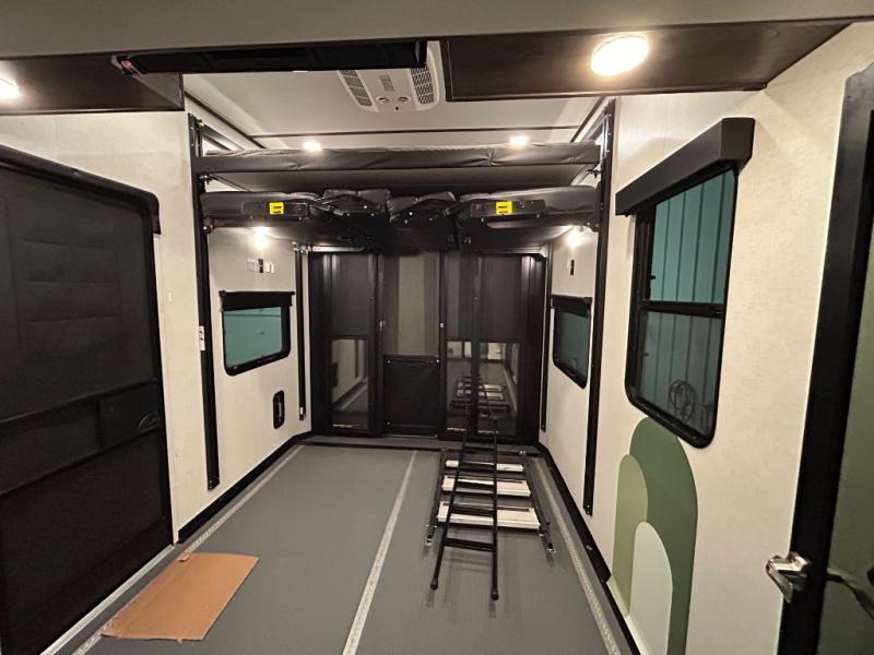 There is room for your off-road toys and the whole family in this toy hauler! The bath and a half makes life more convenient and the dual entry doors create a smooth flow of traffic in and out of the unit. Aside from 13' of garage space, an air compressor, and an entrance/exit door there are also opposing HappiJac sofas with a queen bed above them, a loft that opens to the living room, and a half bathroom. The chef can prepare their best meals with the four burner cooktop while two others sit at the flip up counter with two bar stools. After a fun day on the trails, wash up in the full bathroom with the 48" x 30" shower, grab your pajamas from the front wardrobe or flip top dresser in the front private bedroom then relax on one of the two sofas by the fireplace and Smart TV!