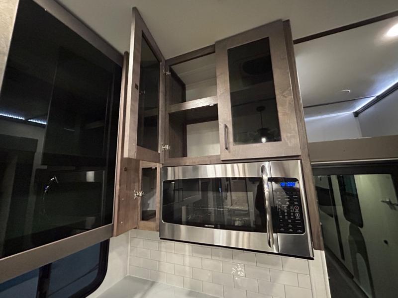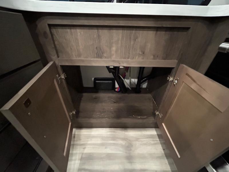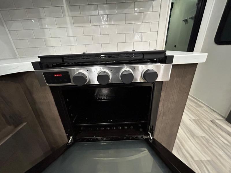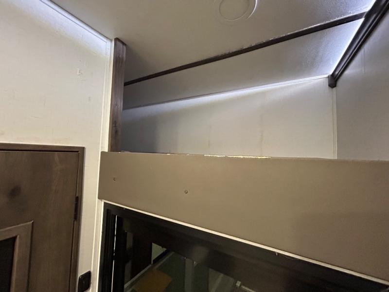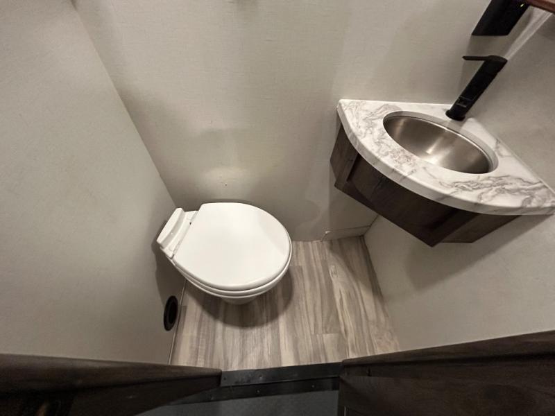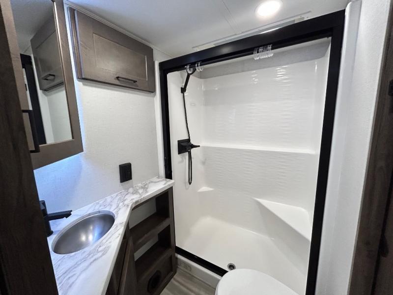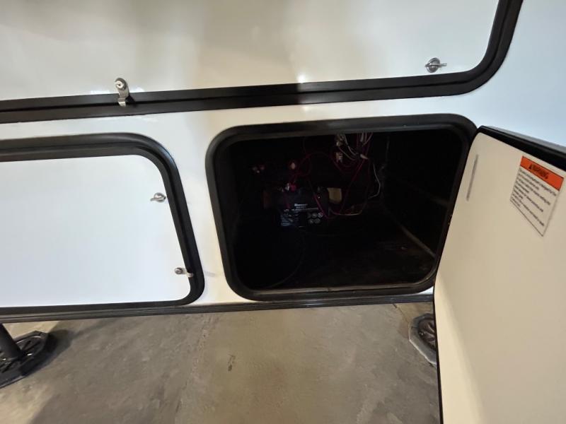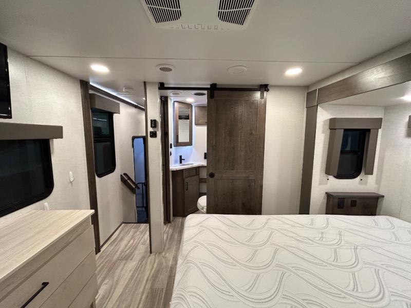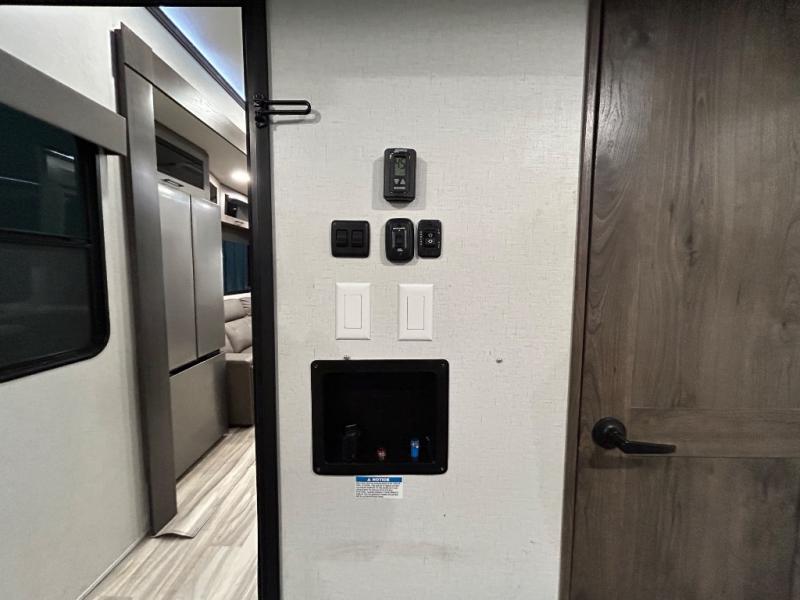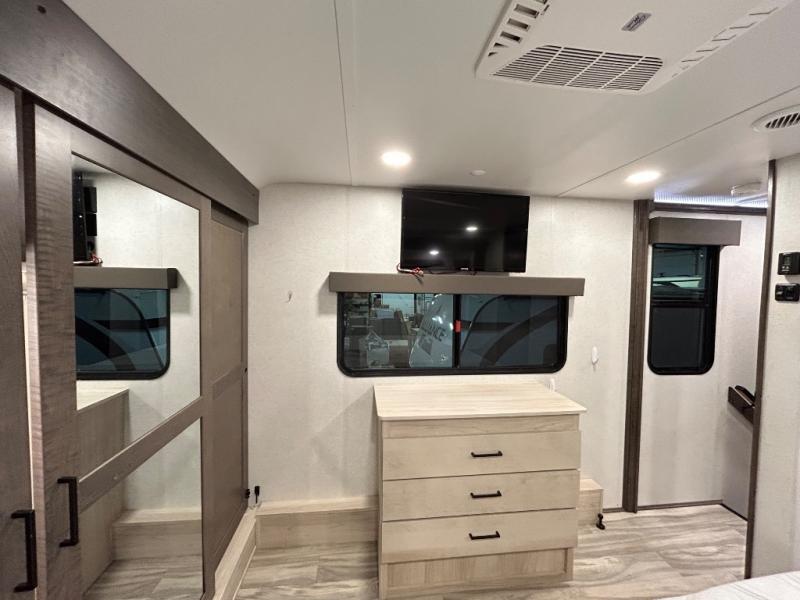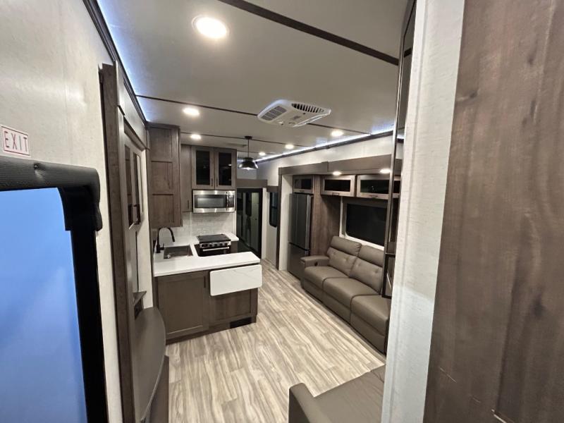 There is room for your off-road toys and the whole family in this toy hauler! The bath and a half makes life more convenient and the dual entry doors create a smooth flow of traffic in and out of the unit. Aside from 13' of garage space, an air compressor, and an entrance/exit door there are also opposing HappiJac sofas with a queen bed above them, a loft that opens to the living room, and a half bathroom. The chef can prepare their best meals with the four burner cooktop while two others sit at the flip up counter with two bar stools. After a fun day on the trails, wash up in the full bathroom with the 48" x 30" shower, grab your pajamas from the front wardrobe or flip top dresser in the front private bedroom then relax on one of the two sofas by the fireplace and Smart TV!