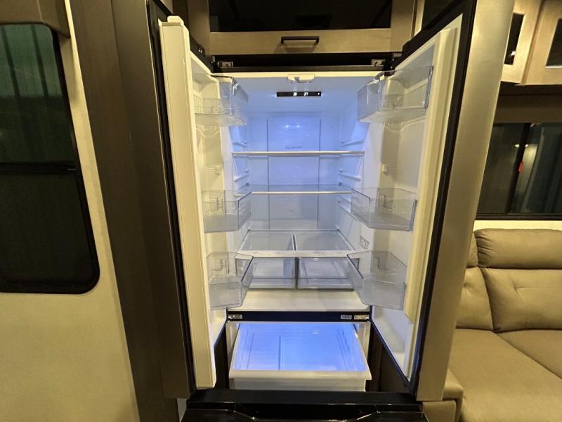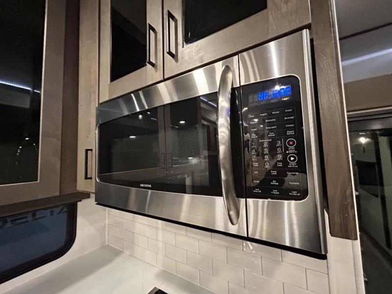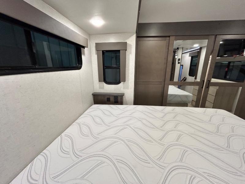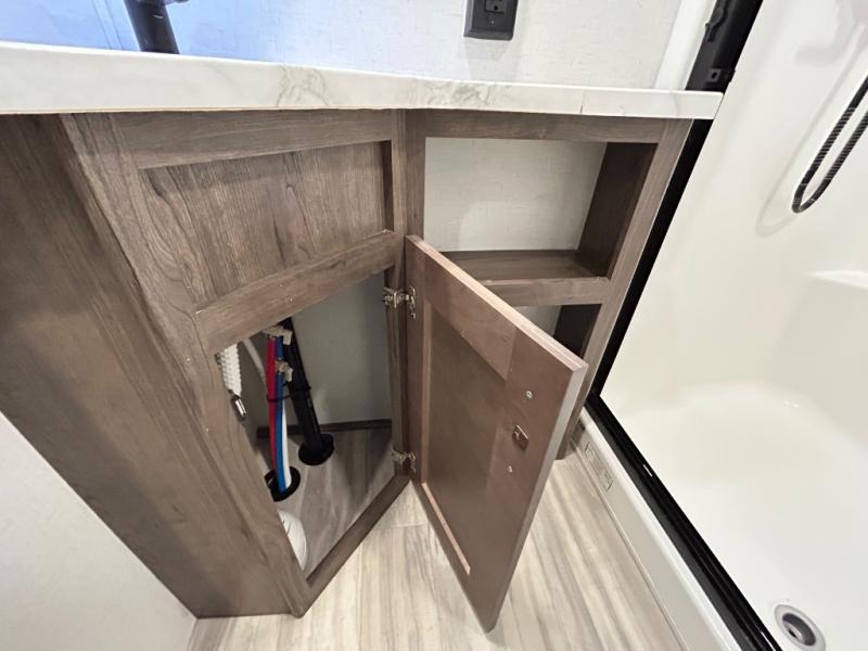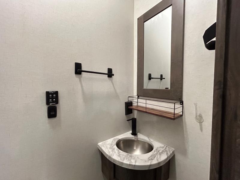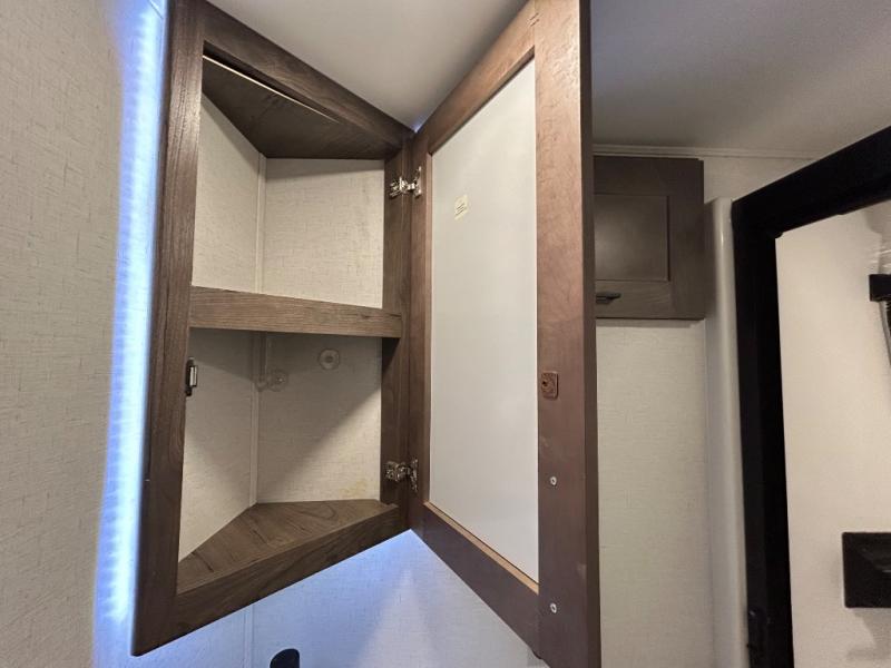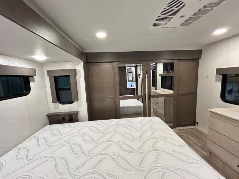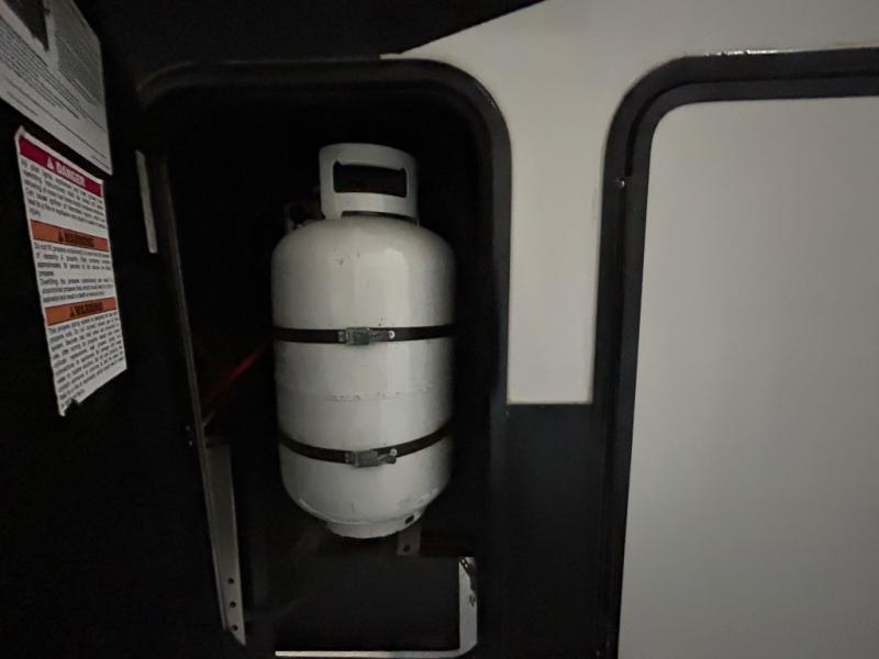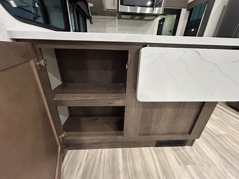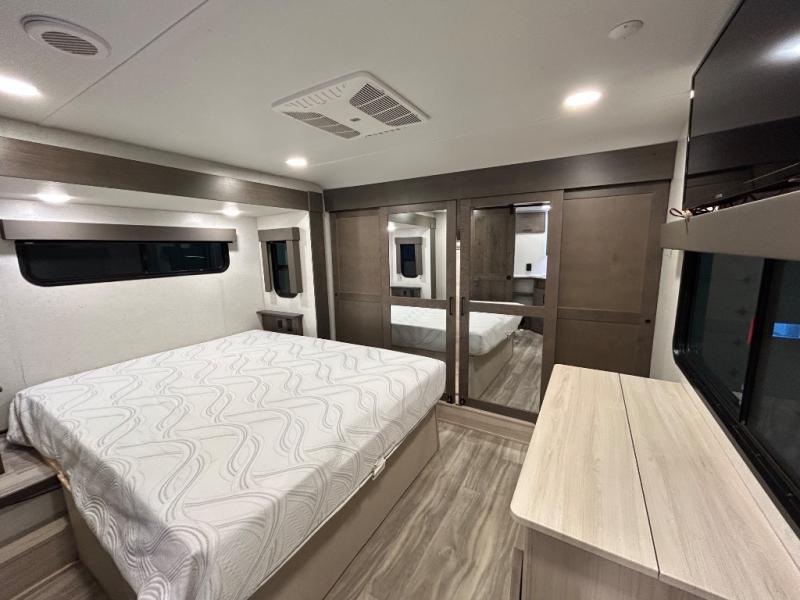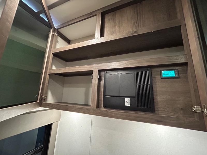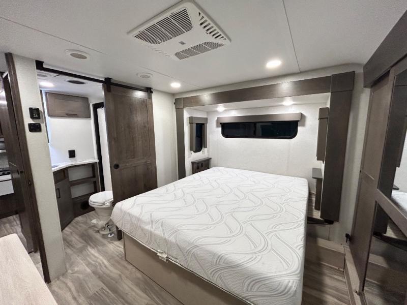 There is room for your off-road toys and the whole family in this toy hauler! The bath and a half makes life more convenient and the dual entry doors create a smooth flow of traffic in and out of the unit. Aside from 13' of garage space, an air compressor, and an entrance/exit door there are also opposing HappiJac sofas with a queen bed above them, a loft that opens to the living room, and a half bathroom. The chef can prepare their best meals with the four burner cooktop while two others sit at the flip up counter with two bar stools. After a fun day on the trails, wash up in the full bathroom with the 48" x 30" shower, grab your pajamas from the front wardrobe or flip top dresser in the front private bedroom then relax on one of the two sofas by the fireplace and Smart TV!