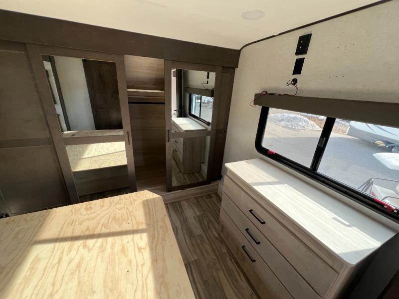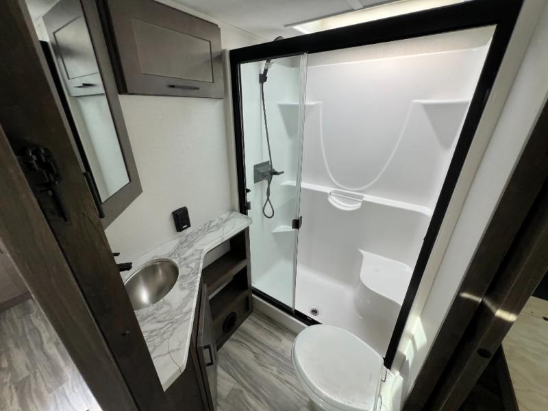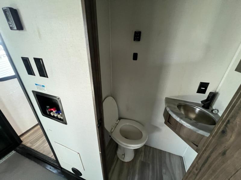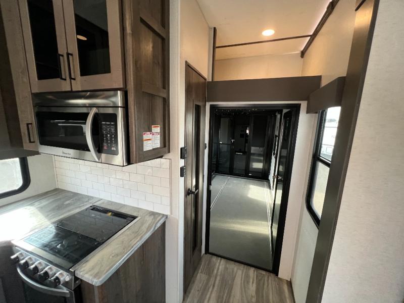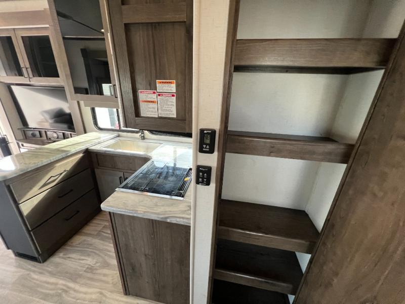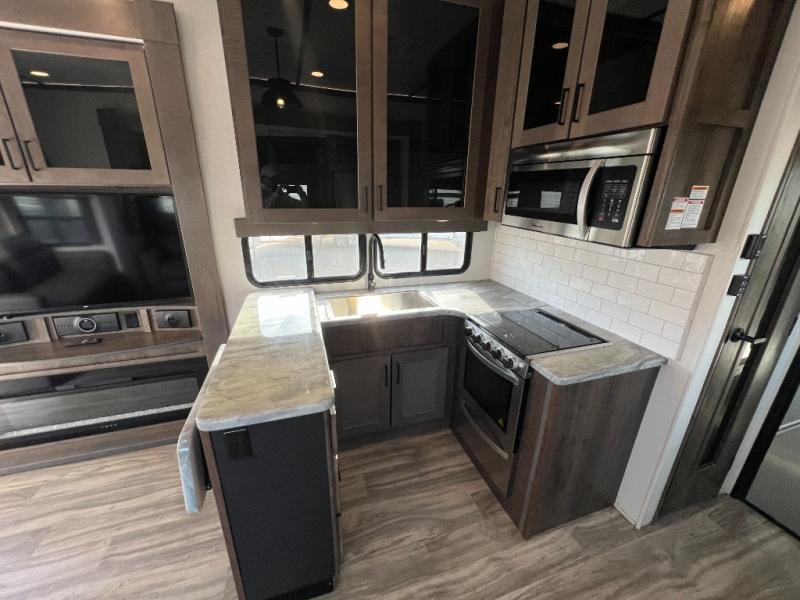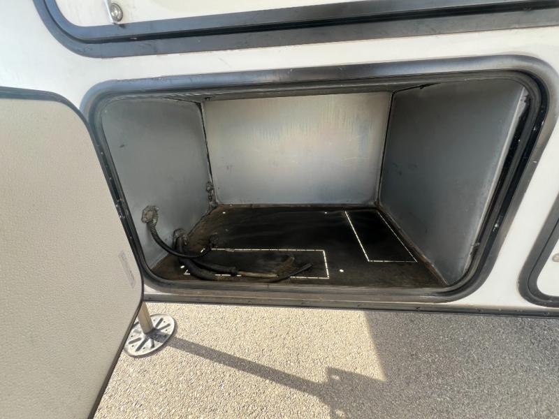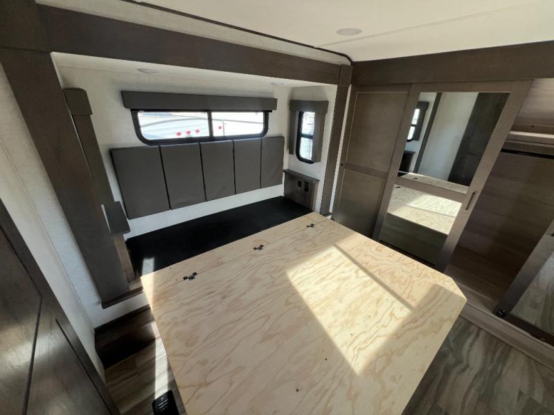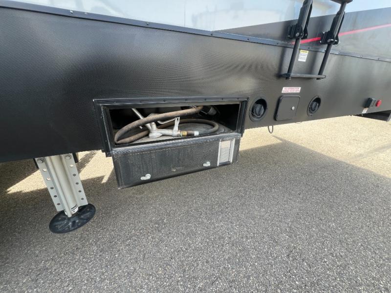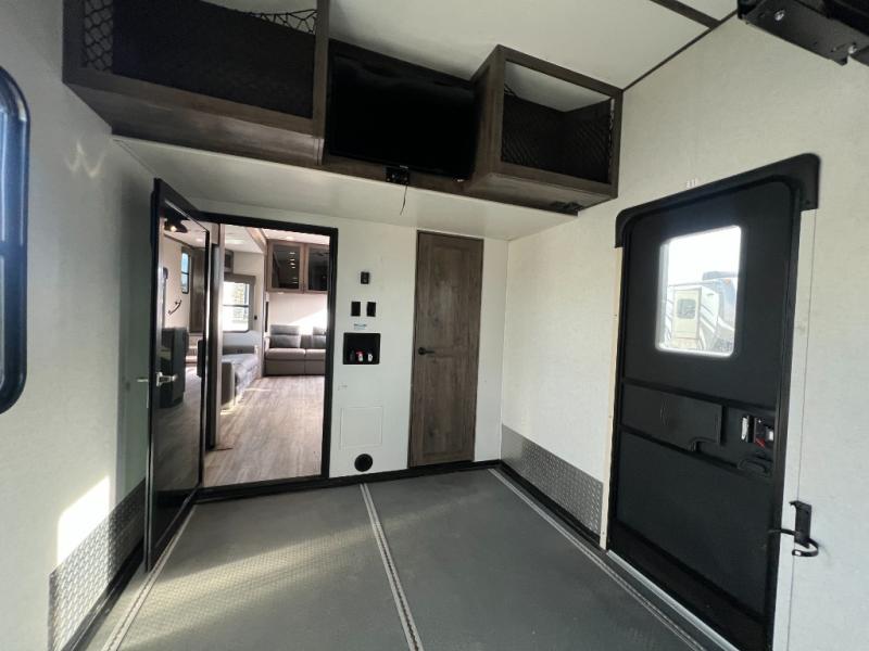 There is room for your off-road toys and the whole family in this toy hauler! The bath and a half makes life more convenient and the dual entry doors create a smooth flow of traffic in and out of the unit. Aside from 13' of garage space, an air compressor, and an entrance/exit door there are also opposing HappiJac sofas with a queen bed above them, a loft that opens to the living room, and a half bathroom. The chef can prepare their best meals with the four burner cooktop while two others sit at the flip up counter with two bar stools. After a fun day on the trails, wash up in the full bathroom with the 48" x 30" shower, grab your pajamas from the front wardrobe or flip top dresser in the front private bedroom then relax on one of the two sofas by the fireplace and Smart TV!