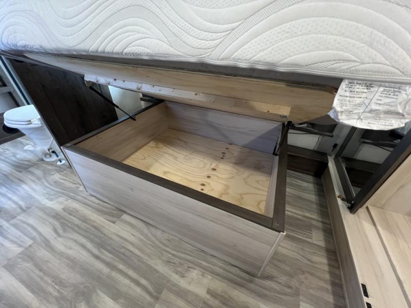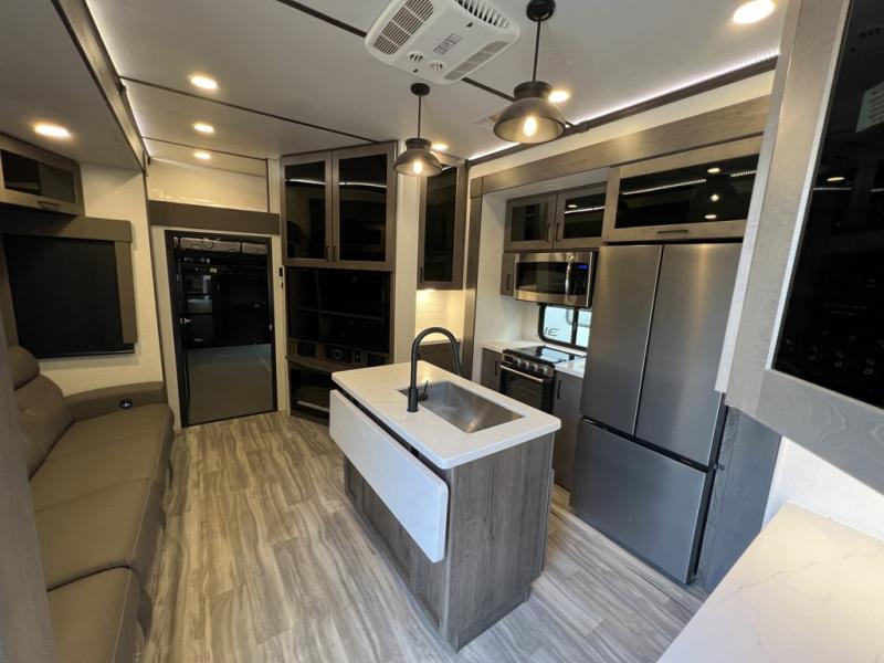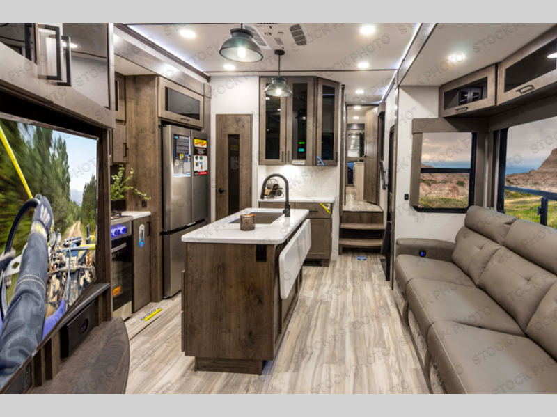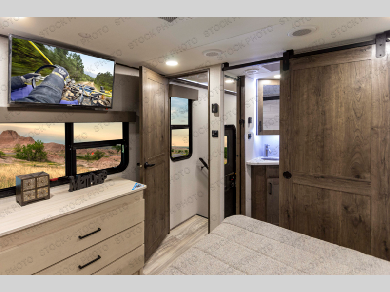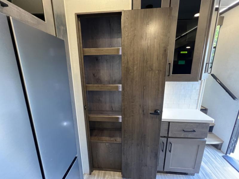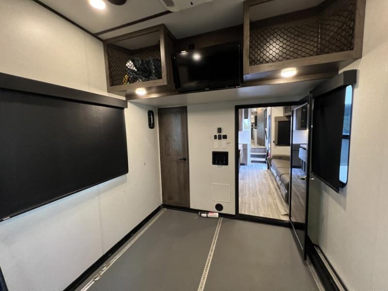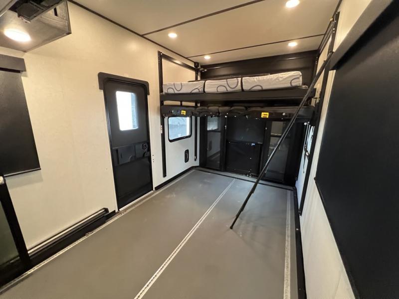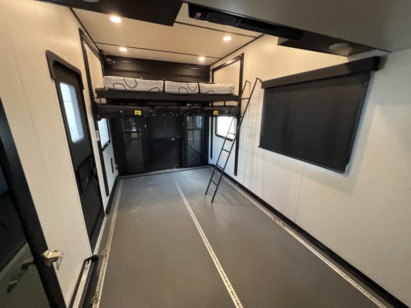 You can easily load up your toys into the 15' garage area of this toy hauler with the 8' weather resistant ramp door and keep them filled with the dual 30 gallon fuel tanks! Once you unload your toys from the garage area, you can set up the opposing HappiJac sofas with a queen mattress above them, the loft that open to the living room, and the half bathroom. The kitchen has everything you need to prepare your best meals including two hutches, three pantries, and a kitchen island with two bar stools to enjoy your morning coffee and eggs. The dual entry bathroom has a 48" x 30" shower and leads directly into the front private bedroom. Inside the bedroom is a king bed slide for more walking around space, a flip top dresser, and a front wardrobe that has an area prepped to add the optional washer and dryer.